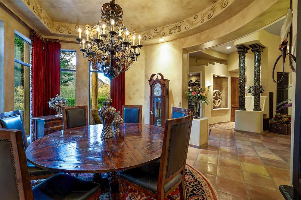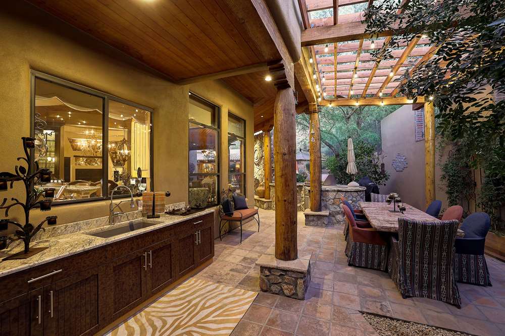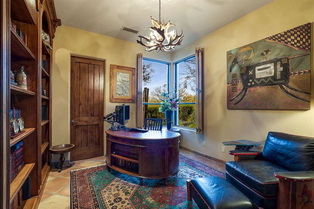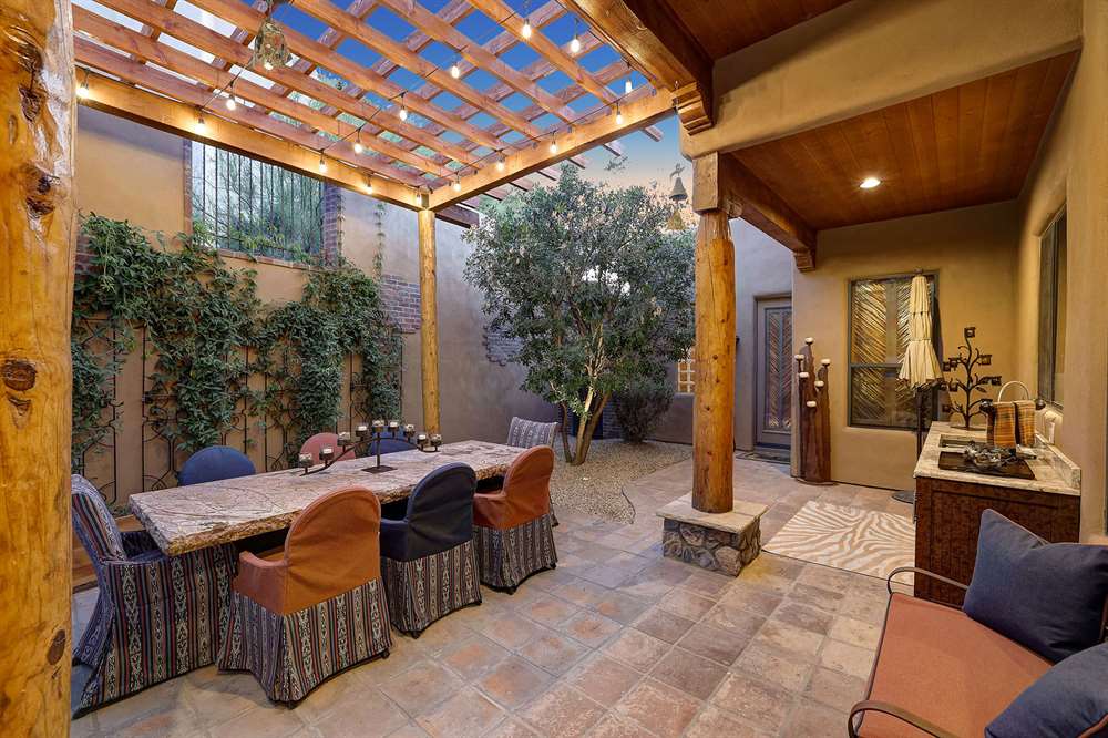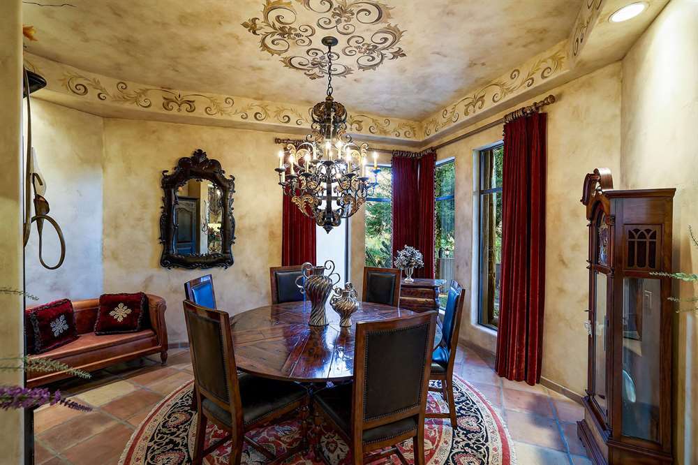 Other features include: 2020 roof replacement; three-car garage; cantera accents throughout; Saltillo tile; custom courtyard gate by Michael Jones; custom wall upholstery in guest room, den/office with furniture grade bookcases, artist designed and hand-painted ceiling in the dining room, southwest tile accents.