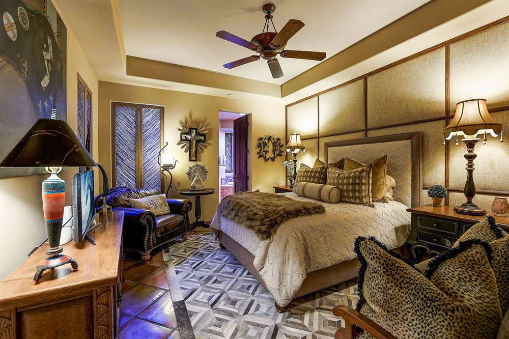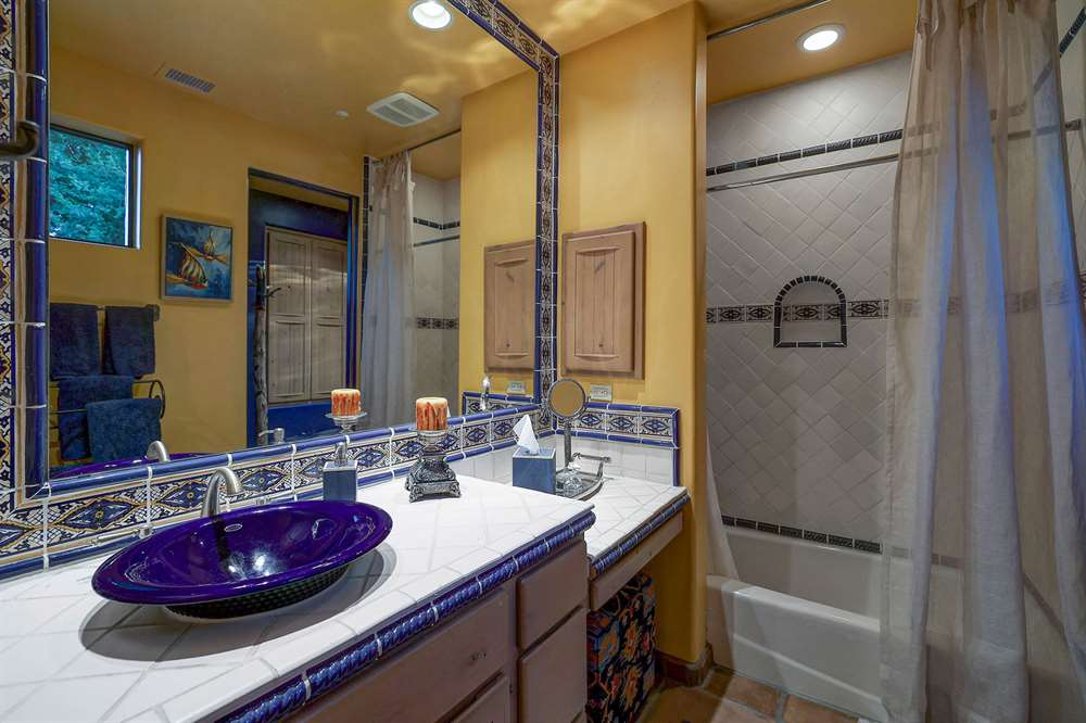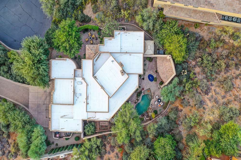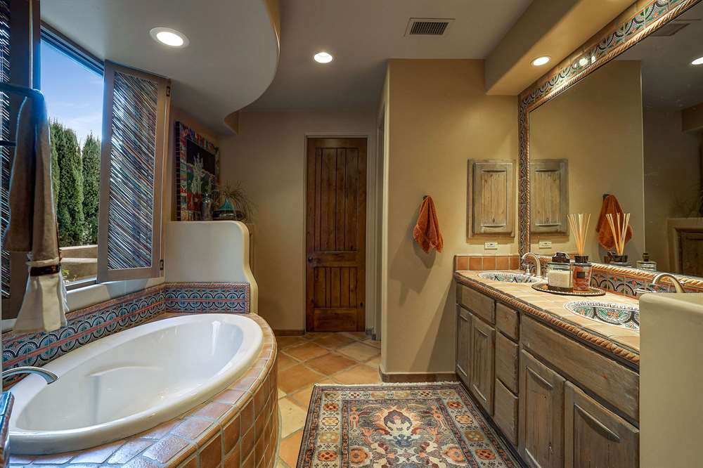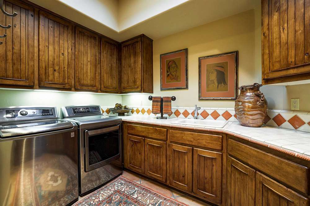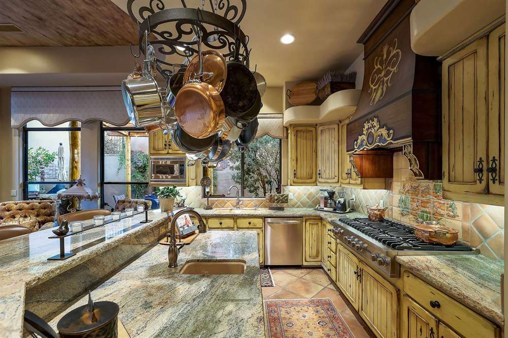 Other features include: 2020 roof replacement; three-car garage; cantera accents throughout; Saltillo tile; custom courtyard gate by Michael Jones; custom wall upholstery in guest room, den/office with furniture grade bookcases, artist designed and hand-painted ceiling in the dining room, southwest tile accents.