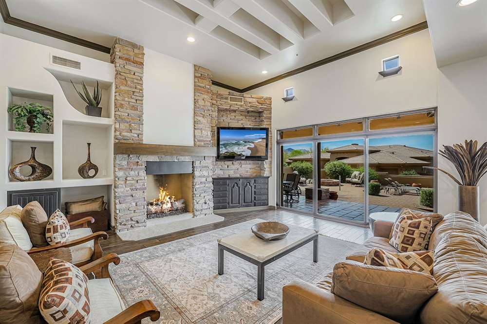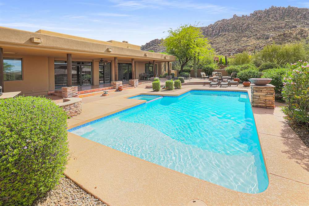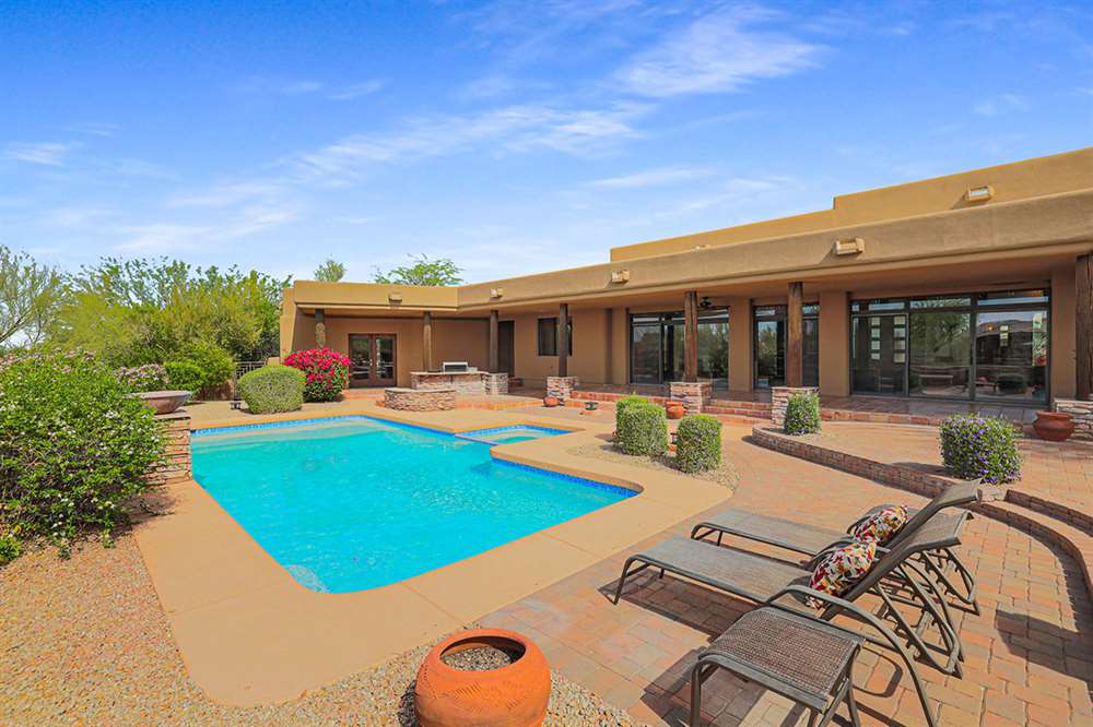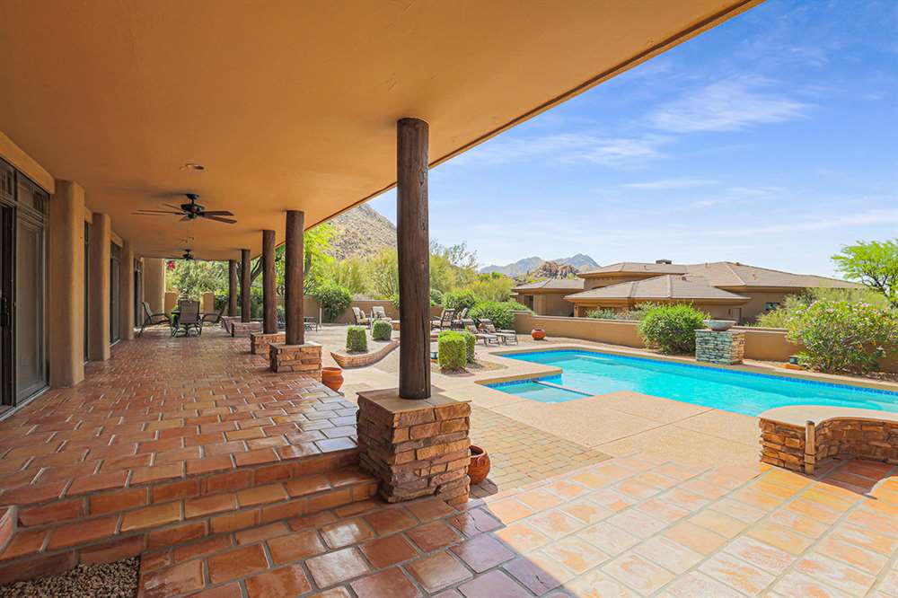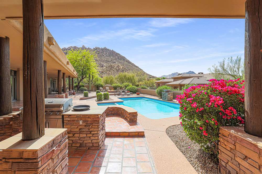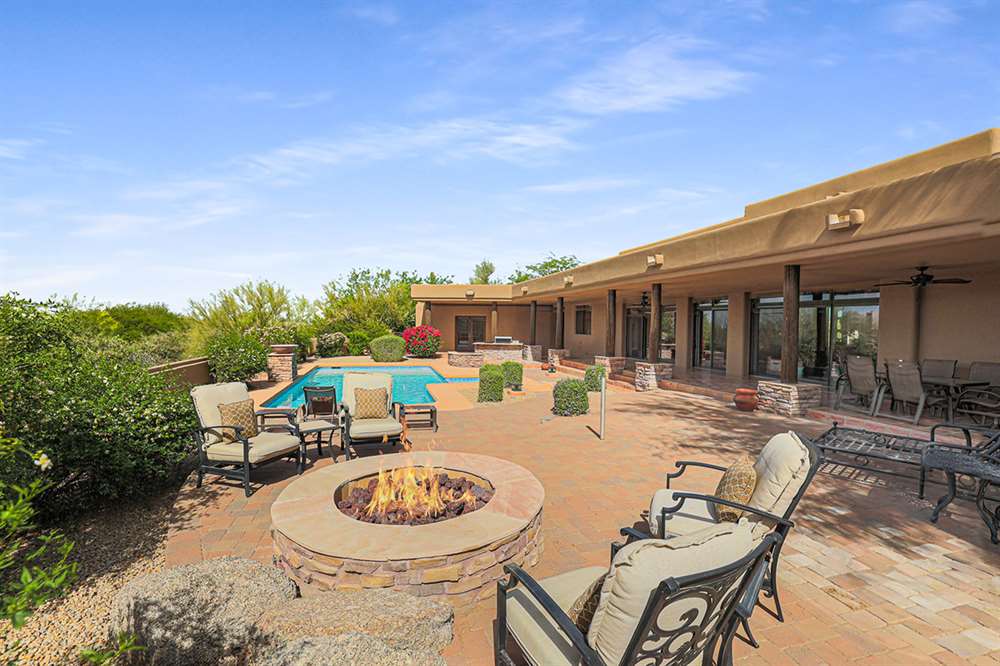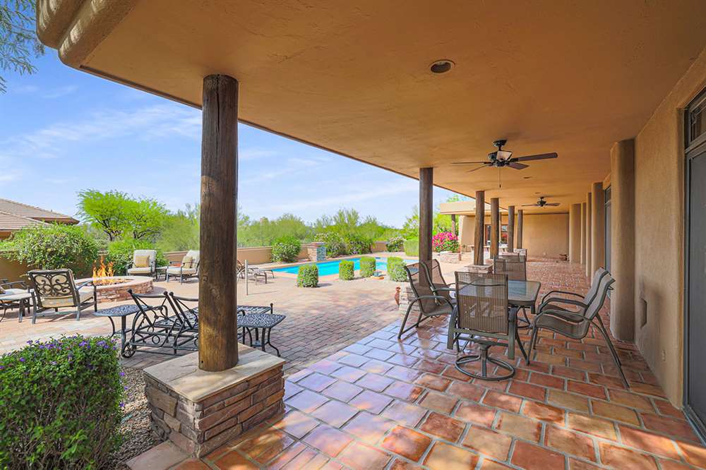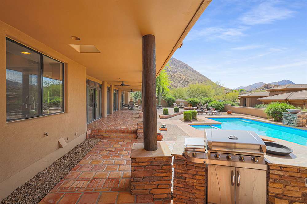 The large covered patio runs the length of the home creating multiple seating areas overlooking the recently resurfaced pool with Baja shelf and spa, Saltillo and paver hardscape, built-in barbecue, fire pit, low maintenance landscaping, and direct views of Troon Mountain. Other features and upgrades include: roof recoated, central vac, three car garage with epoxy floors and storage, wet bar, some windows replaced, gas cooktop, side entry garage and half circle drive, and so much more! Most furnishings available by separate bill of sale.