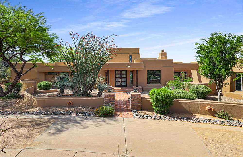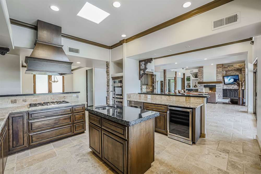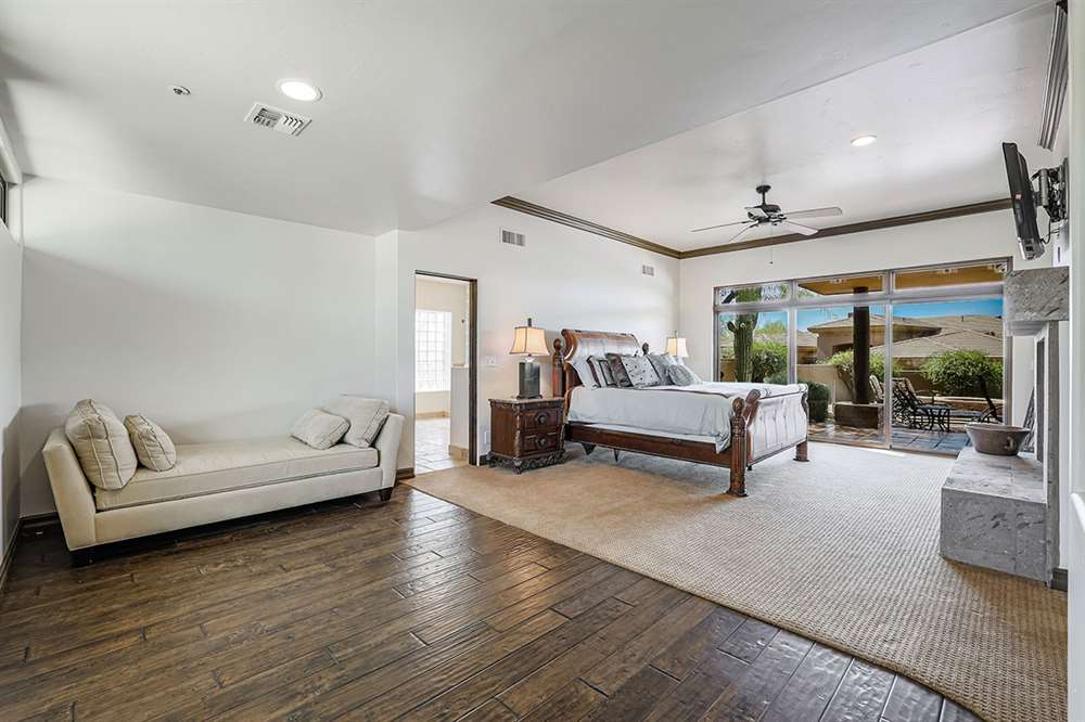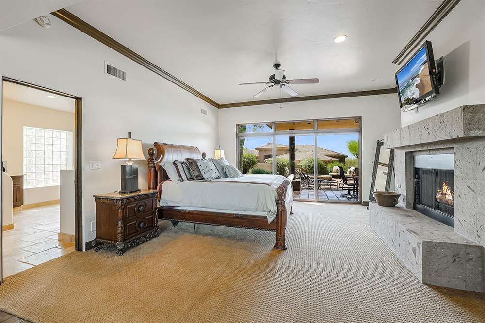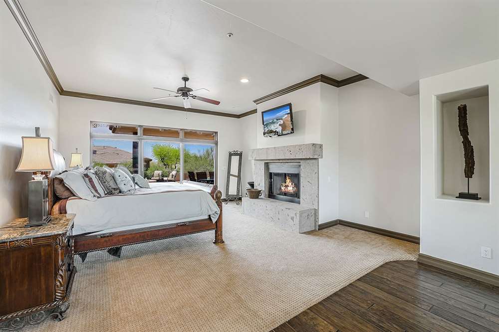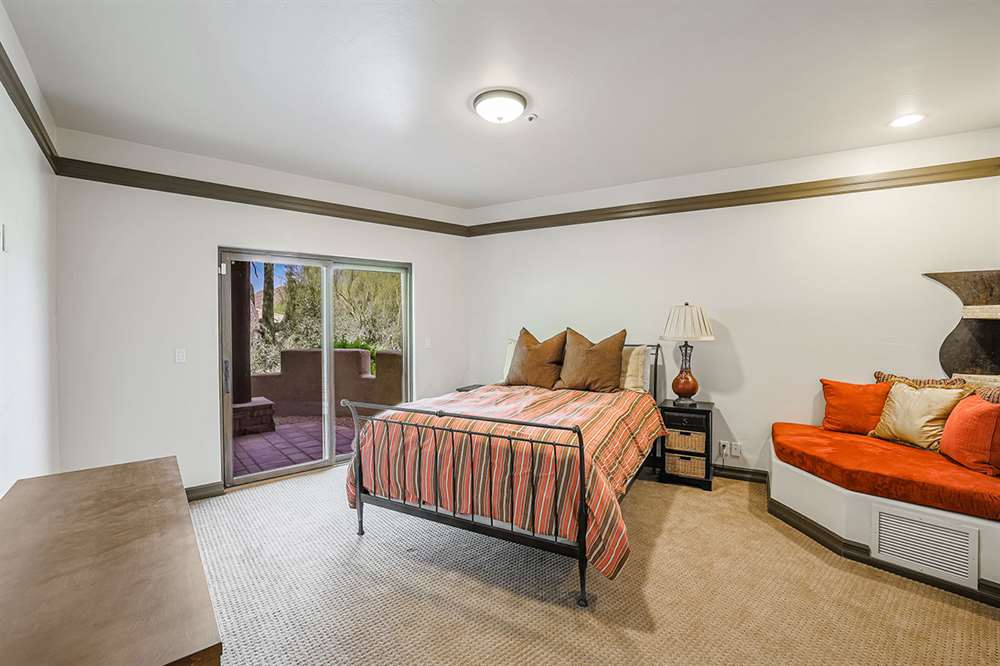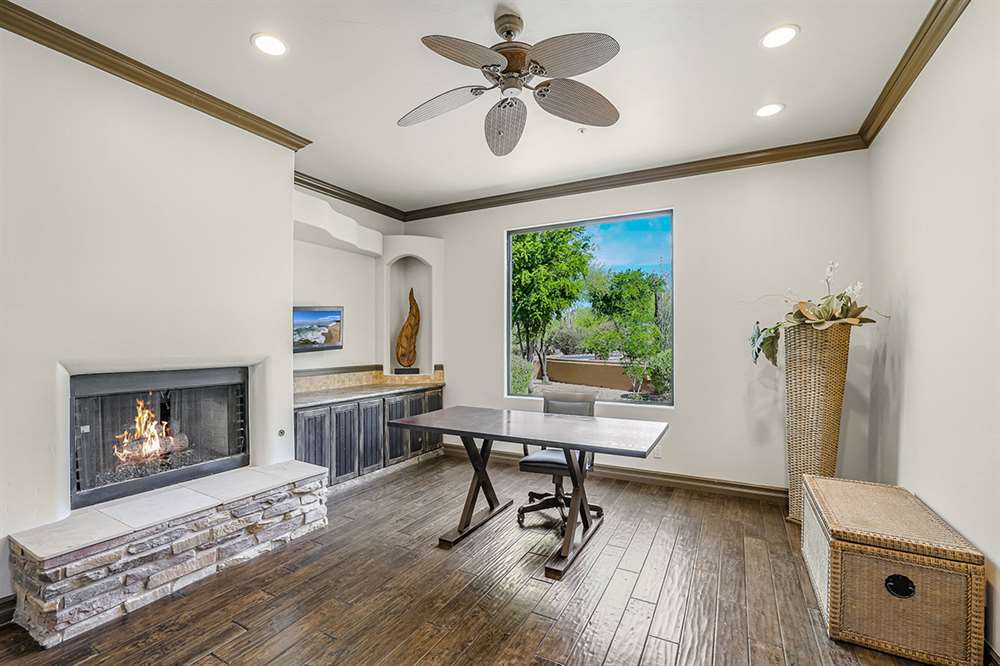 The master has a dedicated wing with a sitting area, fireplace (one of four throughout the property), direct access to the exterior, and a large ensuite with dual sinks, walk-in shower, soaking tub, built-in coffee maker, private water closet, and an oversized closet with center drawer island. The other wing of the home features two additional guest bedrooms sharing a hall bath and each with a private patio. The heart of the home showcases walls of windows and doors to take in the backyard views with a great room feel of the living, breakfast area and kitchen all open to each other. A private office and a formal dining with exterior patio access for entertaining round out the heart of the home. A separate entry casita has exterior backyard access, a kitchenette, seating area and attached bath. Richly stained wood trim and cabinetry, hardwood and tumbled travertine flooring, smooth neutral colored walls, stacked stone accents add character throughout.