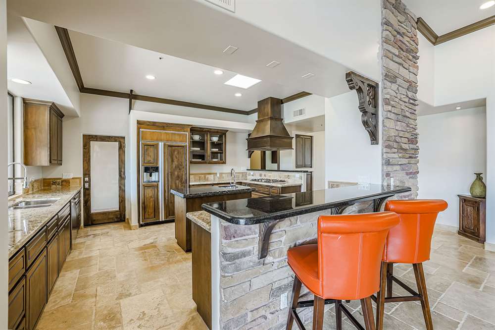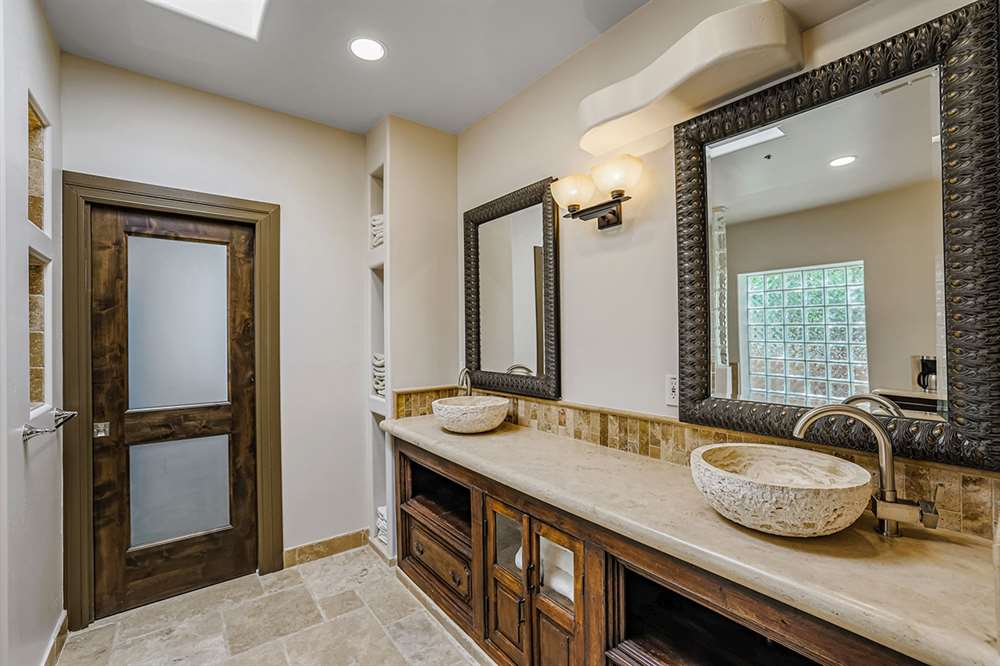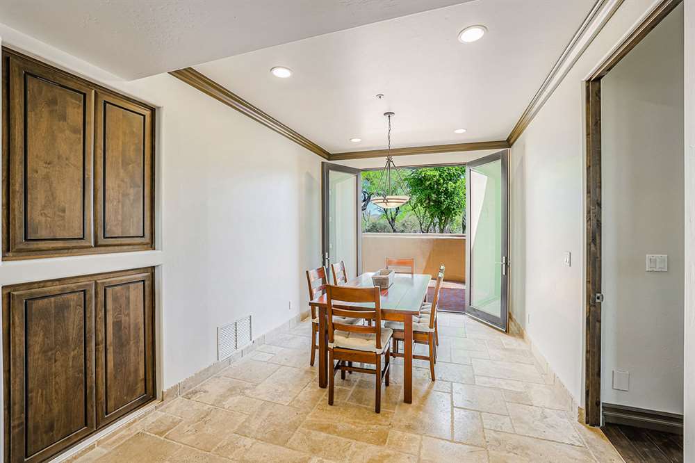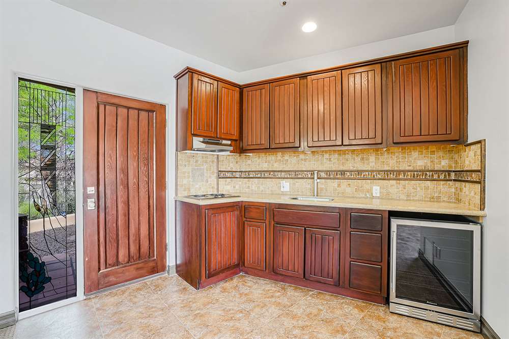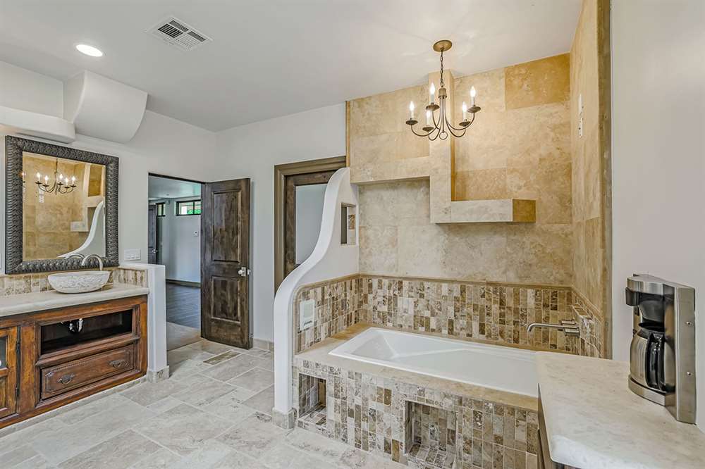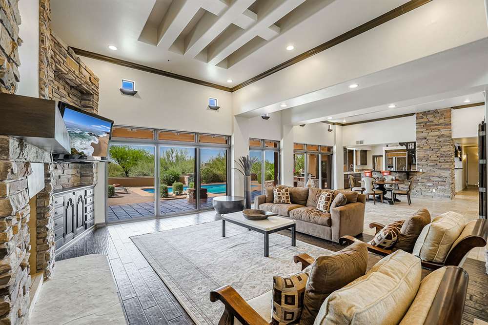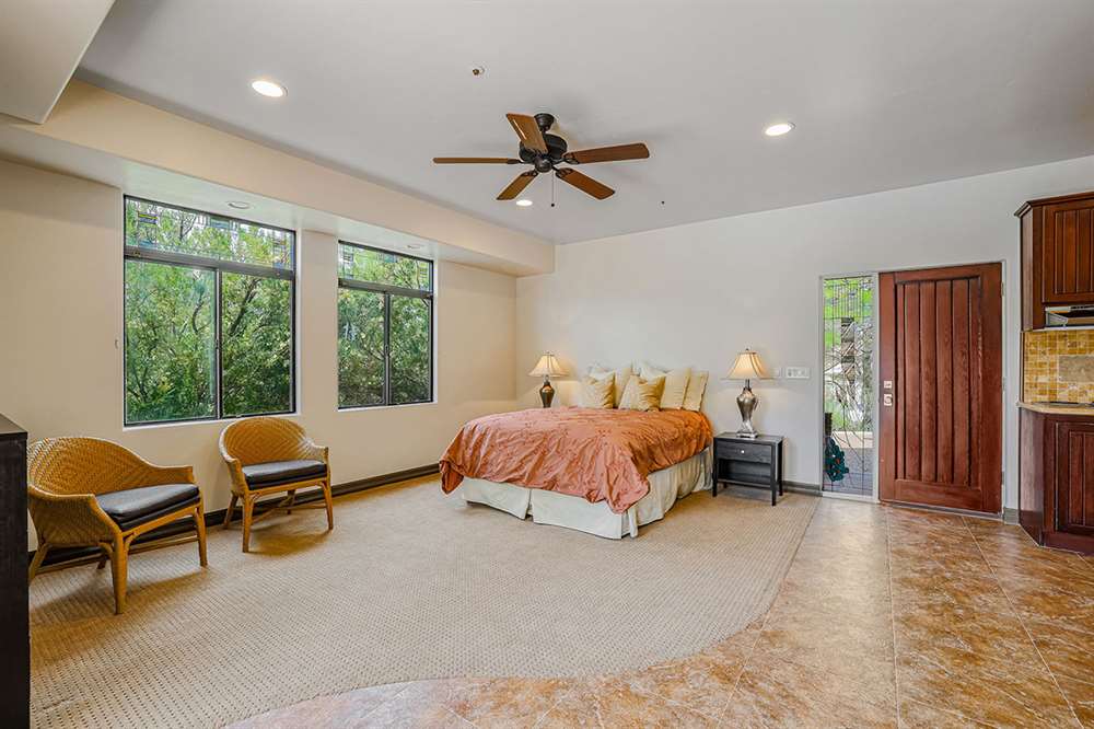 The master has a dedicated wing with a sitting area, fireplace (one of four throughout the property), direct access to the exterior, and a large ensuite with dual sinks, walk-in shower, soaking tub, built-in coffee maker, private water closet, and an oversized closet with center drawer island. The other wing of the home features two additional guest bedrooms sharing a hall bath and each with a private patio. The heart of the home showcases walls of windows and doors to take in the backyard views with a great room feel of the living, breakfast area and kitchen all open to each other. A private office and a formal dining with exterior patio access for entertaining round out the heart of the home. A separate entry casita has exterior backyard access, a kitchenette, seating area and attached bath. Richly stained wood trim and cabinetry, hardwood and tumbled travertine flooring, smooth neutral colored walls, stacked stone accents add character throughout.