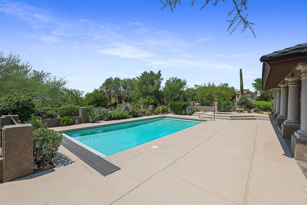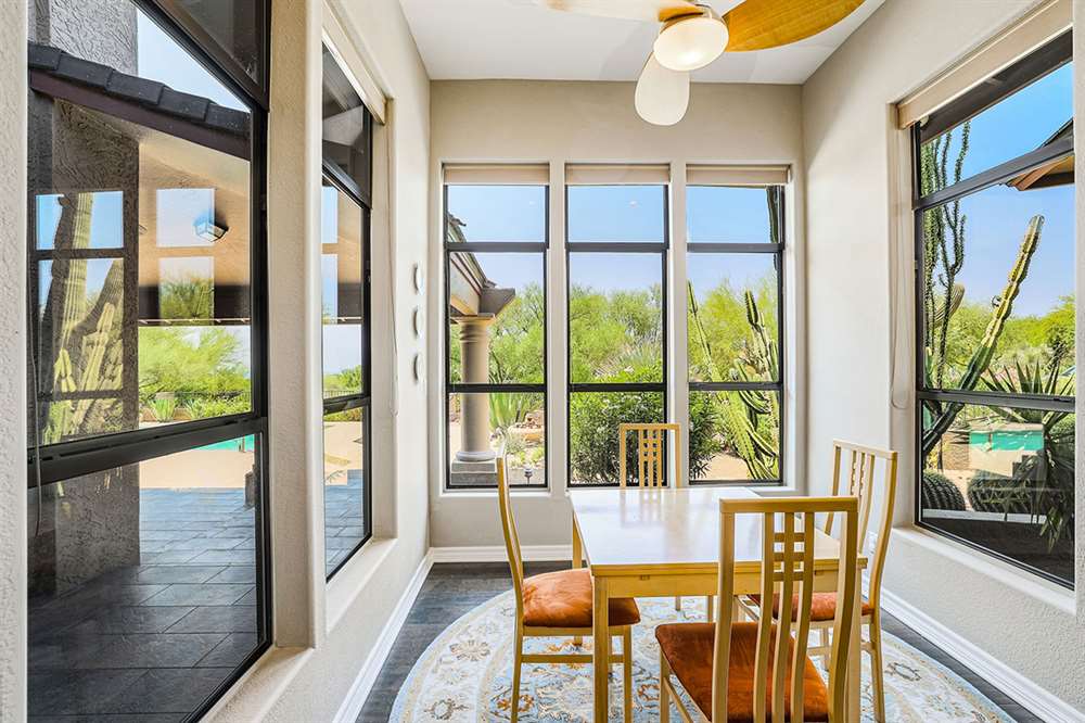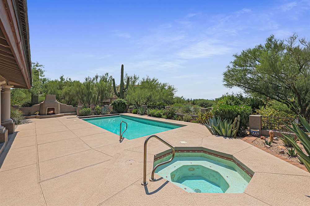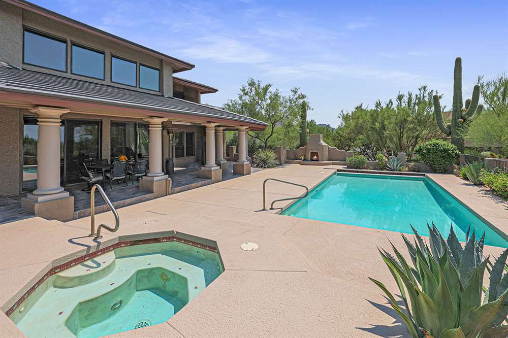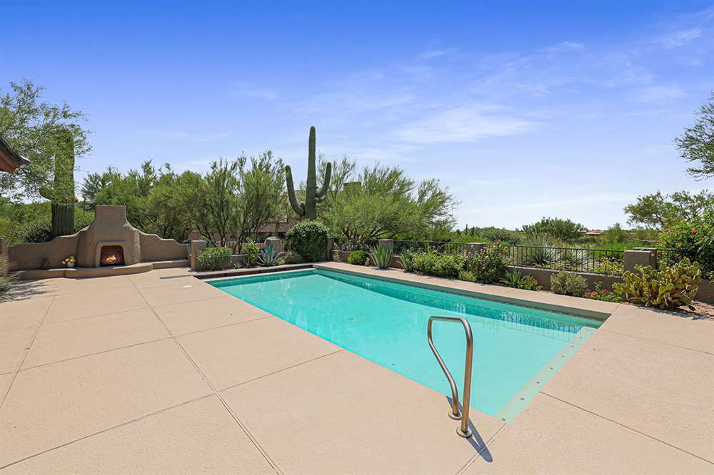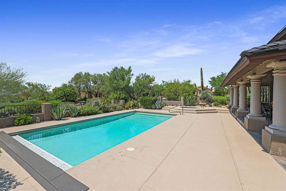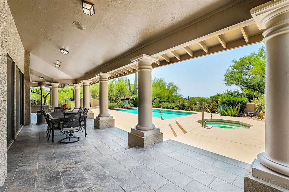Take note of the soaring covered entry patio as you enter the foyer and overlook Troon Mountain from the floor to ceiling windows in the formal dining room. Richly stained wood and cool travertine floors can be found throughout along with a neutral paint palette. The kitchen overlooks the family room with a centerpiece fireplace and features stainless steel appliances, granite counters, a breakfast nook, and overlooks the backyard with sparkling pool and spa. The outside also features a large covered patio, gas fireplace, and a private yard off the dining room for entertaining.