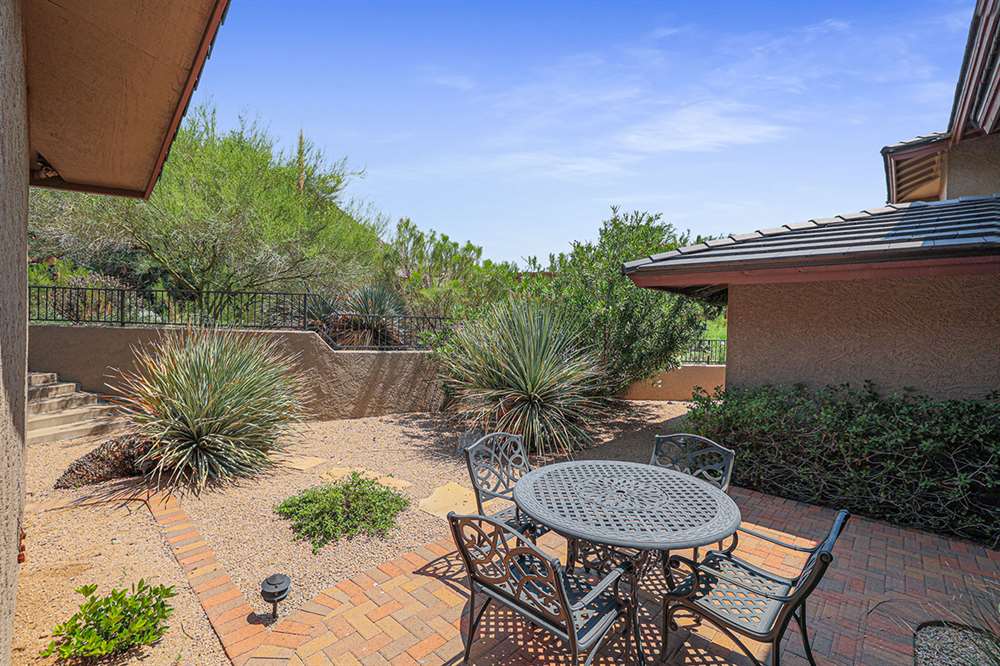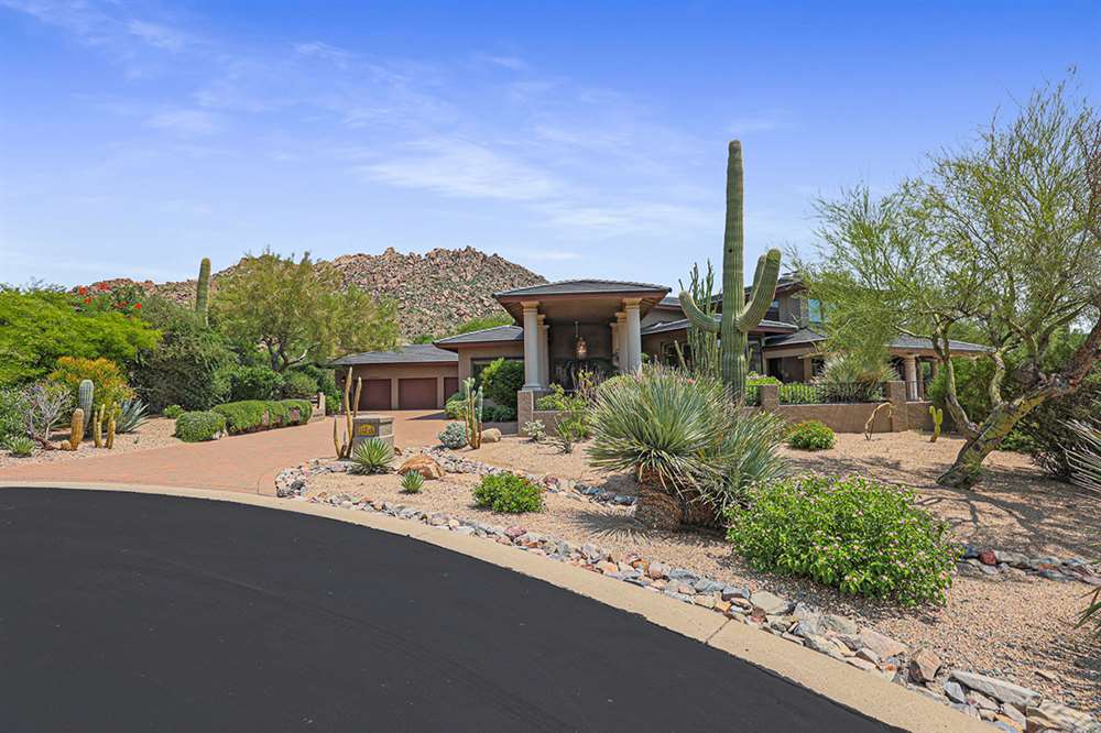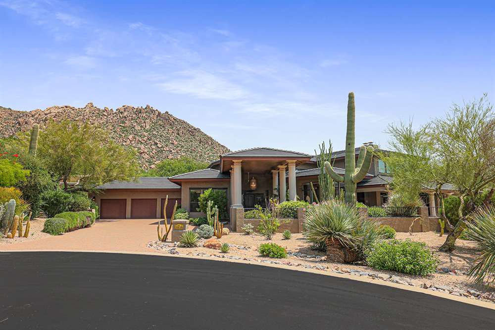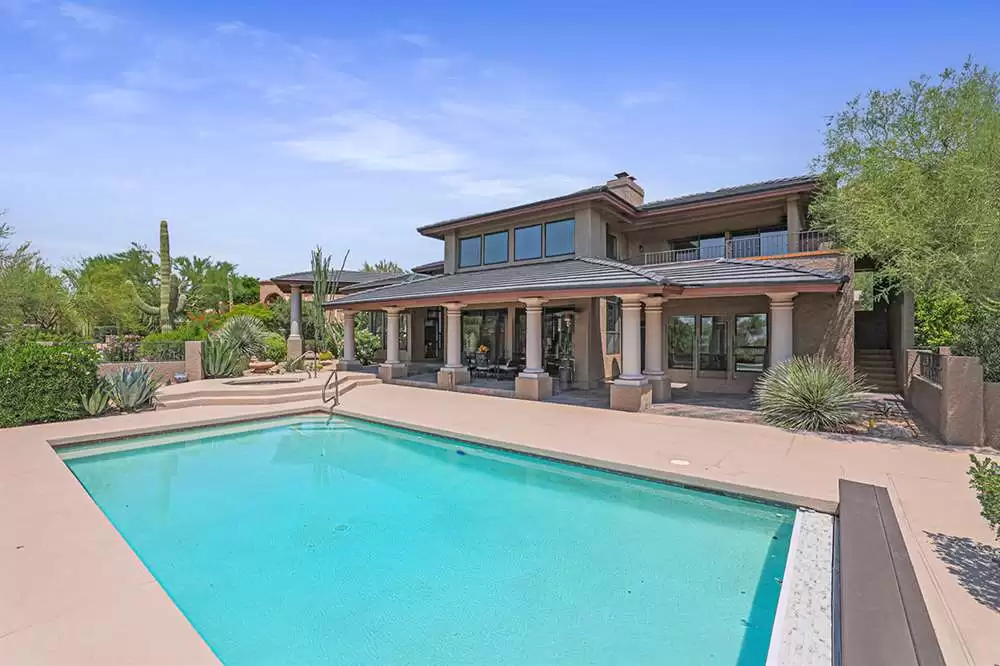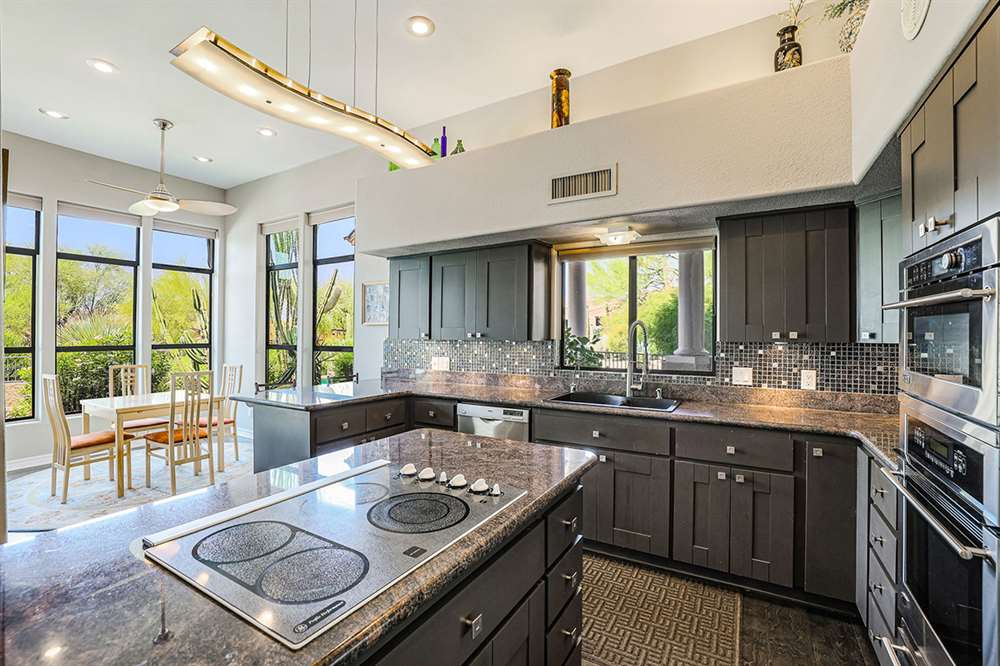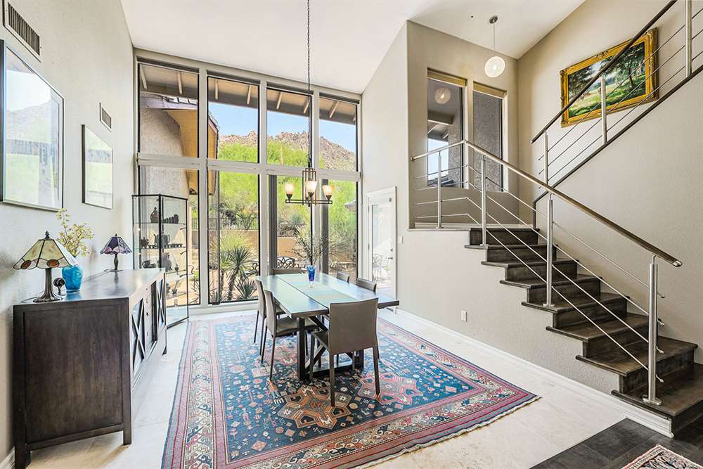 Take note of the soaring covered entry patio as you enter the foyer and overlook Troon Mountain from the floor to ceiling windows in the formal dining room. Richly stained wood and cool travertine floors can be found throughout along with a neutral paint palette. The kitchen overlooks the family room with a centerpiece fireplace and features stainless steel appliances, granite counters, a breakfast nook, and overlooks the backyard with sparkling pool and spa. The outside also features a large covered patio, gas fireplace, and a private yard off the dining room for entertaining.