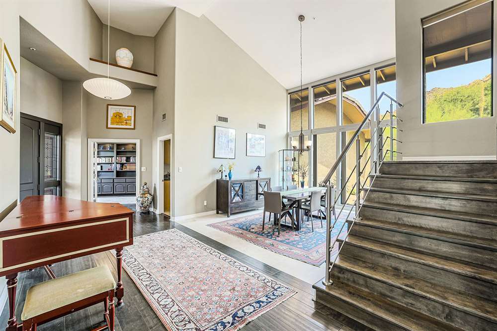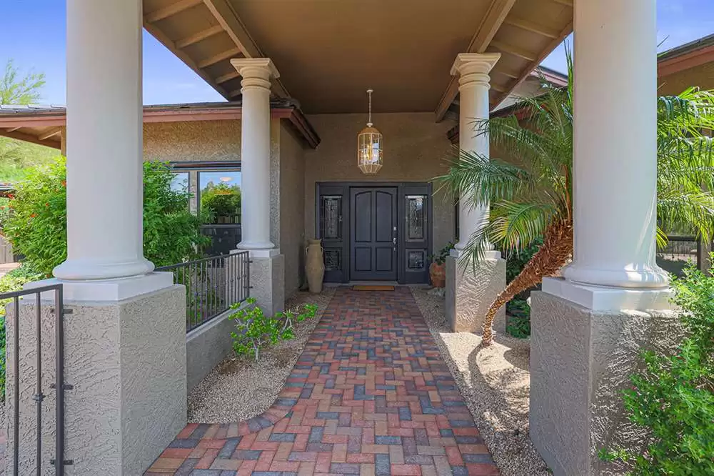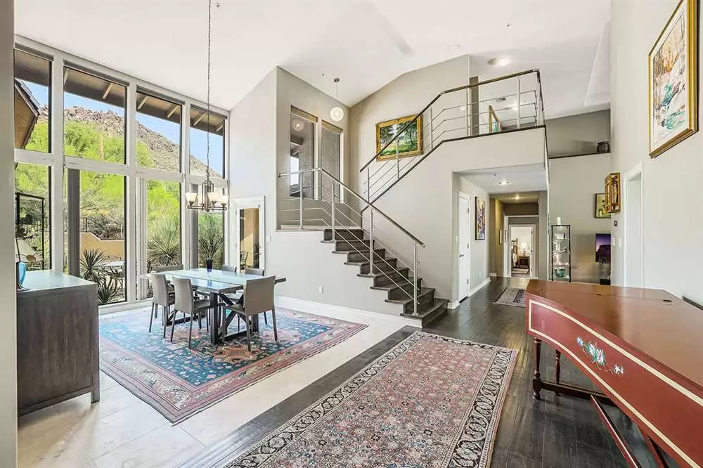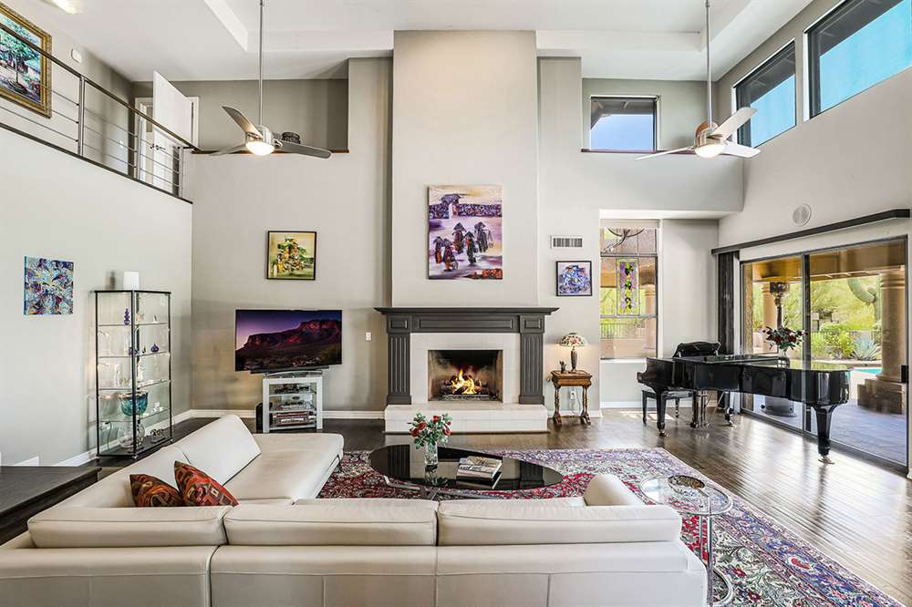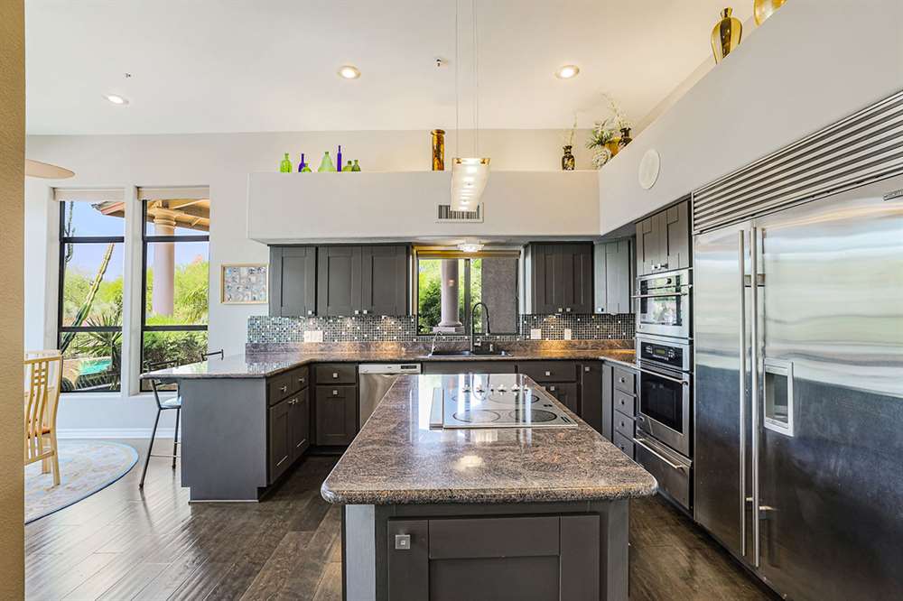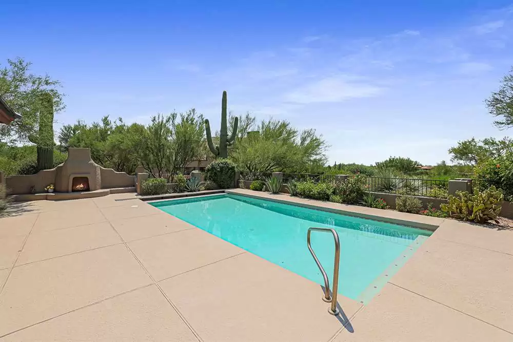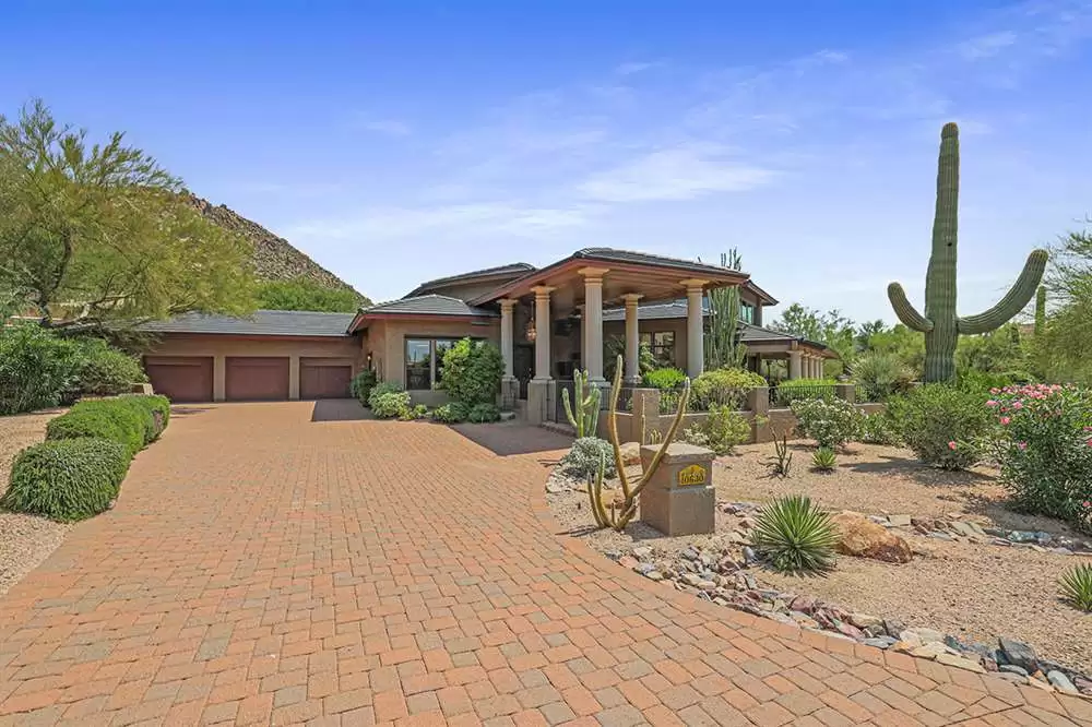 Take note of the soaring covered entry patio as you enter the foyer and overlook Troon Mountain from the floor to ceiling windows in the formal dining room. Richly stained wood and cool travertine floors can be found throughout along with a neutral paint palette. The kitchen overlooks the family room with a centerpiece fireplace and features stainless steel appliances, granite counters, a breakfast nook, and overlooks the backyard with sparkling pool and spa. The outside also features a large covered patio, gas fireplace, and a private yard off the dining room for entertaining.