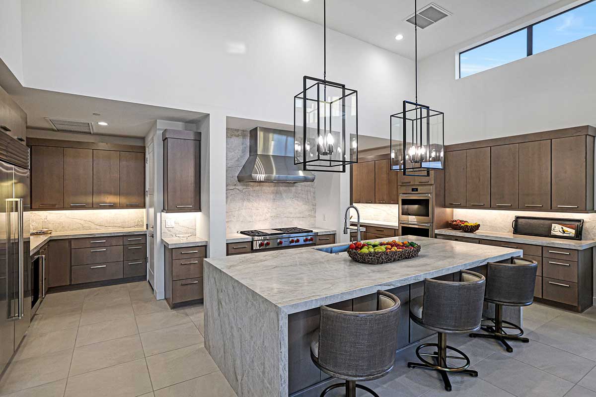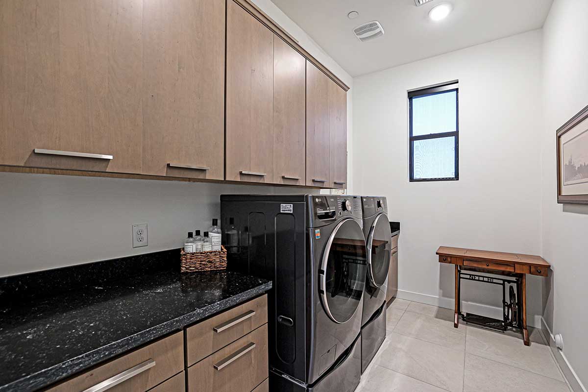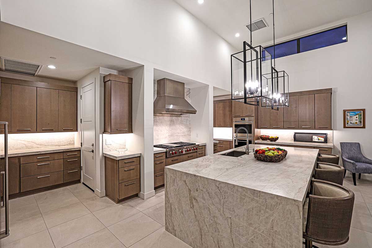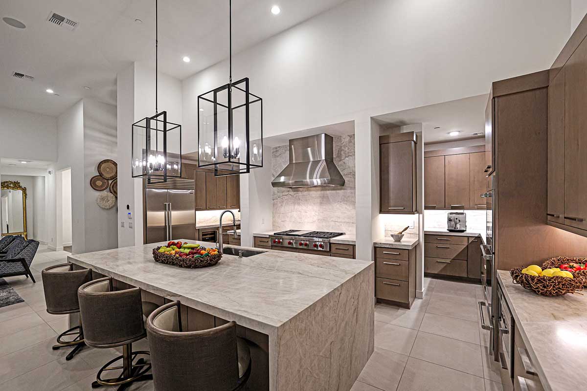 Back inside the home enjoy the upgraded doors, upgraded door and cabinetry hardware, luxury interior lighting, and Alder wood cabinets found throughout. The kitchen is a statement piece with waterfall edge Taj Mahal counters, smooth panel cabinets with full overlay doors, crown and light rail, and two recessed open pantries for modern living. Kitchen appliances are Wolf stainless steel including 6-burner range with griddle, double wall oven, warming drawer, built-in microwave, dishwasher and wine cooler/fridge.