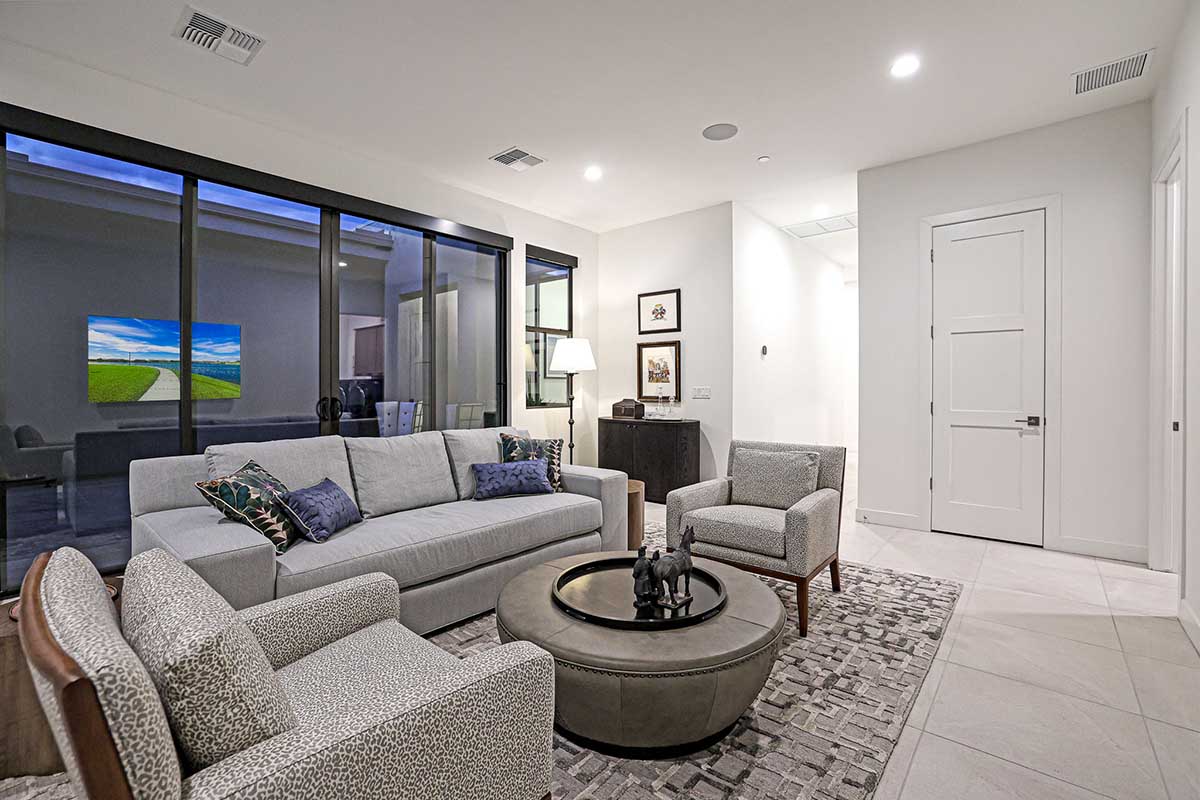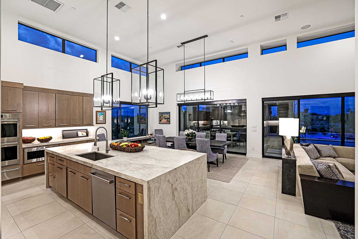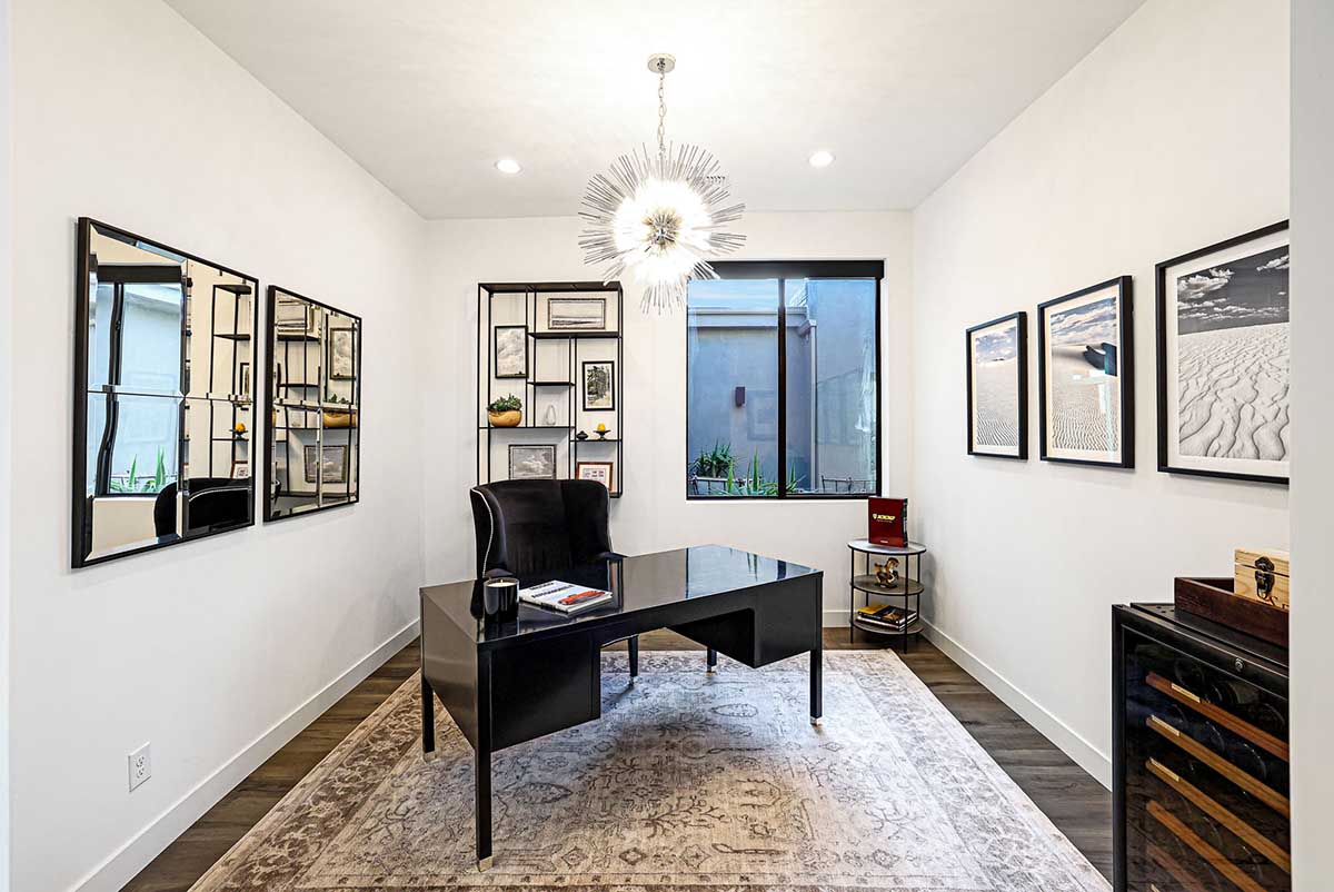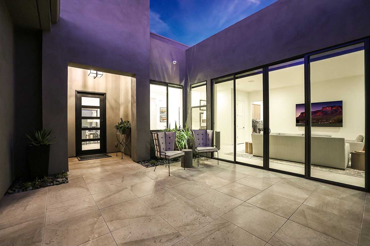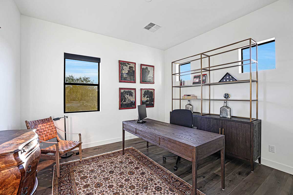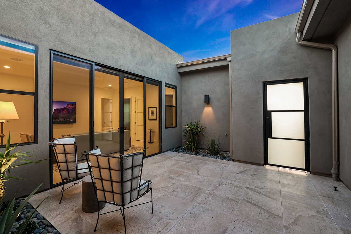 The kitchen is open to the large family room and dining spaces with clerestory windows for natural lighting, double multi-pocketing doors, and a 60” Mezzo fireplace with tile surround stretching to the ceiling and designed to heat the room for wonderful ambiance. A private den is adjacent to the great room and overlooks the gated front courtyard.