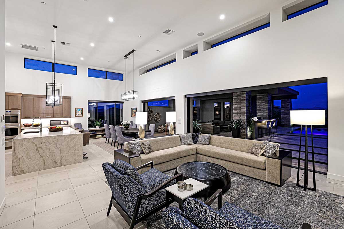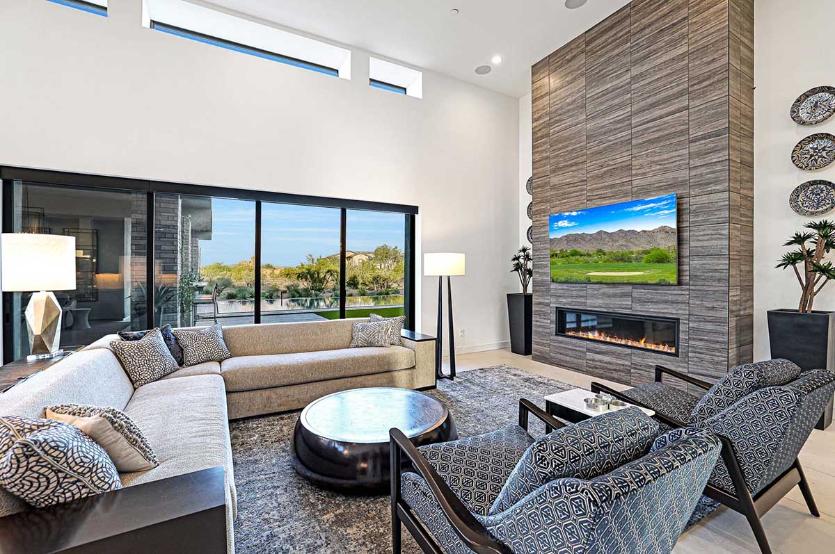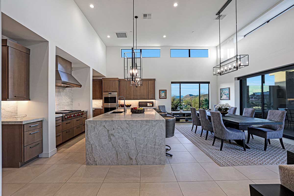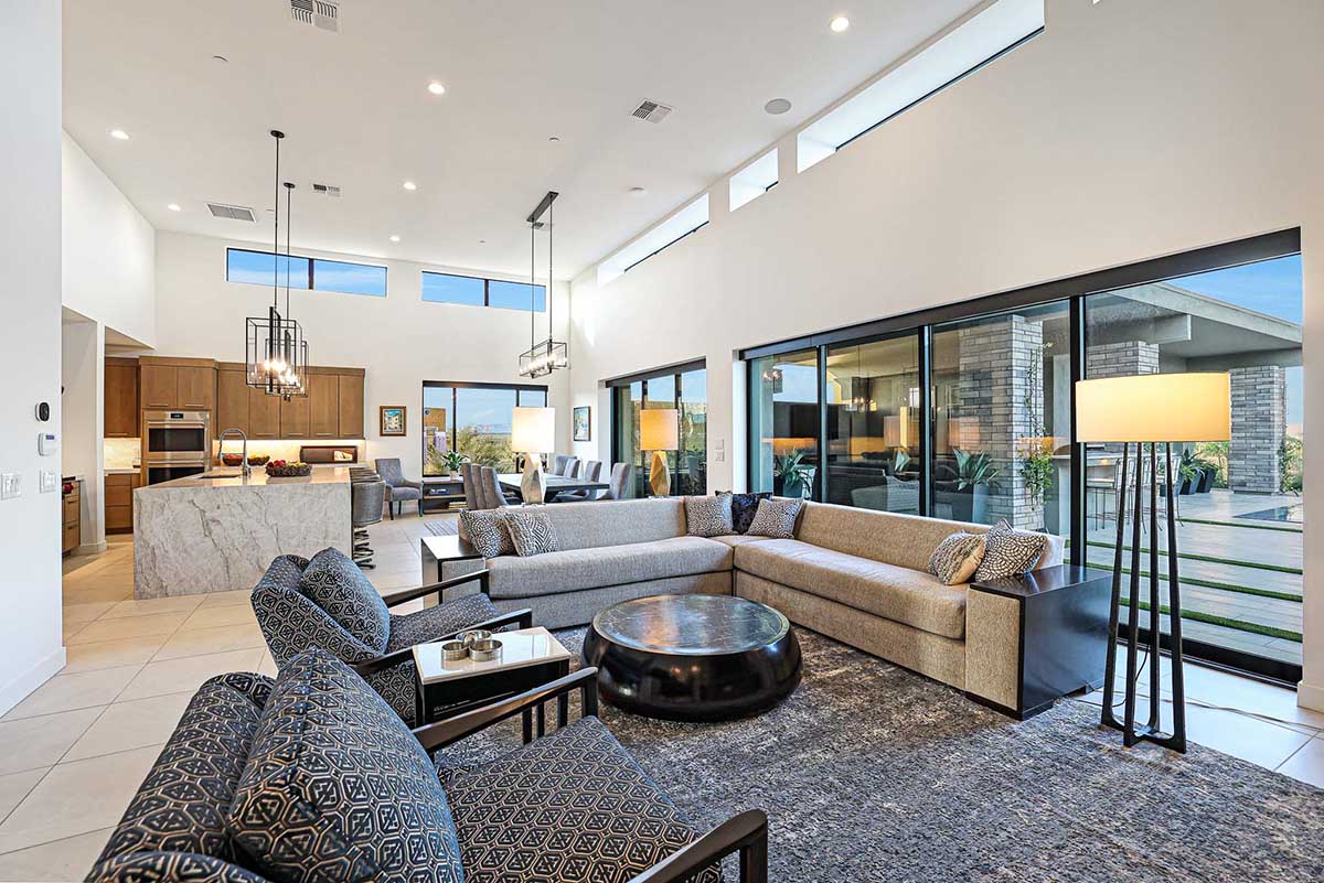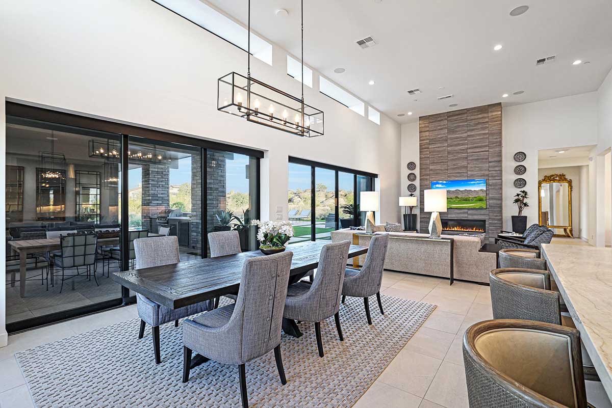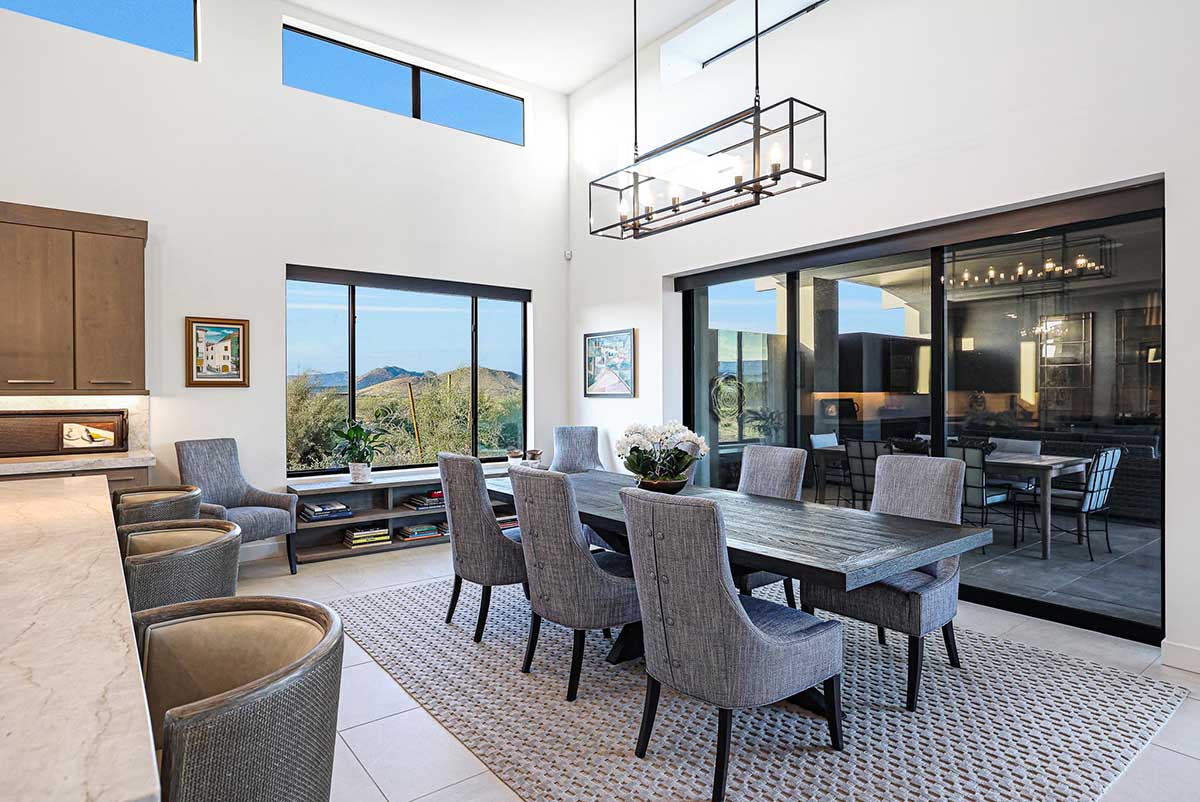 The kitchen is open to the large family room and dining spaces with clerestory windows for natural lighting, double multi-pocketing doors, and a 60” Mezzo fireplace with tile surround stretching to the ceiling and designed to heat the room for wonderful ambiance. A private den is adjacent to the great room and overlooks the gated front courtyard.