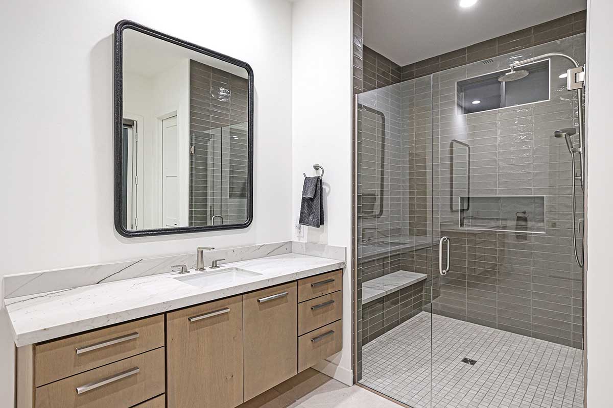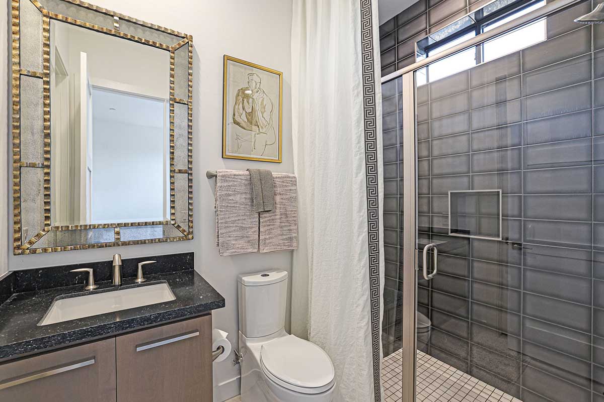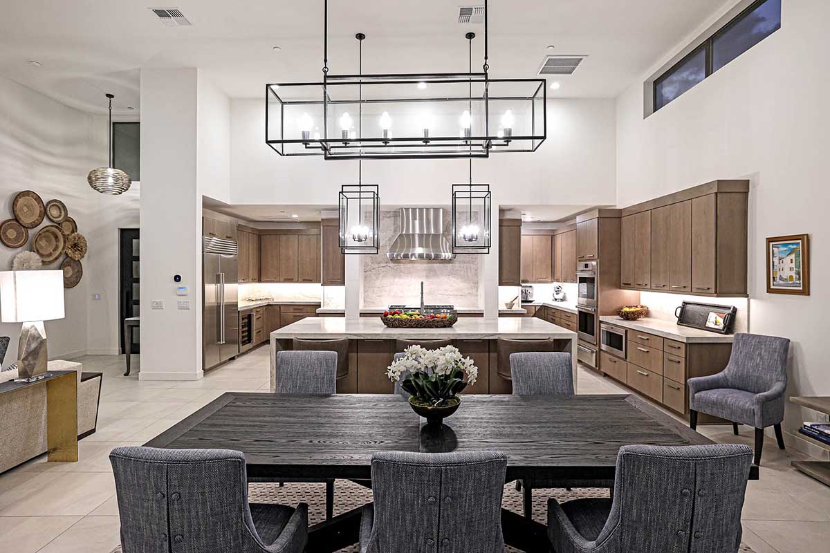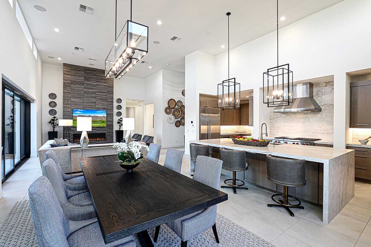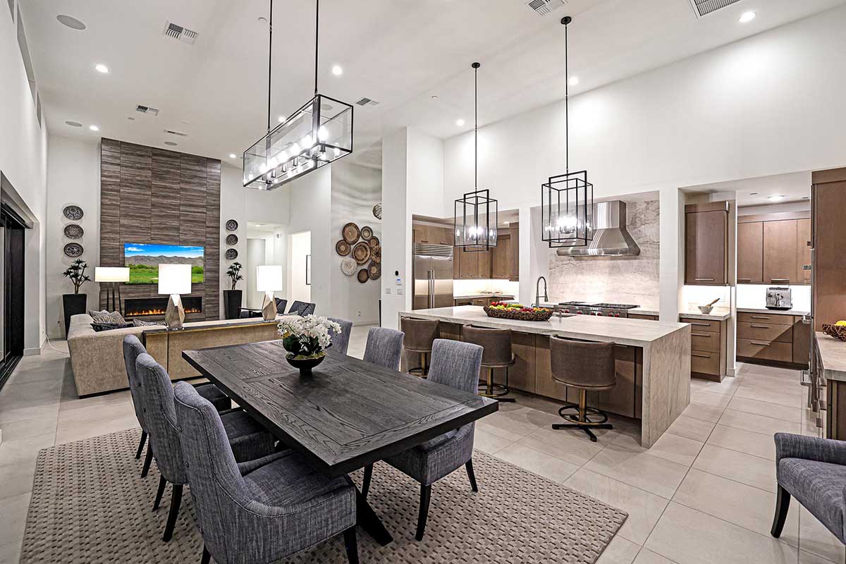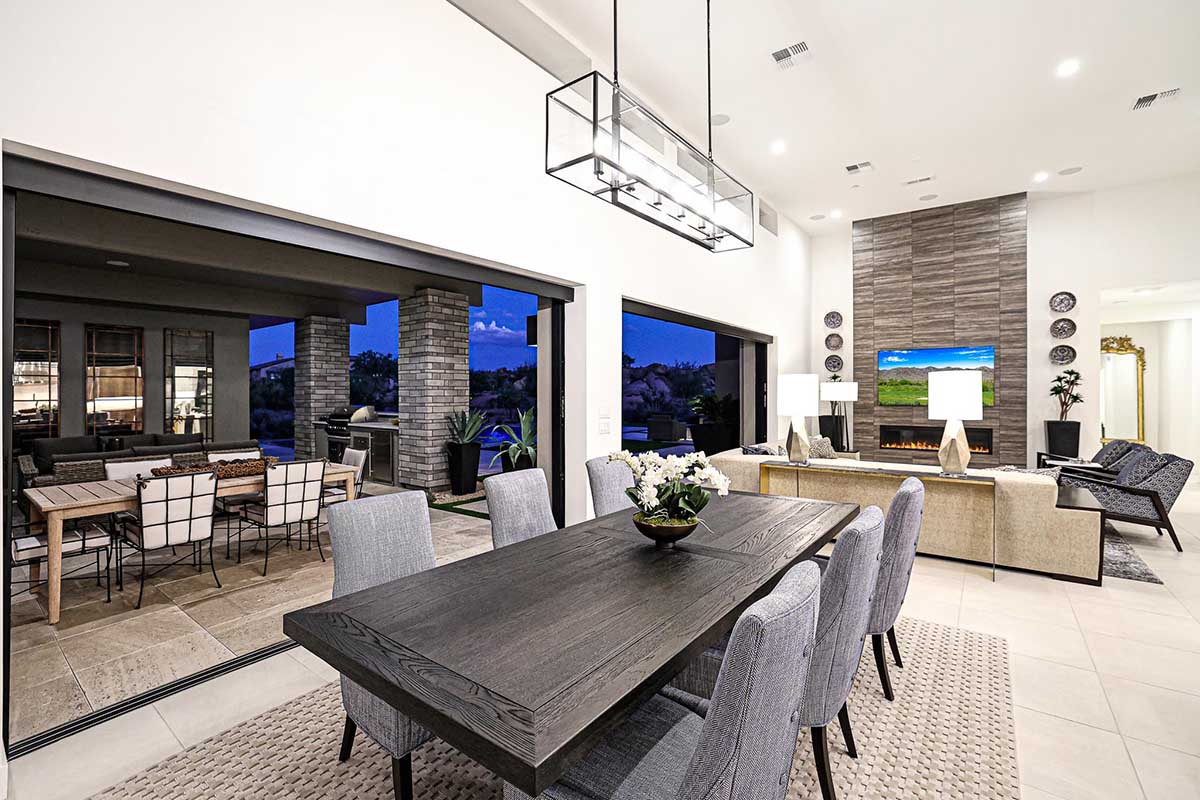 The kitchen is open to the large family room and dining spaces with clerestory windows for natural lighting, double multi-pocketing doors, and a 60” Mezzo fireplace with tile surround stretching to the ceiling and designed to heat the room for wonderful ambiance. A private den is adjacent to the great room and overlooks the gated front courtyard.