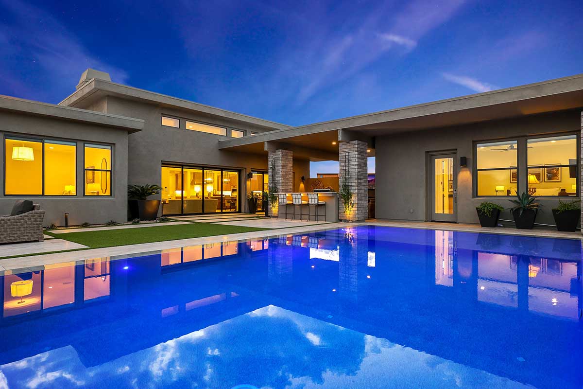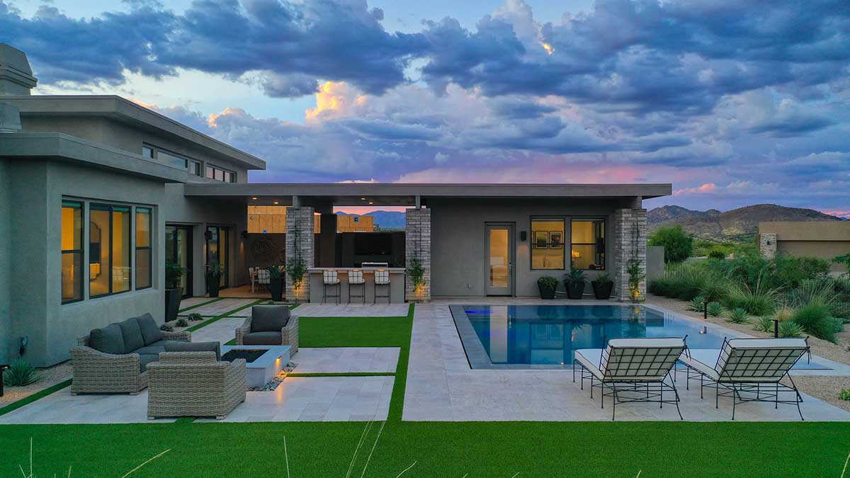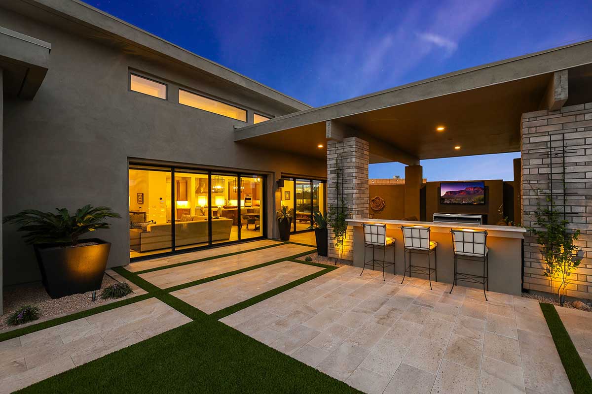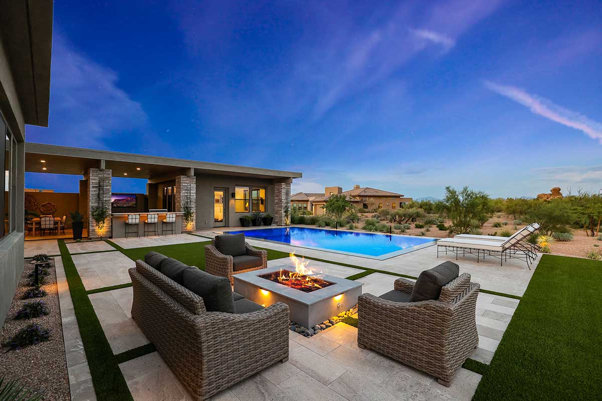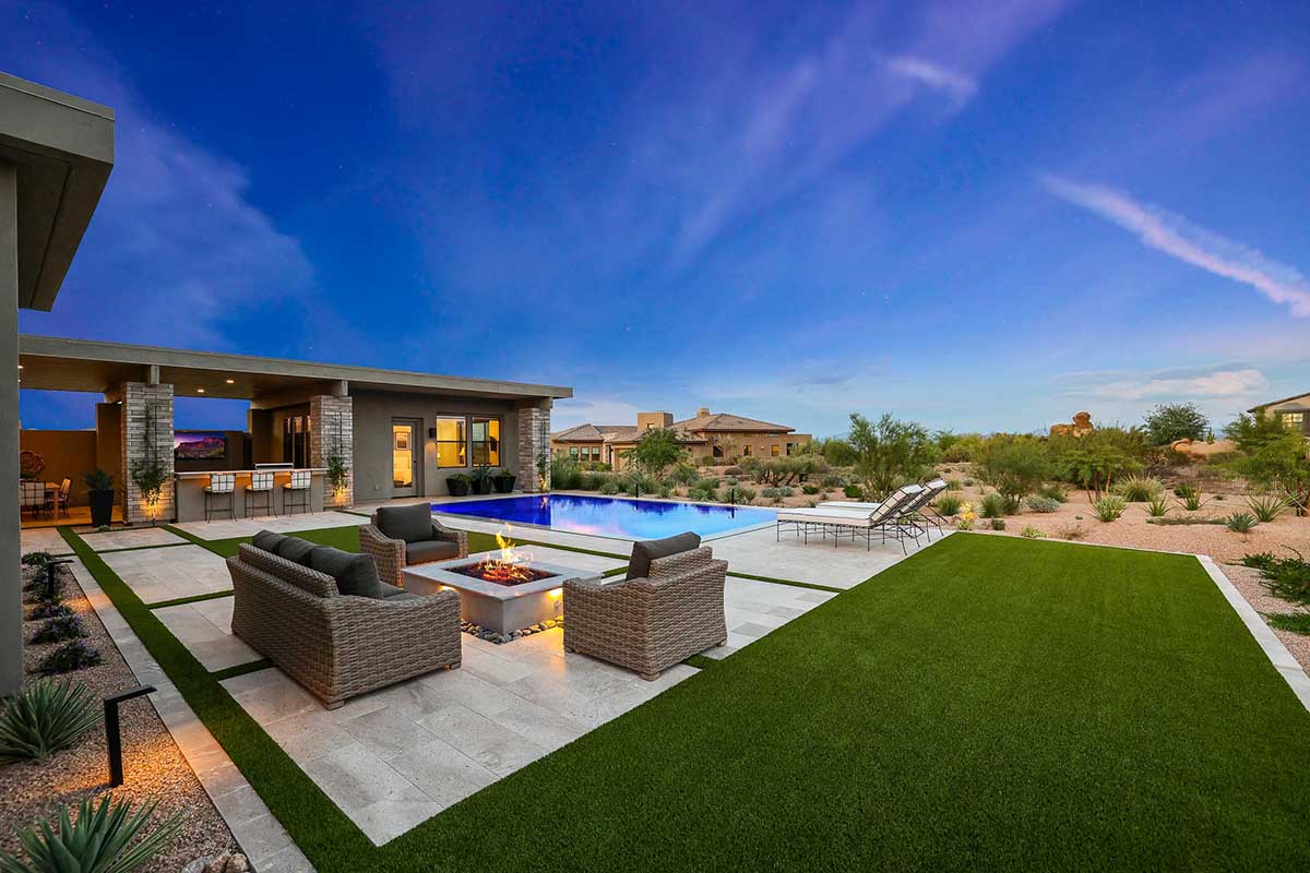 The backyard is an entertainer’s dream featuring a zero edge, 510 square foot heated pool with Baja shelf and LED color lighting, travertine tile hardscape, artificial turf accents, fire pit, low voltage lighting, complete irrigation system, full outdoor kitchen including fridge, burner and grill, large covered patio with exterior dining seating and 60” Mezzo fireplace, and a private side yard with Rain Curtain water feature and master bedroom exterior access.