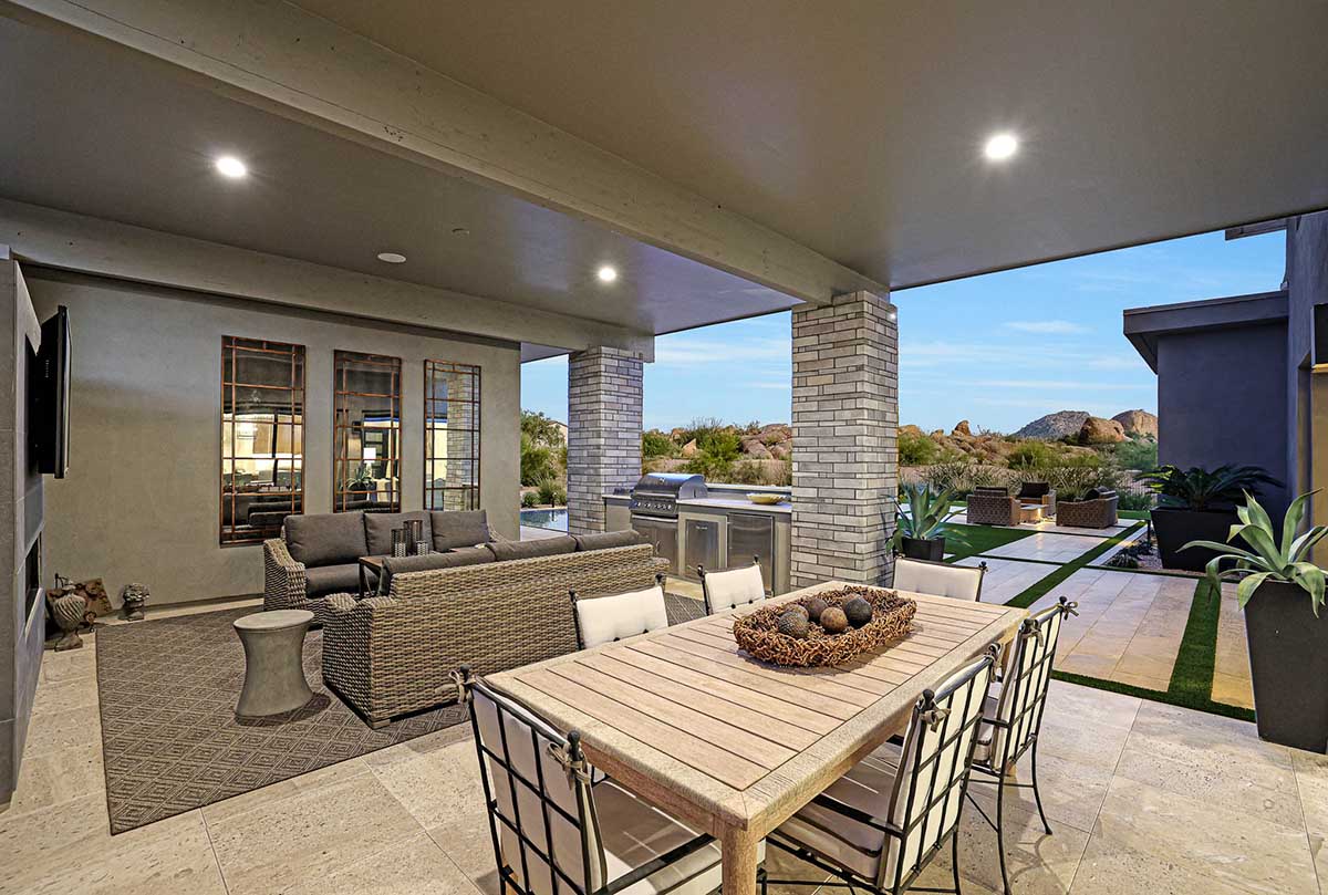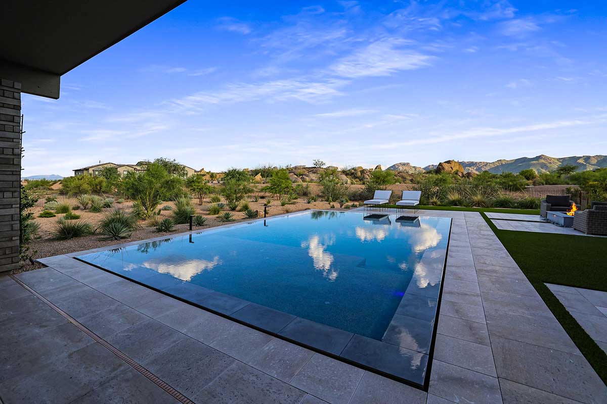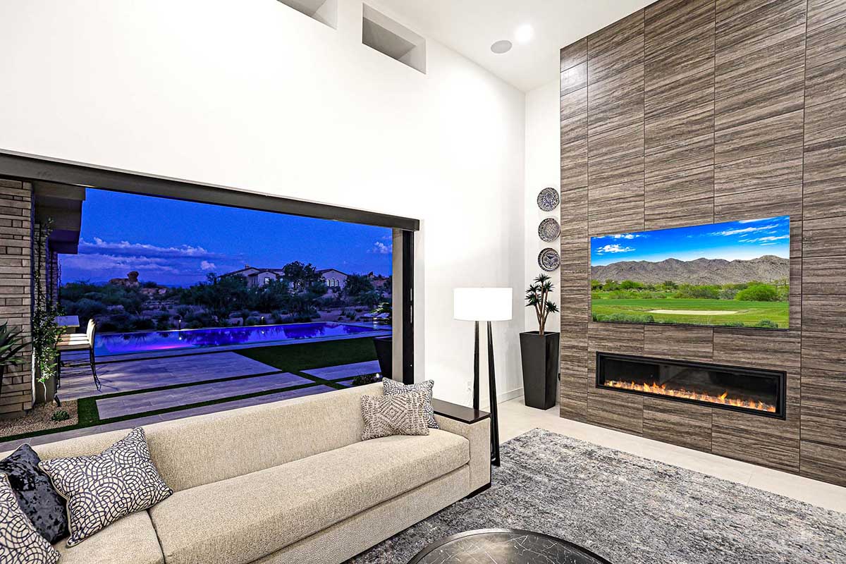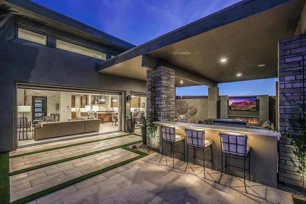 The backyard is an entertainer’s dream featuring a zero edge, 510 square foot heated pool with Baja shelf and LED color lighting, travertine tile hardscape, artificial turf accents, fire pit, low voltage lighting, complete irrigation system, full outdoor kitchen including fridge, burner and grill, large covered patio with exterior dining seating and 60” Mezzo fireplace, and a private side yard with Rain Curtain water feature and master bedroom exterior access.