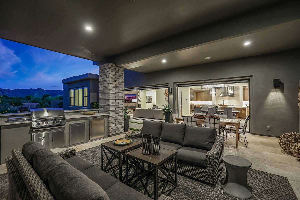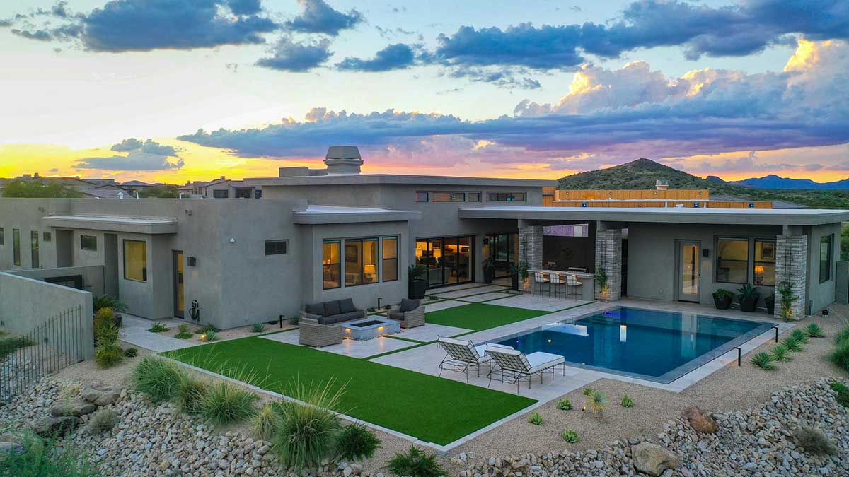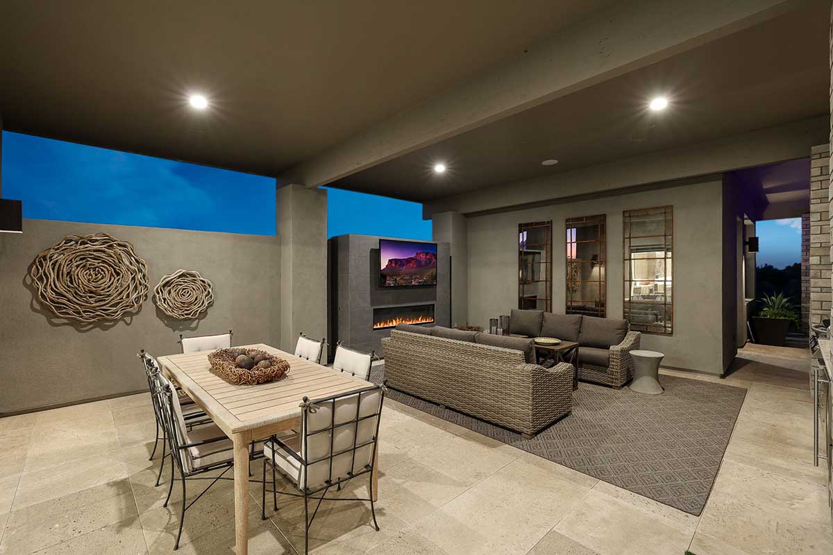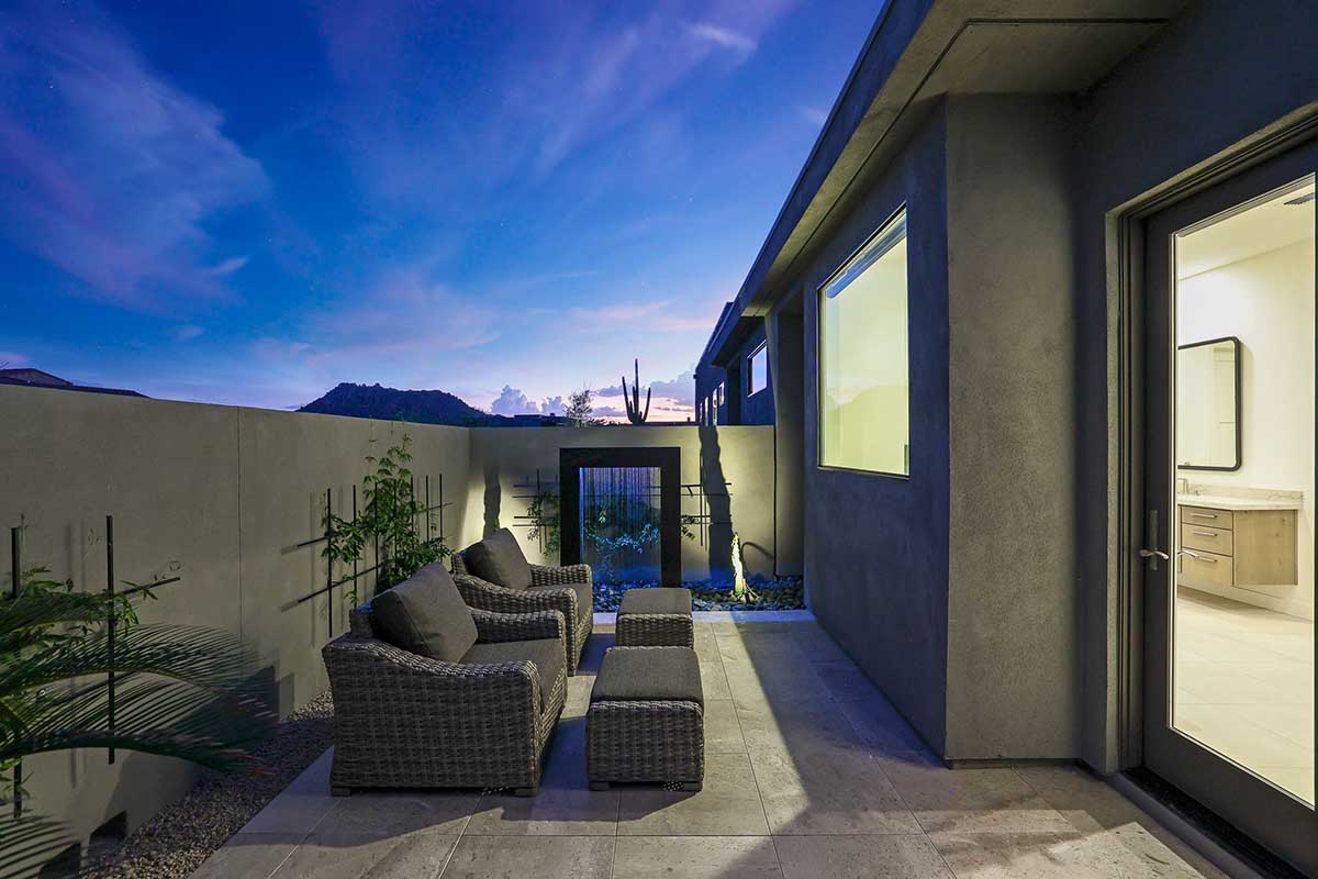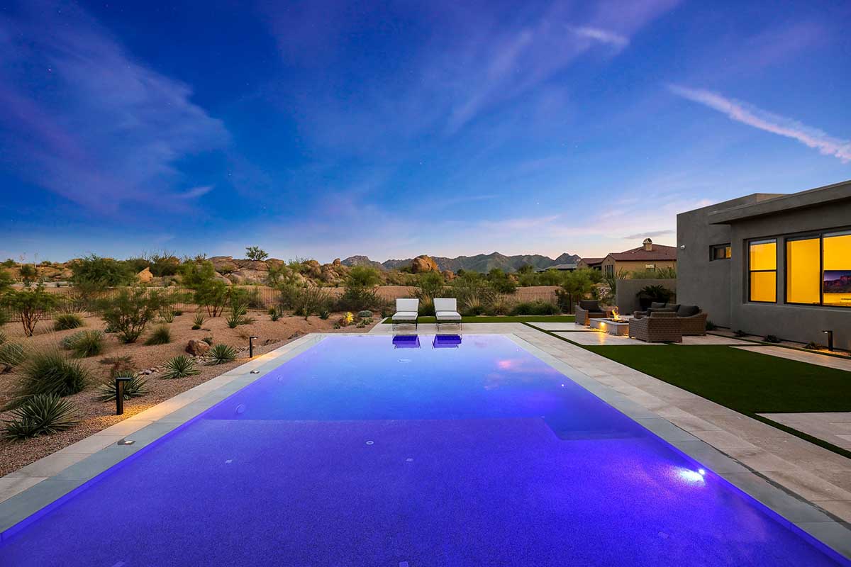 The backyard is an entertainer’s dream featuring a zero edge, 510 square foot heated pool with Baja shelf and LED color lighting, travertine tile hardscape, artificial turf accents, fire pit, low voltage lighting, complete irrigation system, full outdoor kitchen including fridge, burner and grill, large covered patio with exterior dining seating and 60” Mezzo fireplace, and a private side yard with Rain Curtain water feature and master bedroom exterior access.