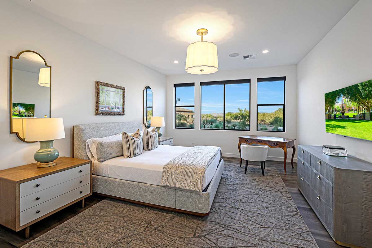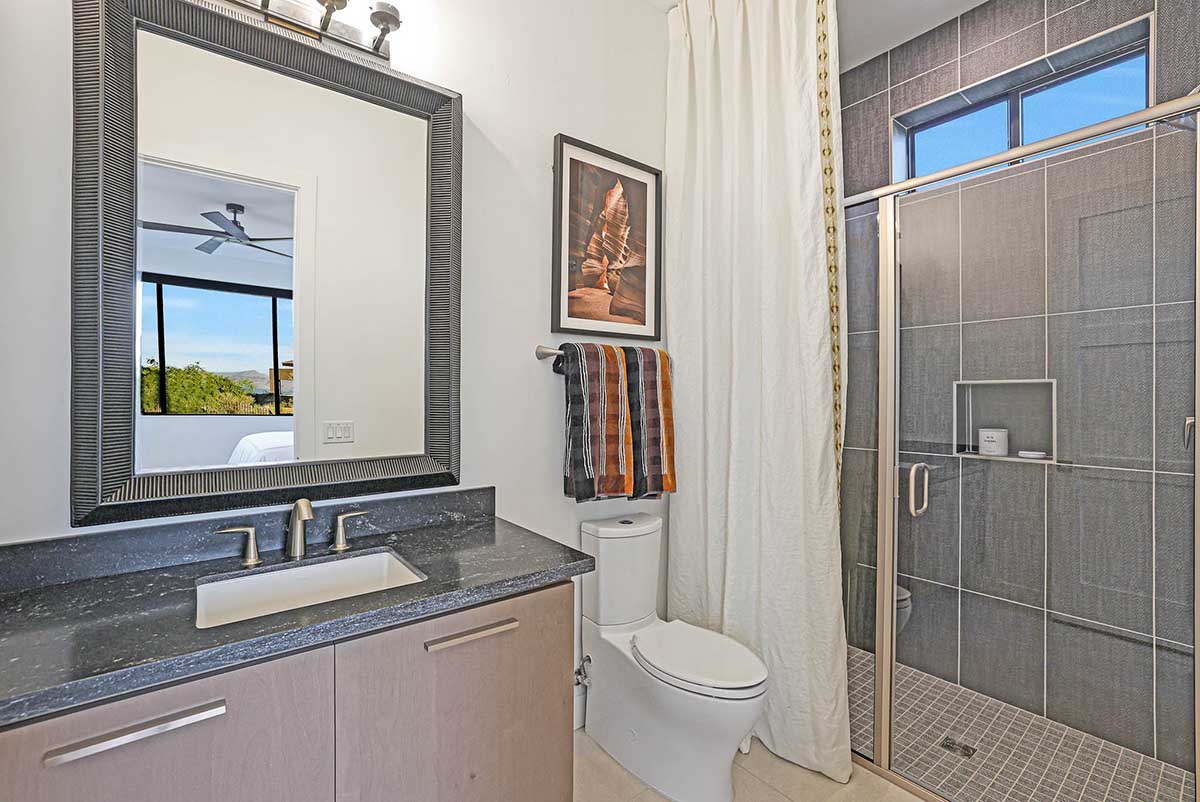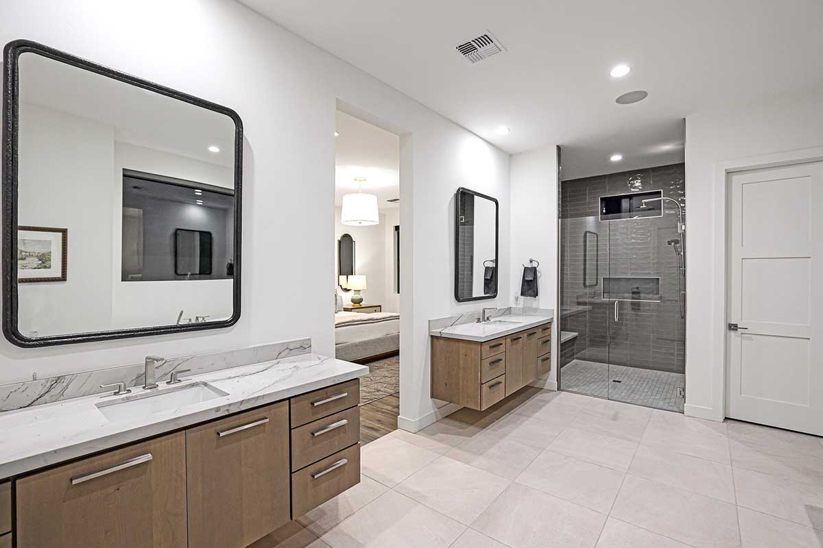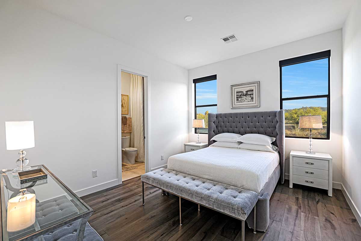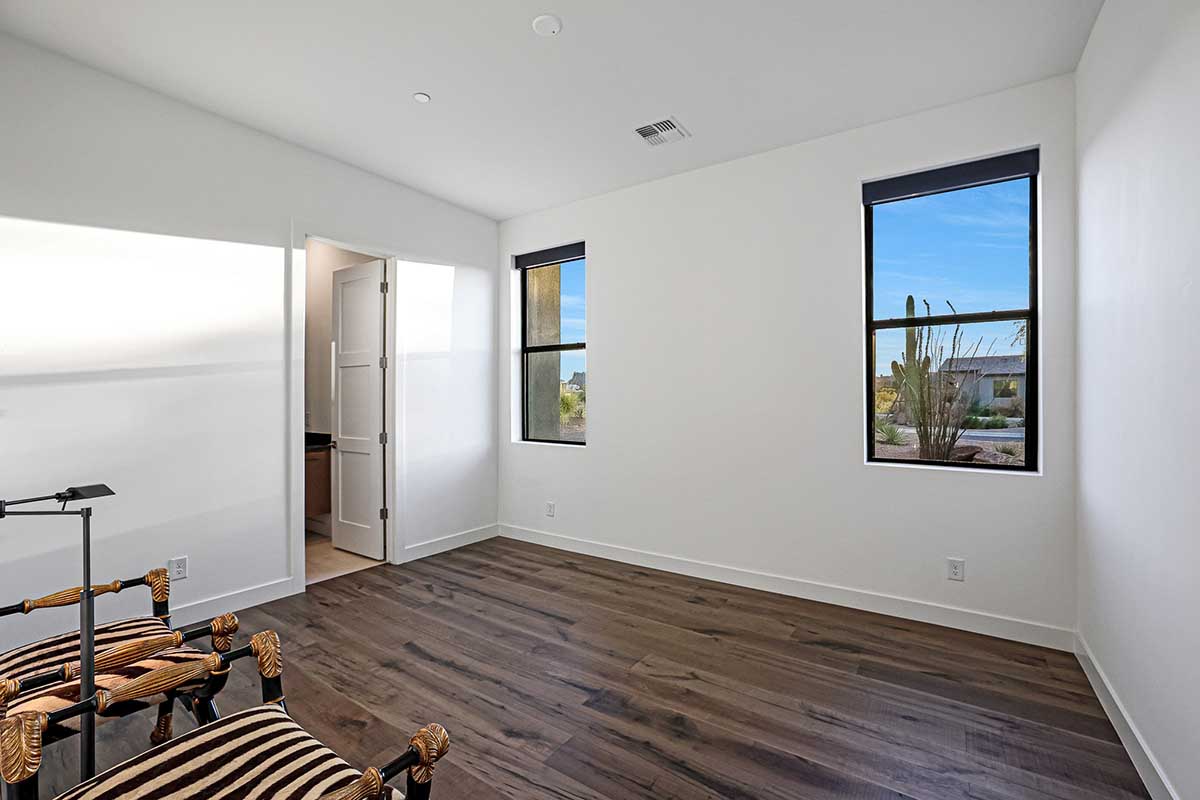 Upgraded flooring found in the home includes Arizona Tile Pietra Italia and Trim-West Provenza Volterra Castello wood in Maple. All five bedrooms are en suite including the attached casita with private entry and kitchenette. Bathrooms include upgraded toilets, designer fixtures, custom mirrors, quartz and granite counters, floating vanities, and upgraded tile at all showers.
