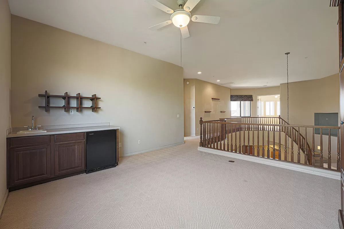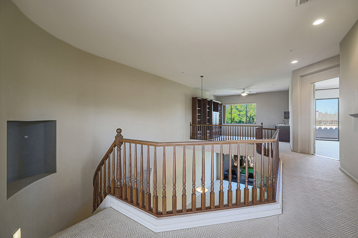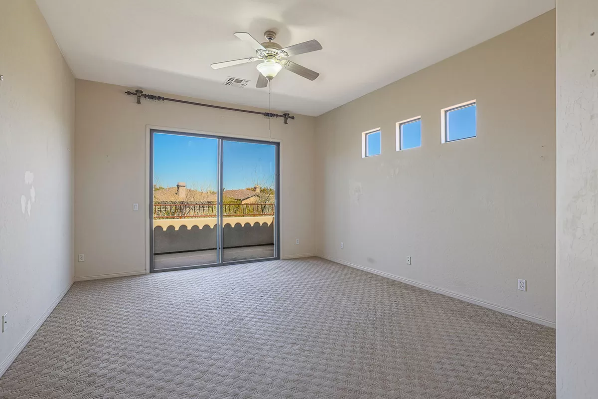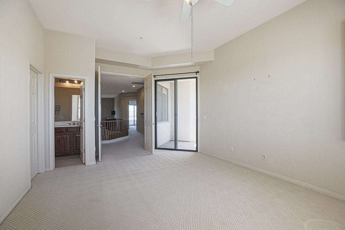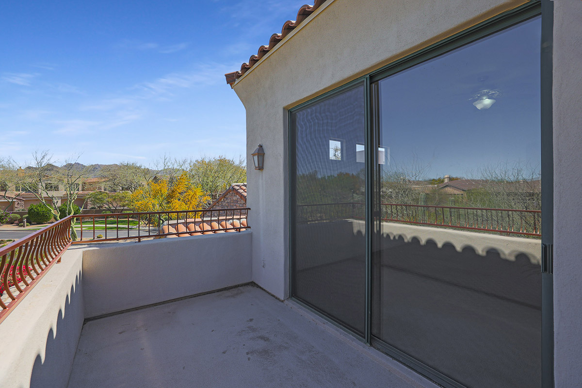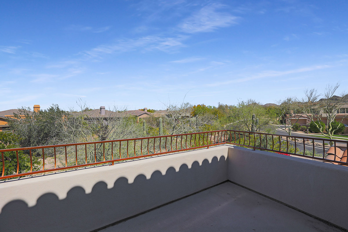 The upstairs has a loft with a wet bar overlooking the downstairs. The owners suite is spacious with a large bathroom featuring a separate shower and tub, dual sinks, and a large walk-in closet. The owner’s suite also has a private balcony with distant McDowell Mountain views. One more ensuite bedroom with a private balcony (3 total bedrooms) rounds out the upstairs.