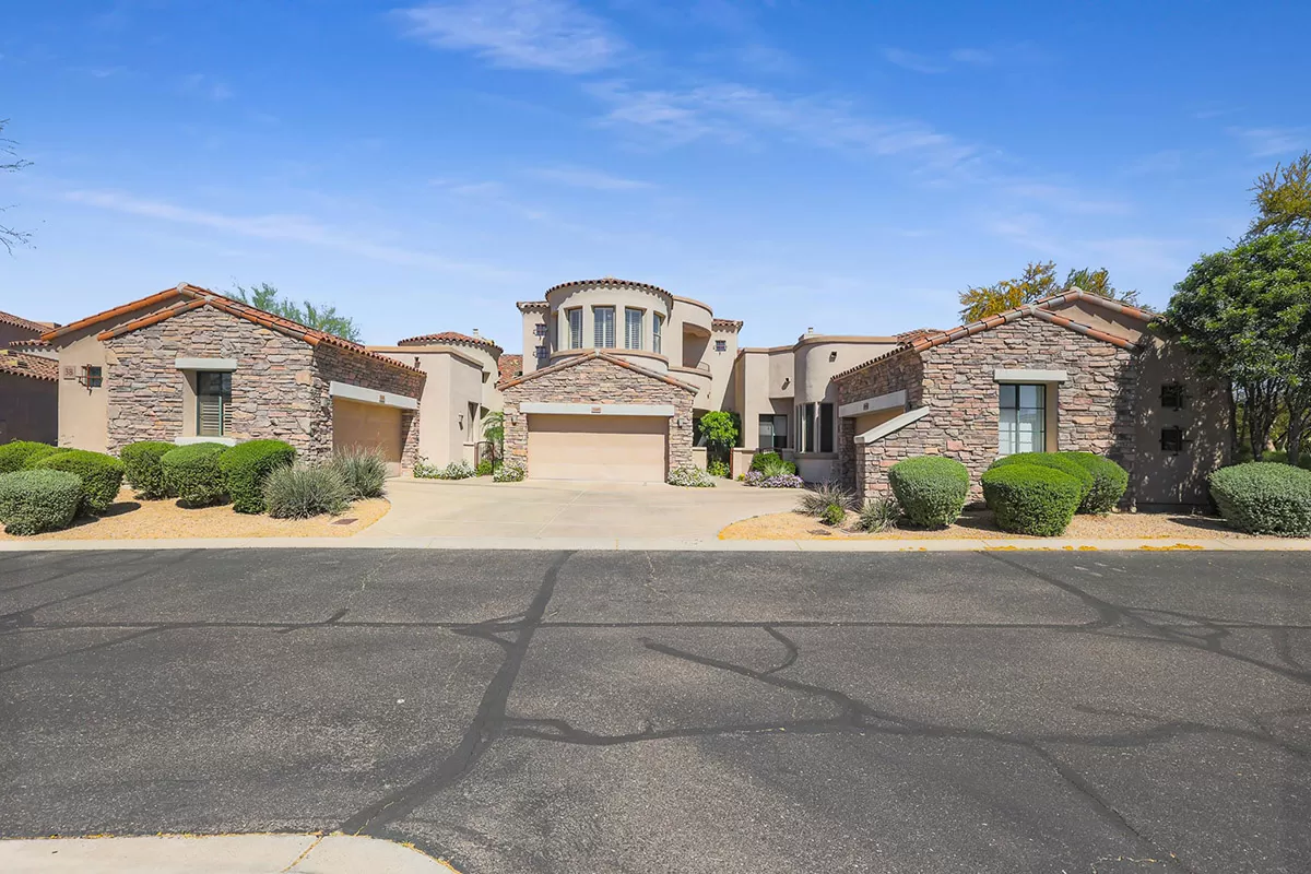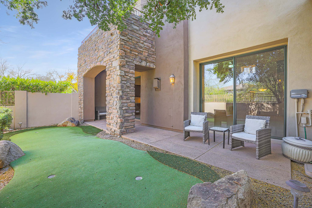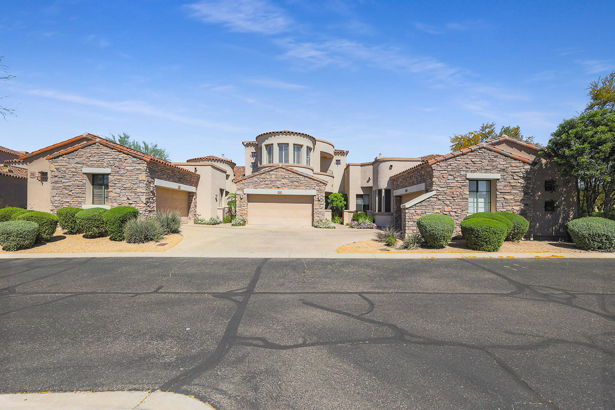 The first time on the market for this wonderful Cachet at Grayhawk townhome featuring just over 2,300 square feet. Located in a gated community and adjacent to the community clubhouse for easy access to the amenities including large sparkling pool, spa, covered patio and lounge areas, and a well-stocked workout facility. The exterior stacked stone accents, and entry courtyard greet you while accessing your direct entry two-car garage.