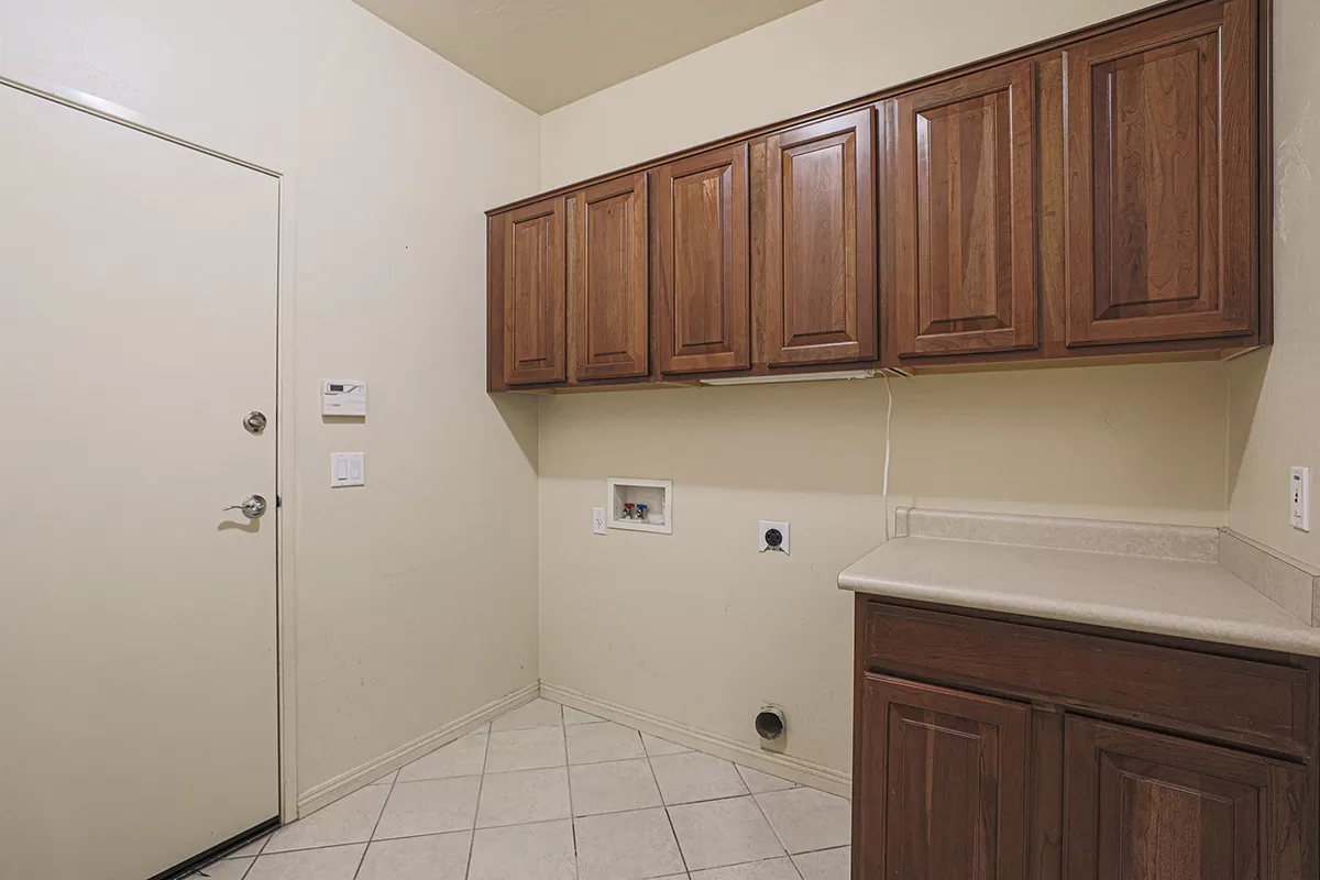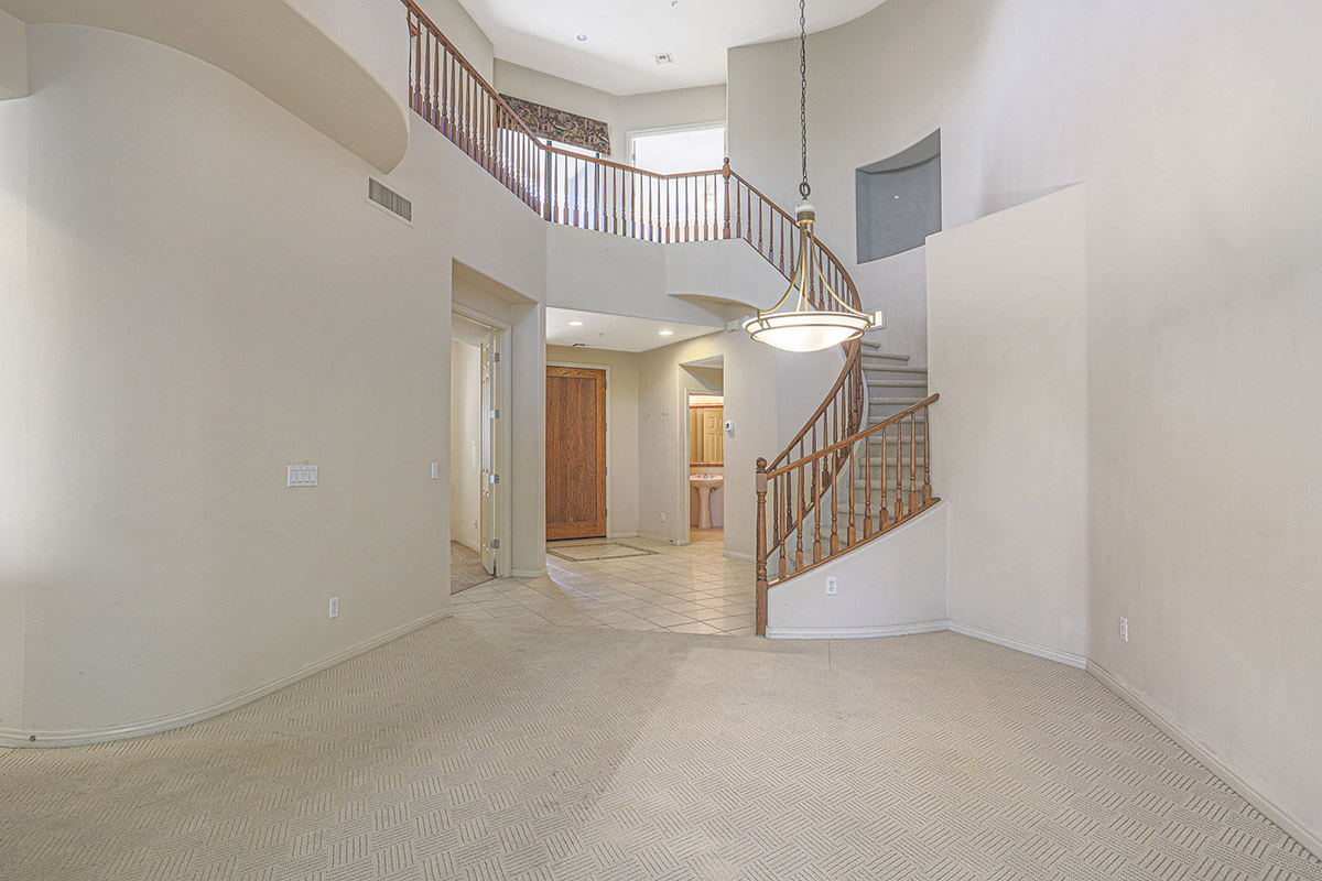 Upon entry, take note of the curved staircase and soaring ceilings. The downstairs living spaces include an ensuite guest bedroom with walk-in closet, a guest powder bath, full-sized laundry room, kitchen and spacious great room for living and dining. The great room has a corner gas fireplace and built-in entertainment area. The kitchen has ample cabinetry and counter space, pull-out drawers inside the cabinets, a built-in desk, breakfast area, gas cooktop, center island, breakfast nook and stainless steel appliances.