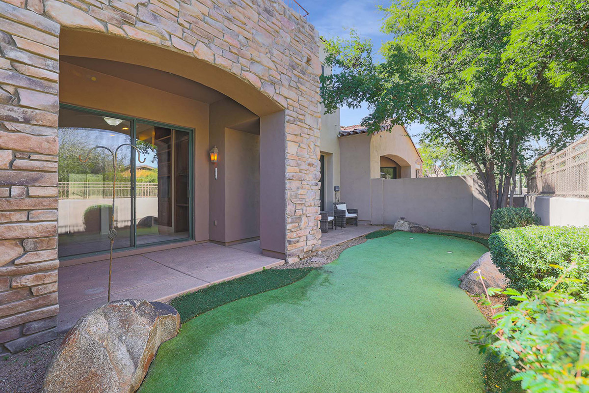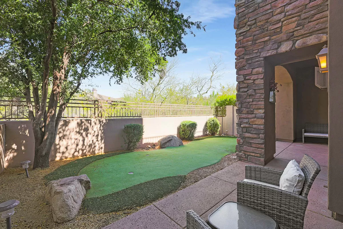 The easy care backyard has a mature shade tree, three-hole artificial turf putting green and both an uncovered and covered patio for outdoor dining and lounging and natural open area behind the fence for a more private feel. Front yard landscaping is maintained by the HOA. Both HVAC units were replaced in 2019.