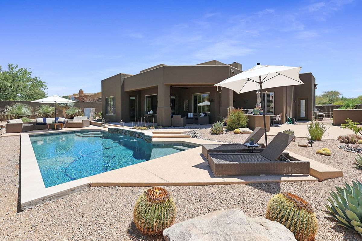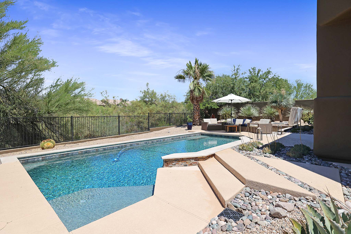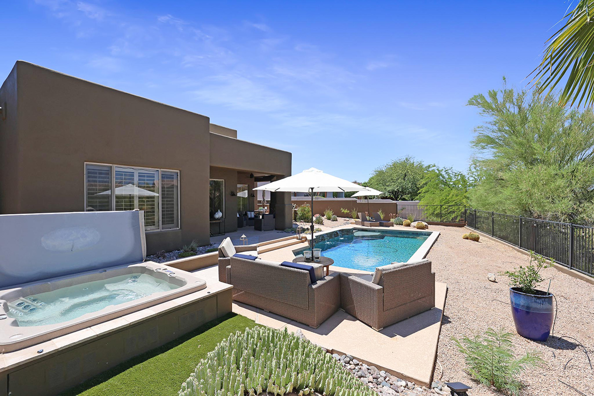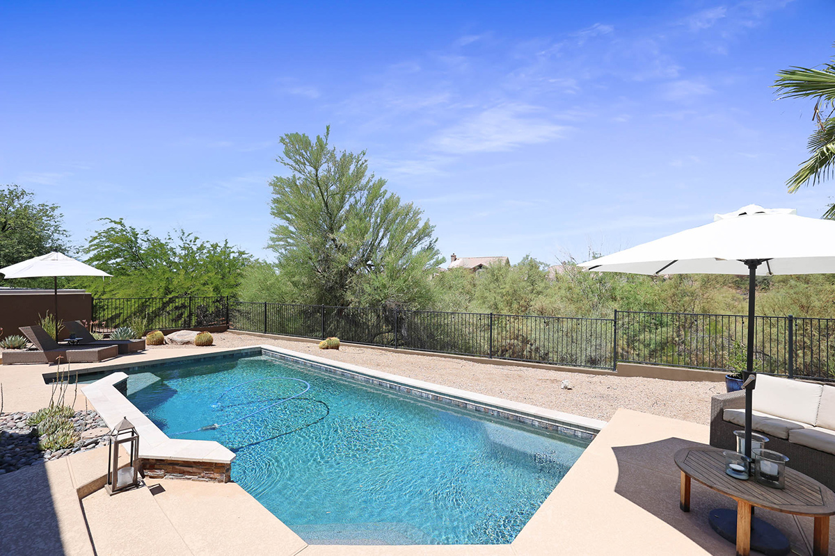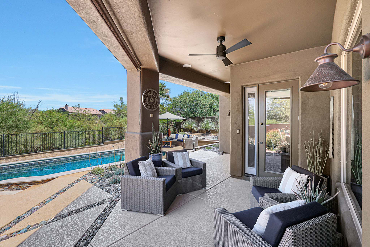 The backyard lends to the private feel by overlooking Natural Area Open Space and providing multiple lounge and dining spaces, a sparkling pool with stacked stone water feature, built-in spa, low maintenance desert landscaping, covered patio, and a large side patio perfect for dining with a built-in barbecue.