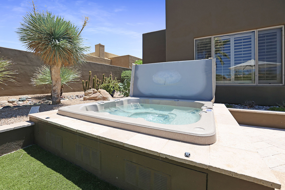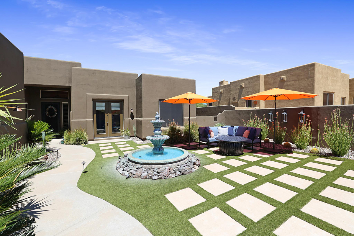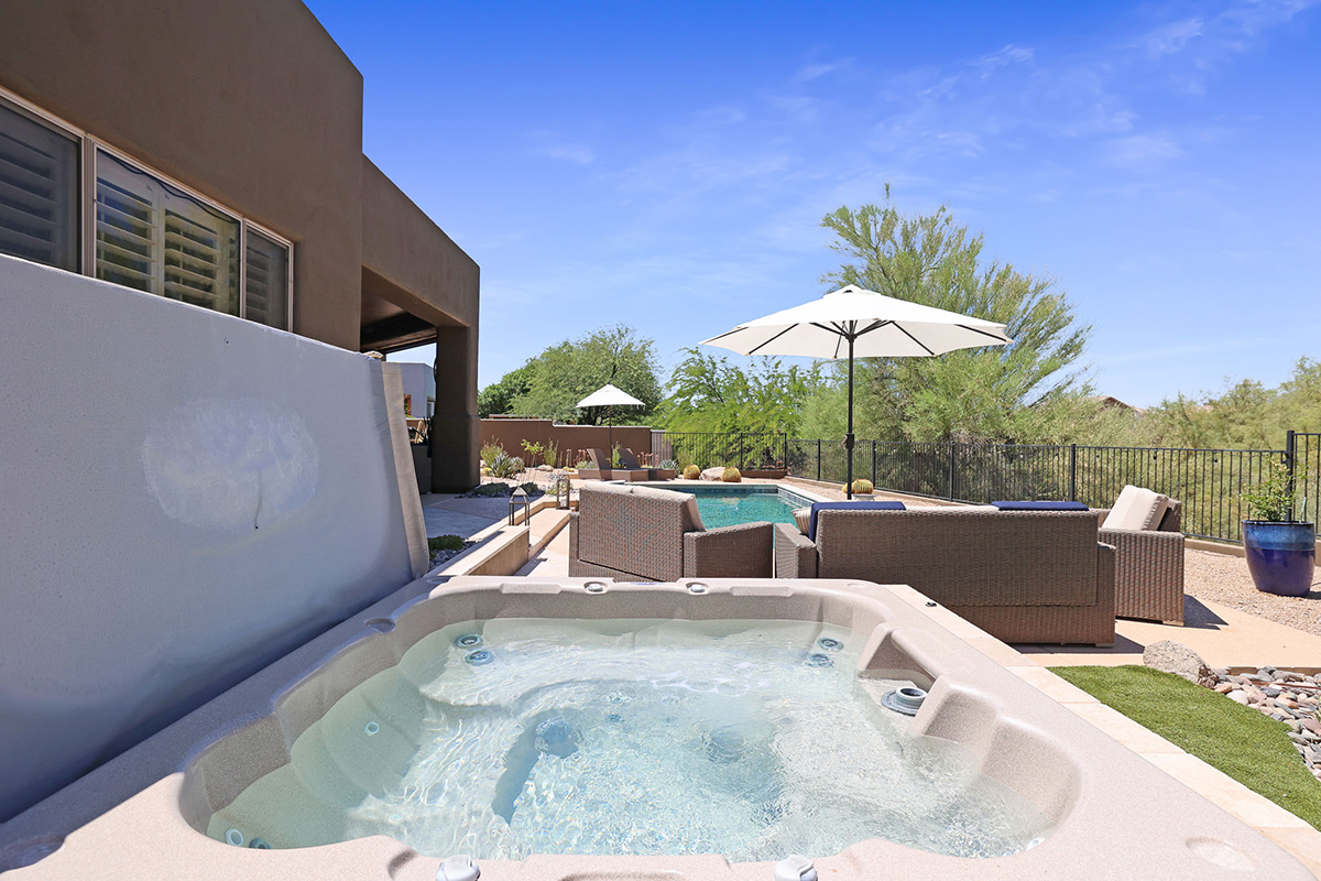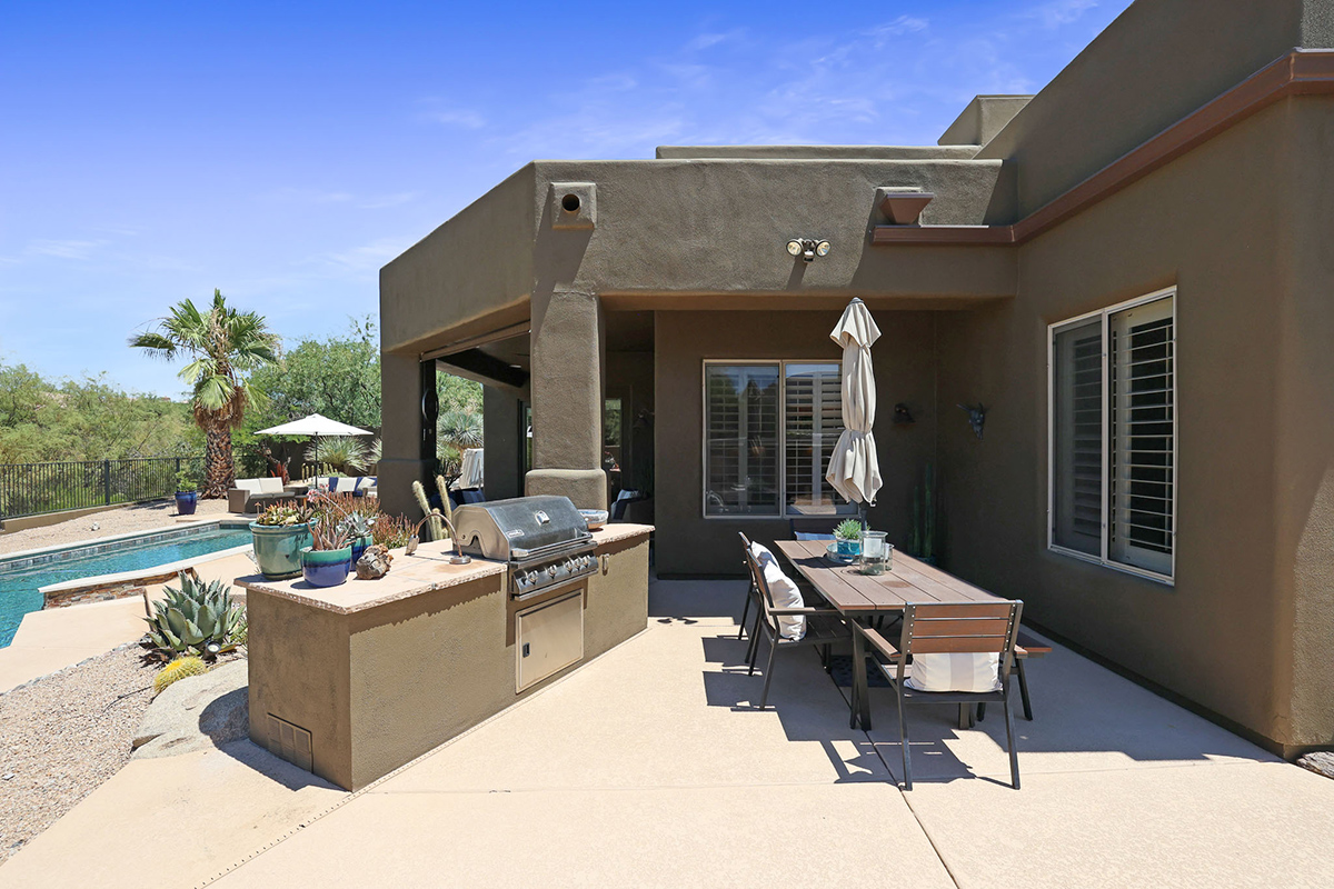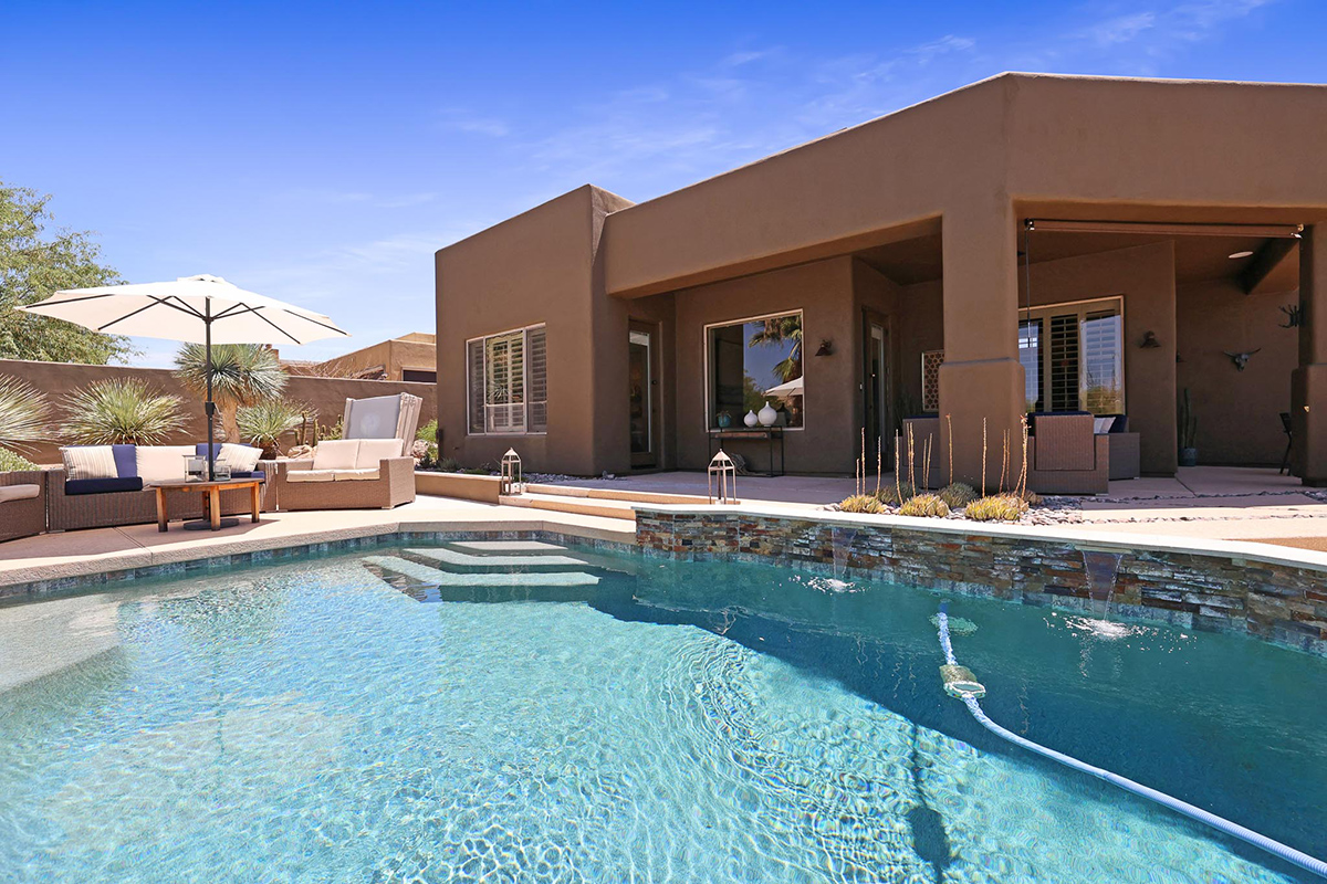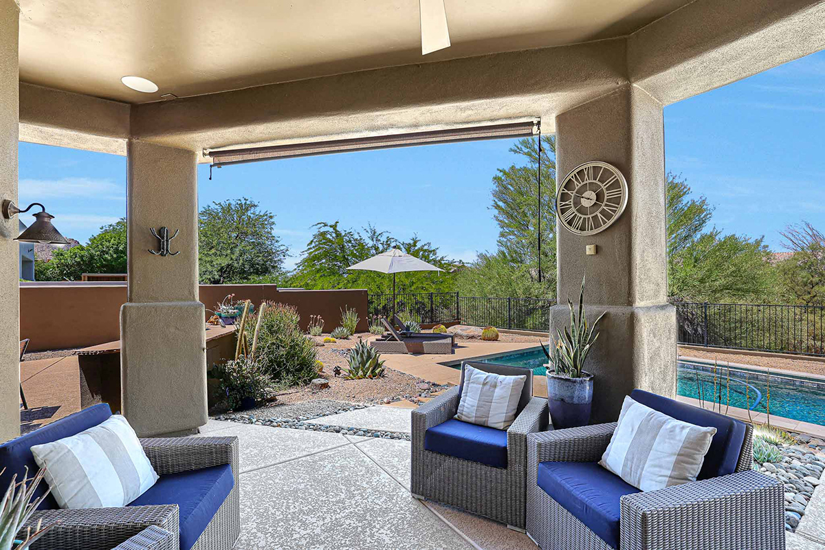 The backyard lends to the private feel by overlooking Natural Area Open Space and providing multiple lounge and dining spaces, a sparkling pool with stacked stone water feature, built-in spa, low maintenance desert landscaping, covered patio, and a large side patio perfect for dining with a built-in barbecue.