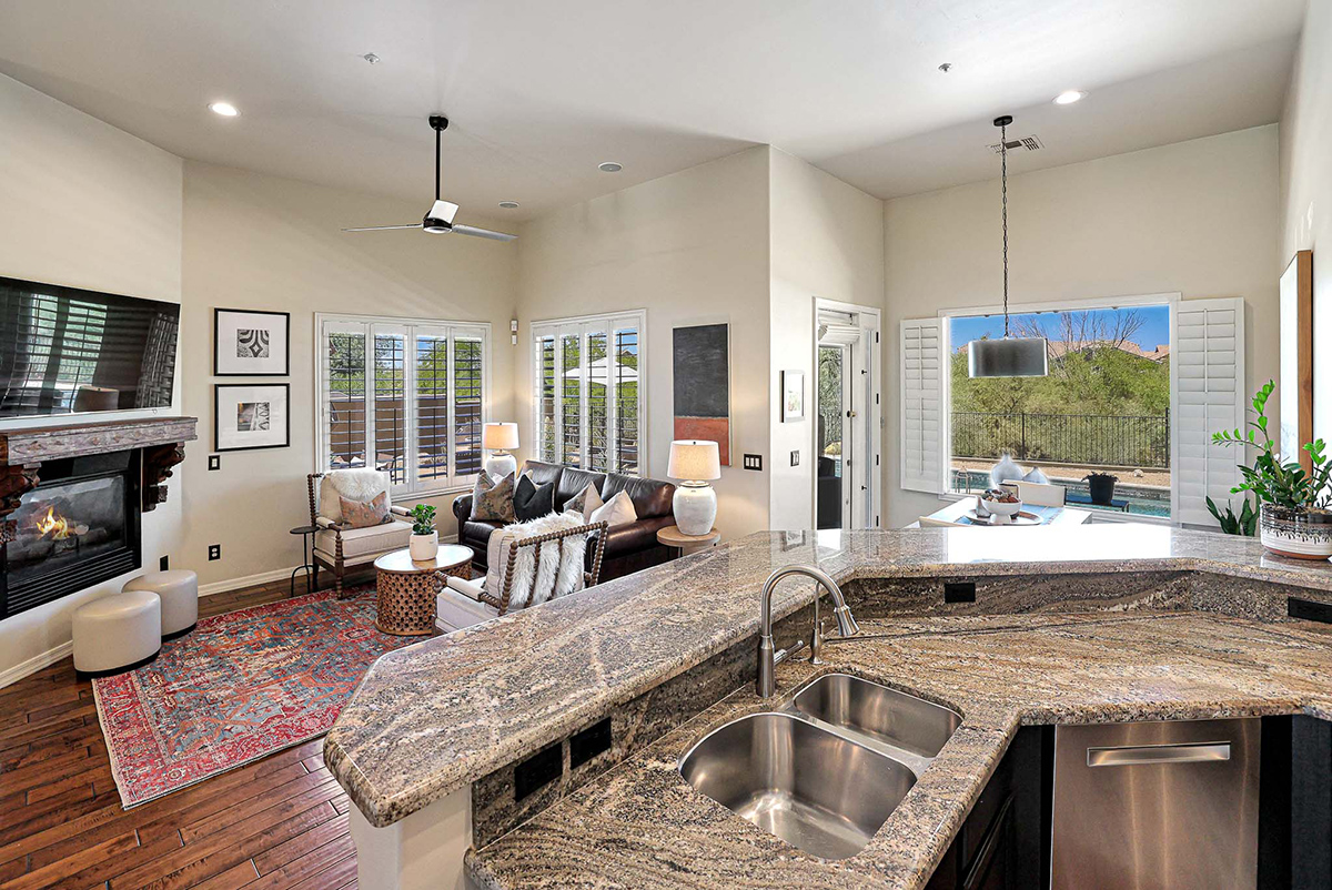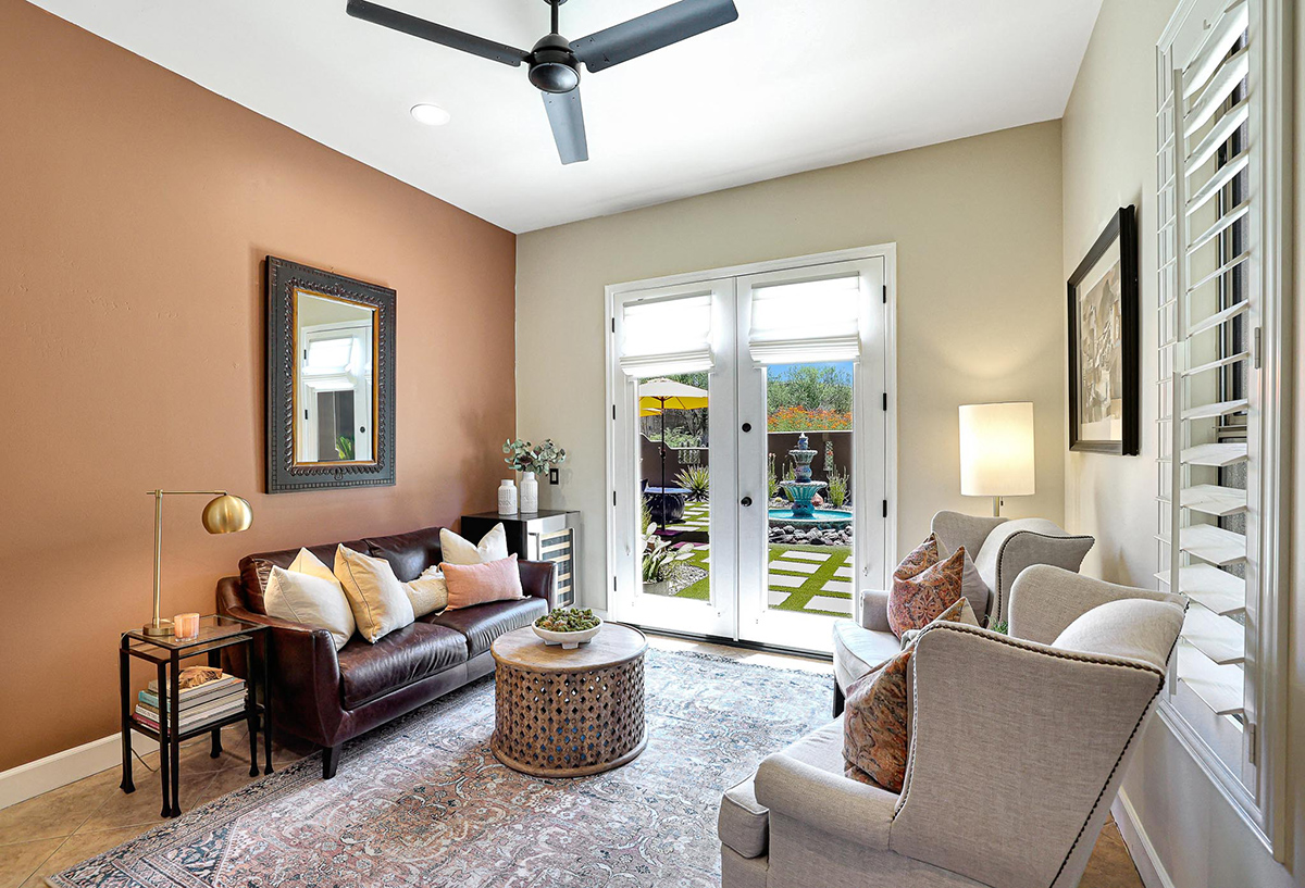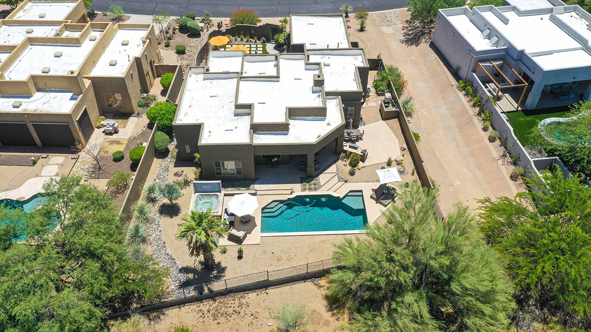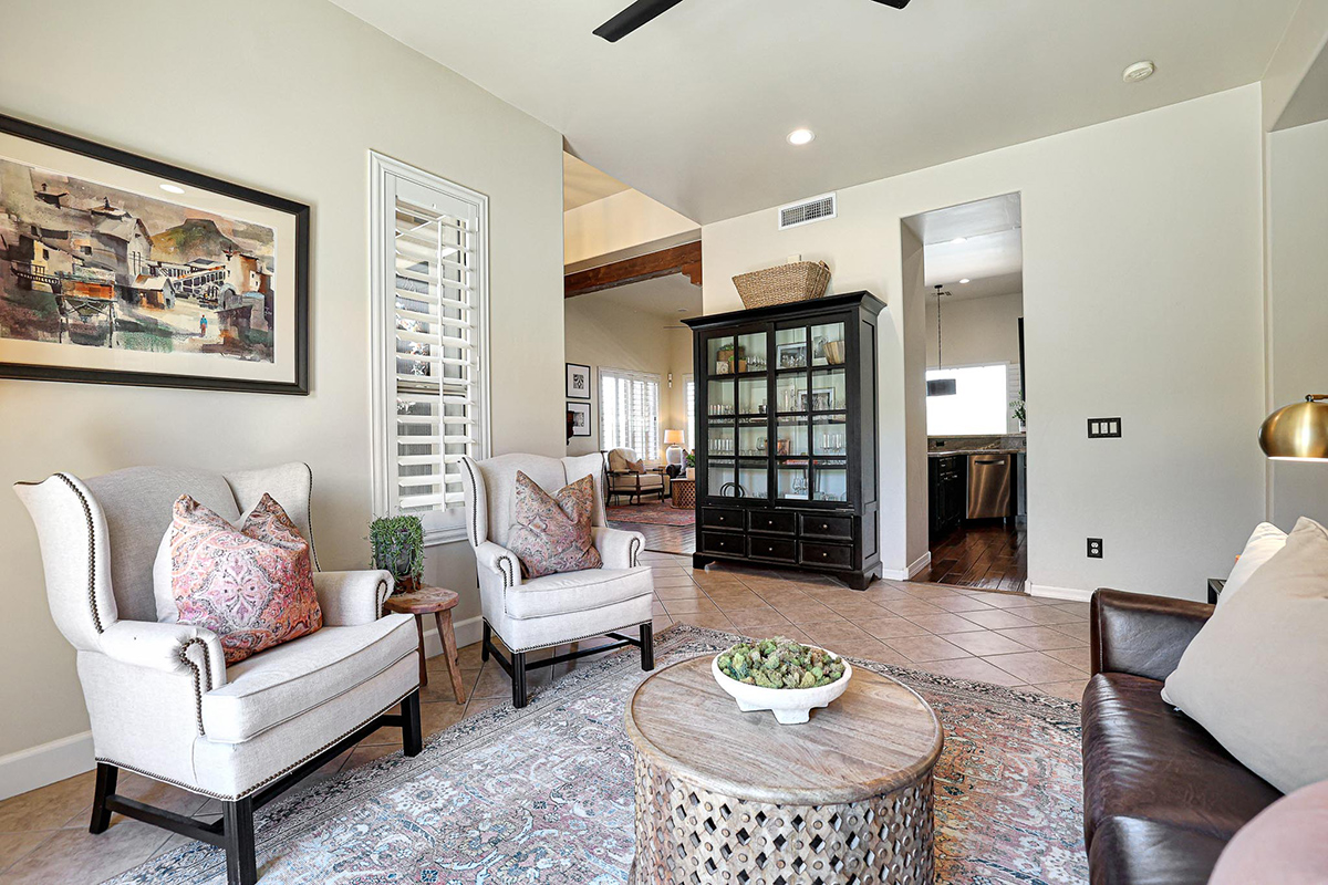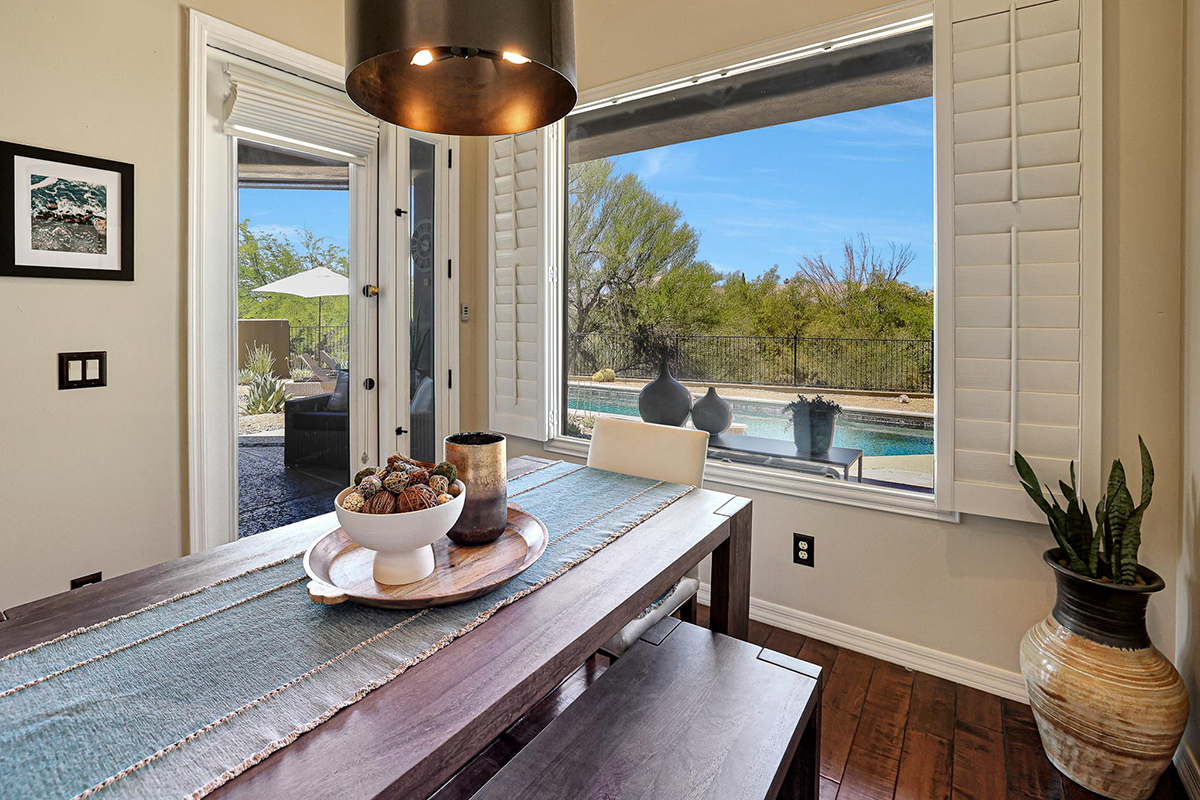 The backyard lends to the private feel by overlooking Natural Area Open Space and providing multiple lounge and dining spaces, a sparkling pool with stacked stone water feature, built-in spa, low maintenance desert landscaping, covered patio, and a large side patio perfect for dining with a built-in barbecue.