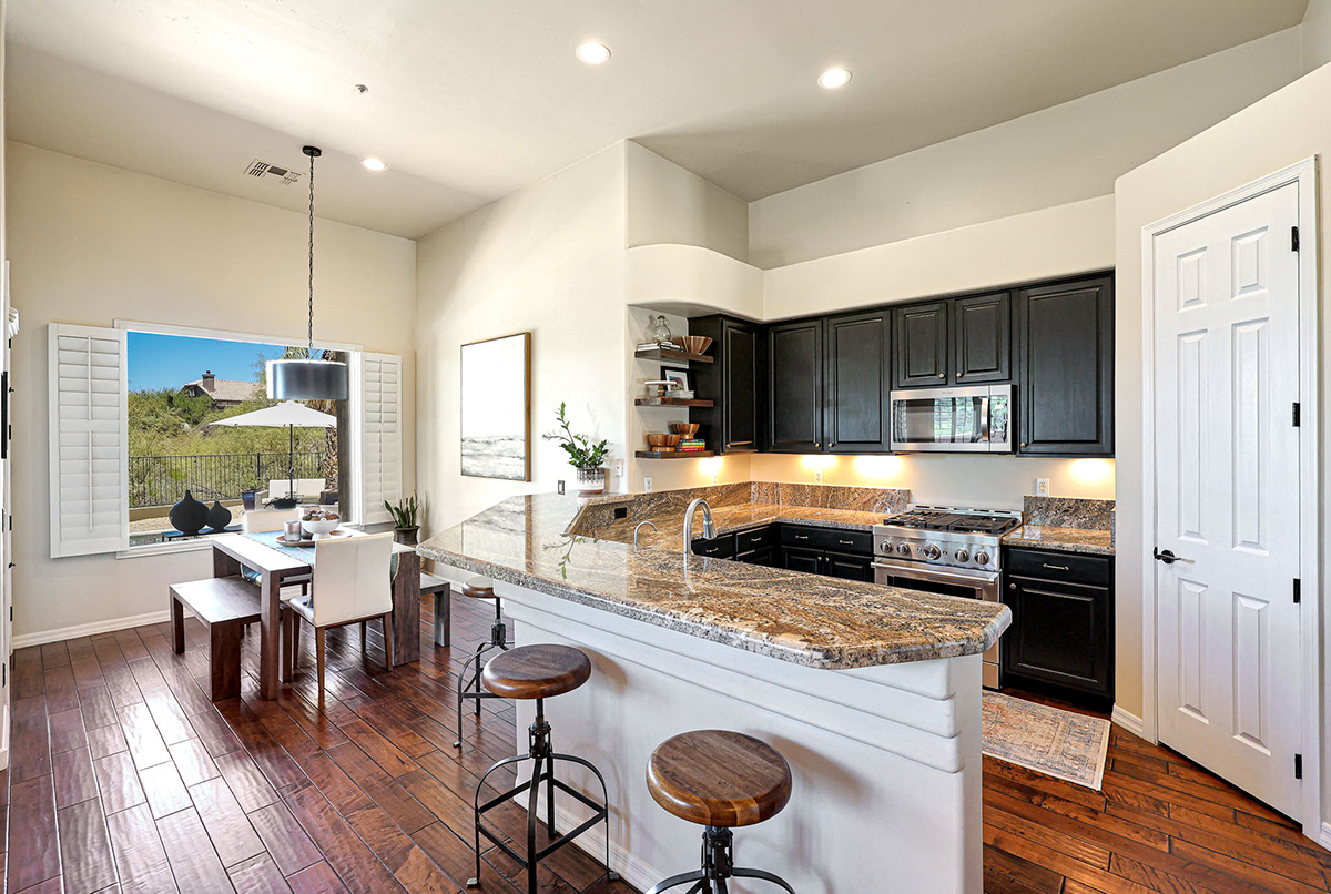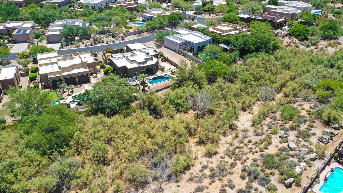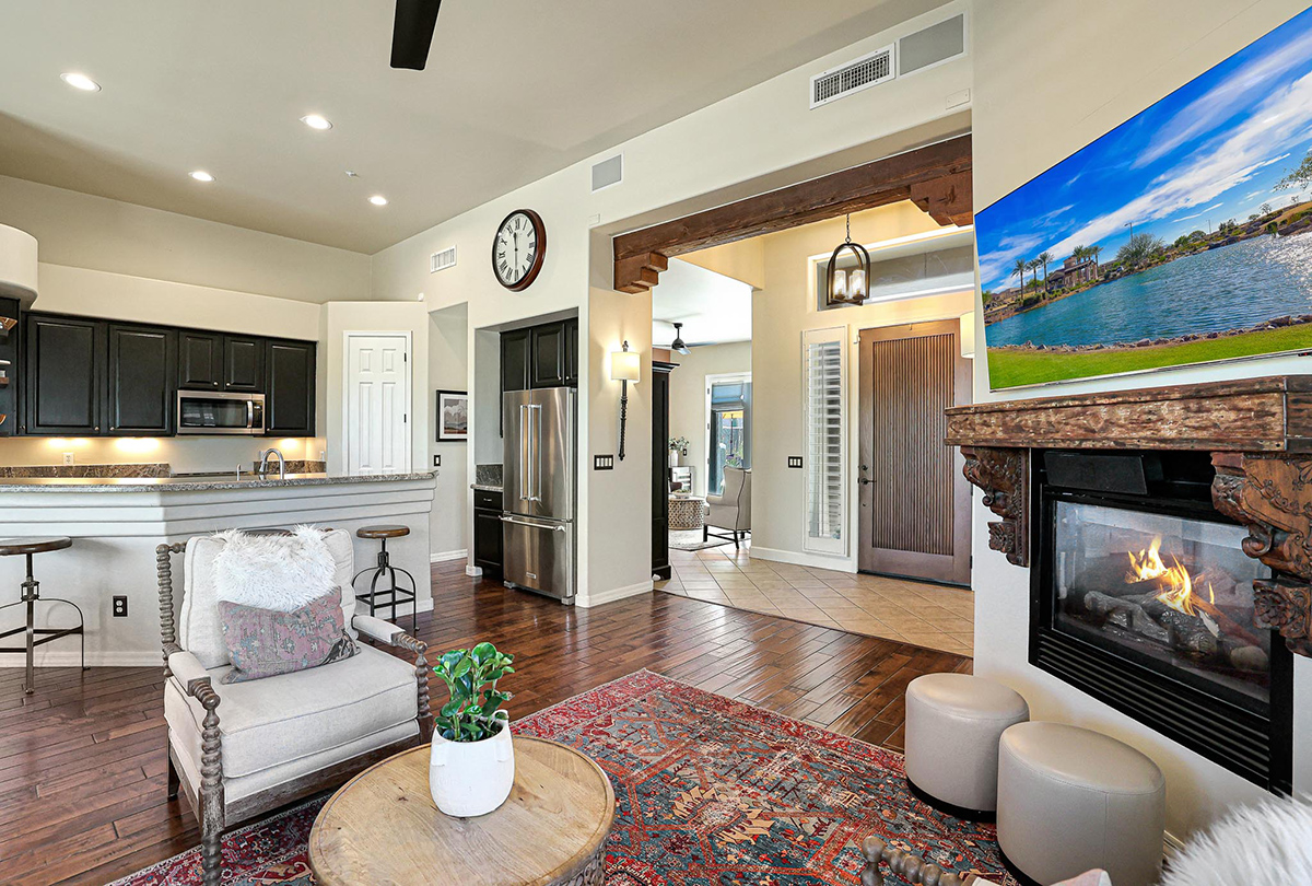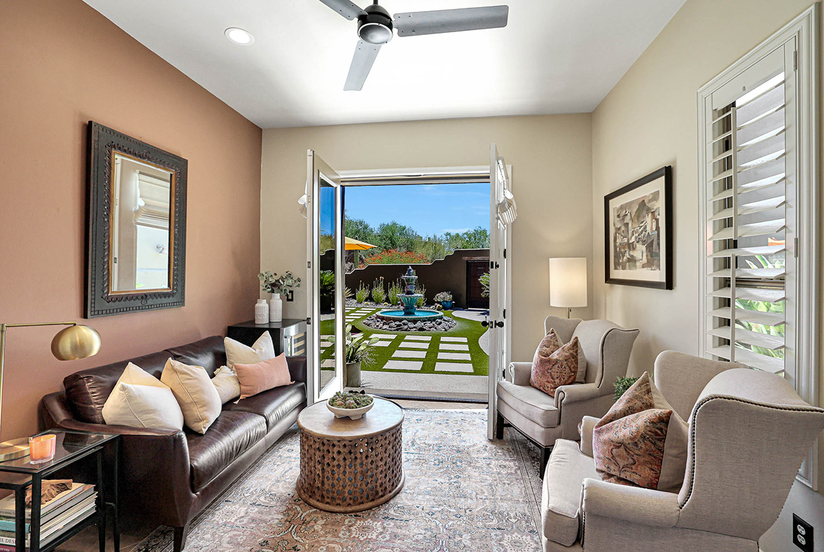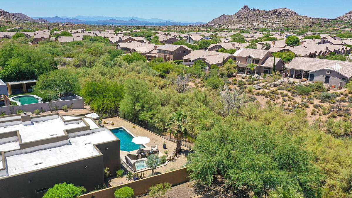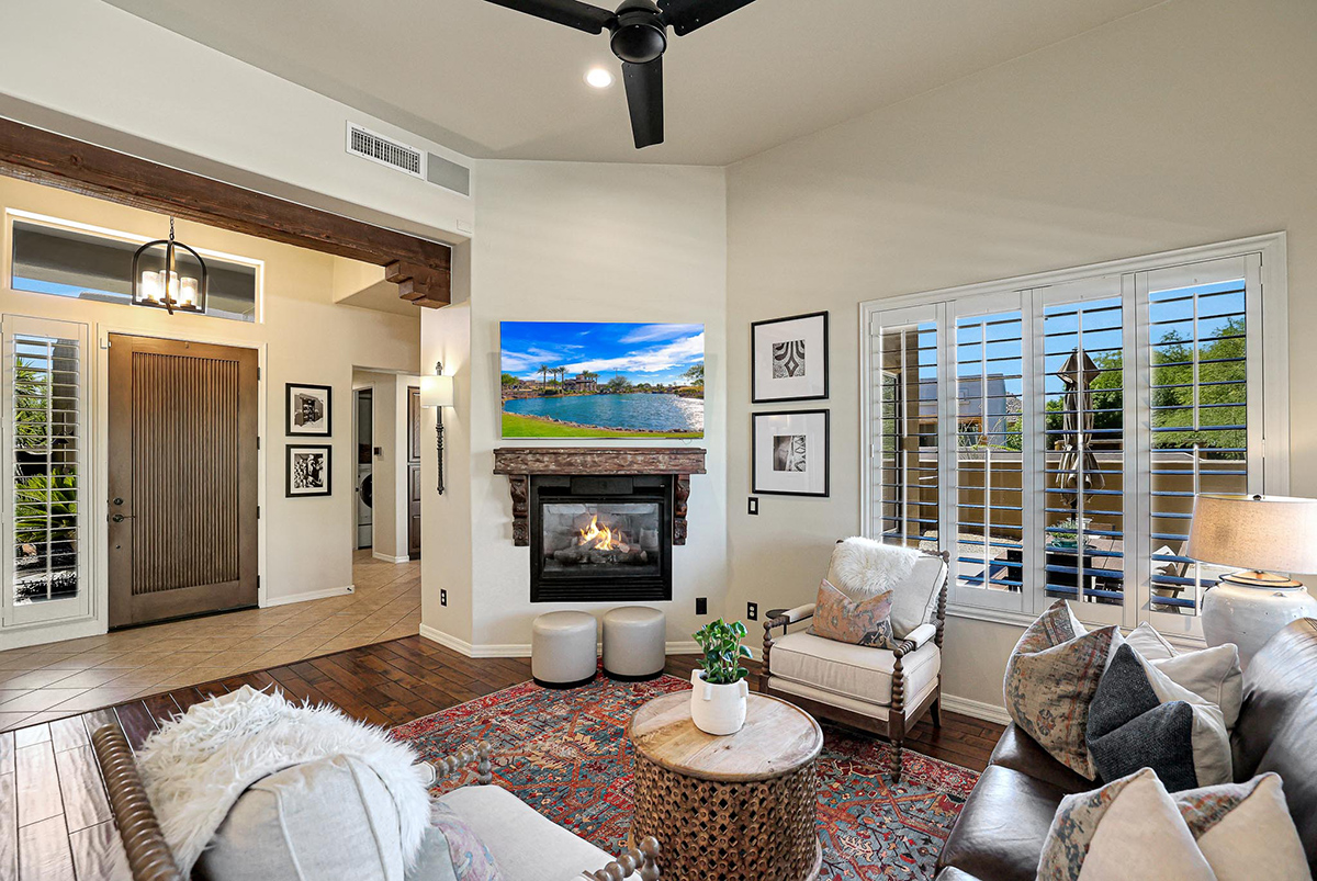 The backyard lends to the private feel by overlooking Natural Area Open Space and providing multiple lounge and dining spaces, a sparkling pool with stacked stone water feature, built-in spa, low maintenance desert landscaping, covered patio, and a large side patio perfect for dining with a built-in barbecue.