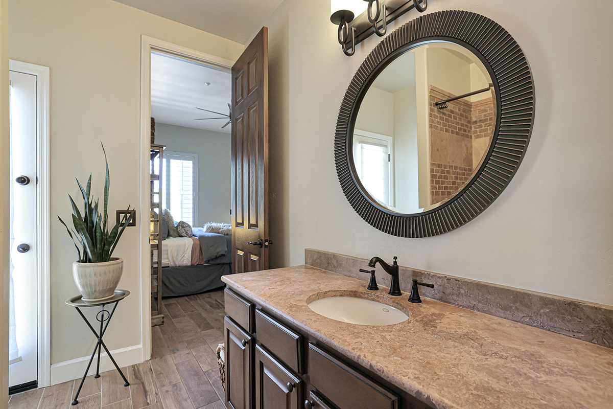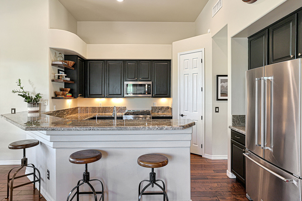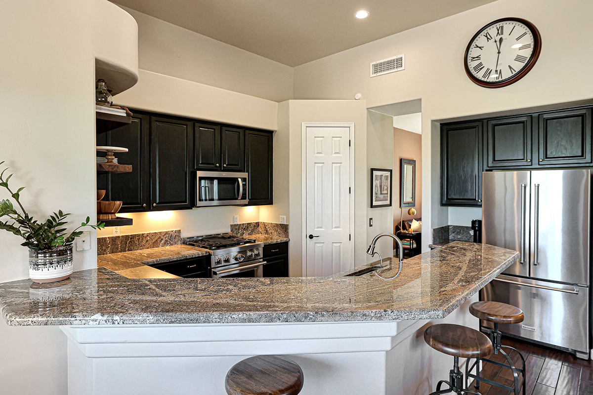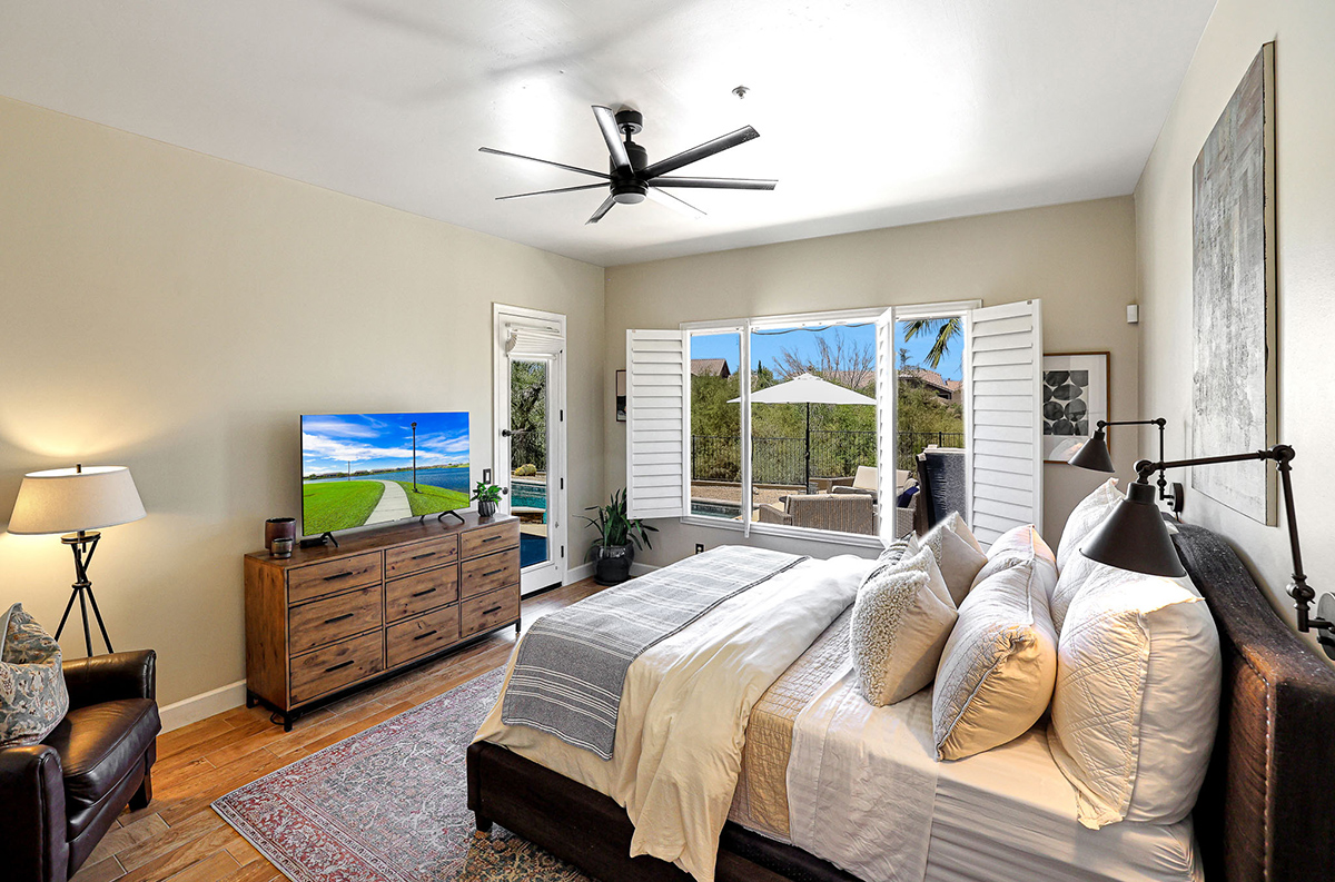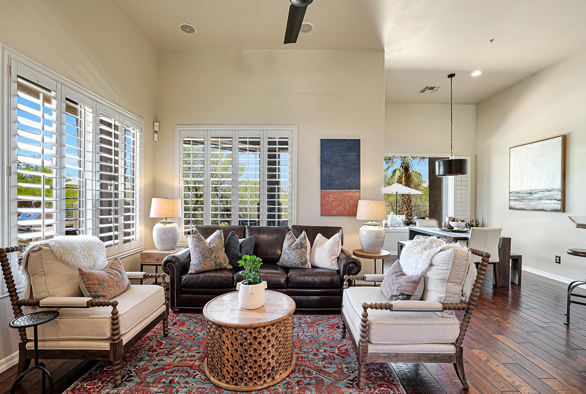 The backyard lends to the private feel by overlooking Natural Area Open Space and providing multiple lounge and dining spaces, a sparkling pool with stacked stone water feature, built-in spa, low maintenance desert landscaping, covered patio, and a large side patio perfect for dining with a built-in barbecue.