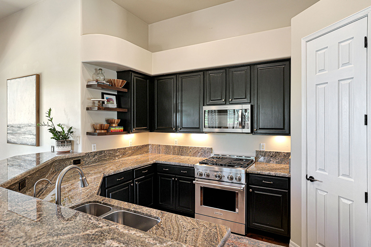 Once inside take note of the beamed entry leading you to the open concept great room with matching wood mantle over the cozy fireplace and hardwood floors. The kitchen has bar-top seating, dark wood cabinetry, corner pantry, granite counters, stainless steel appliances including gas cooktop, all overlooking the dining room with picturesque backyard views.