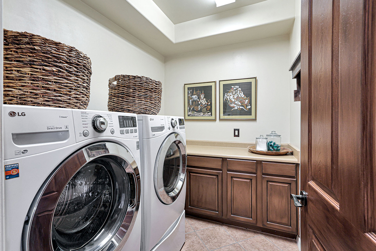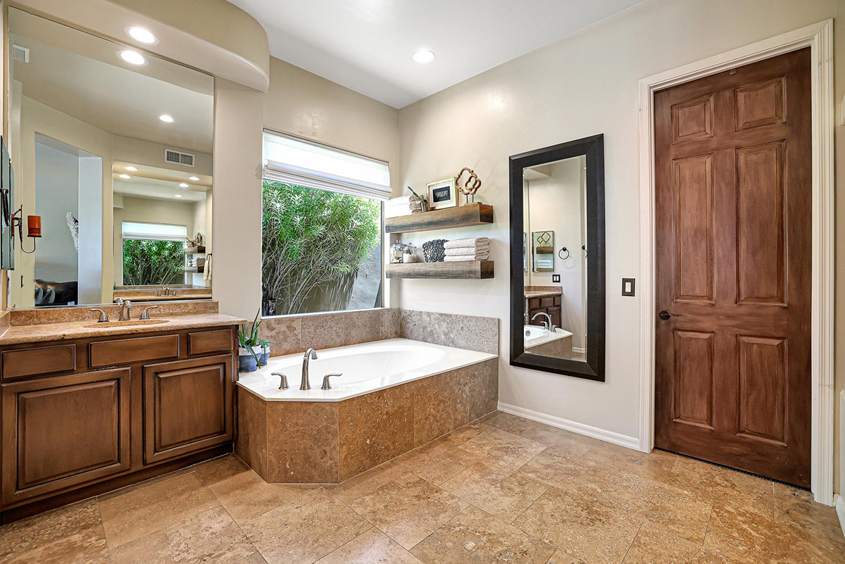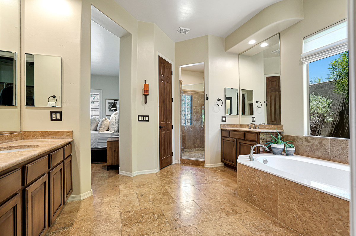 Other interior spaces include three bedrooms and three bathrooms total and a den which could easily be used as a flex space for an office or formal dining room. A master bedroom with exterior access and a master bath suite which includes a walk-in closet, private water closet, dual vanities, large soaking tub and a walk-in shower. The junior master suite is split from the other bedrooms and has an ensuite bathroom. The third guest room is adjacent to the hall bathroom.