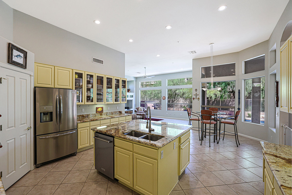 In the heart of the home, you will find an abundance of light, cheery spaces including a great room set up featuring the kitchen, family room, and breakfast area. The family room has a centerpiece gas fireplace and built-in shelving and overlooks the backyard with the numerous large pane windows. The kitchen has playful yellow cabinetry with glass display fronts, granite counters, a center island with seating, and a walk-in pantry. Other living spaces include the formal living and dining spaces which are perfect for flex use and a laundry with cabinets for storage and a prep sink.