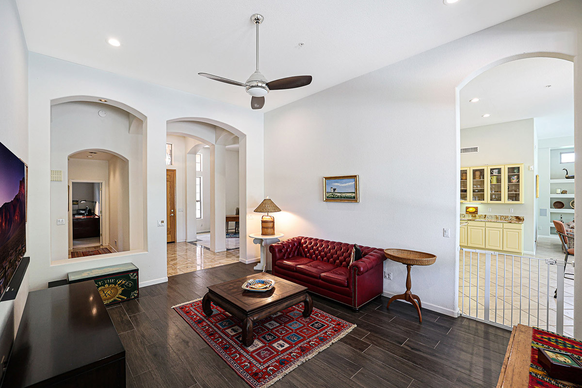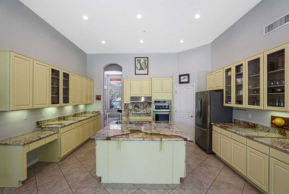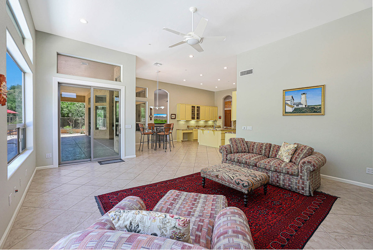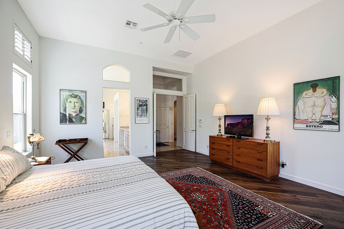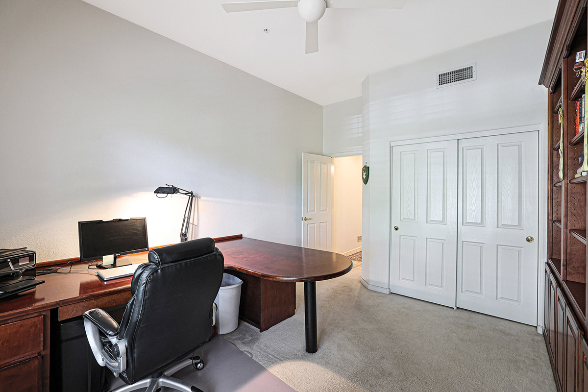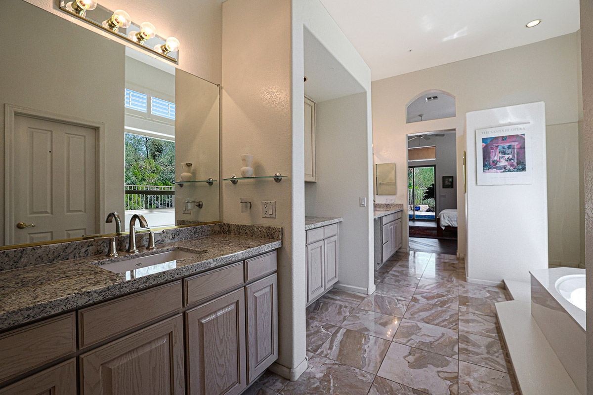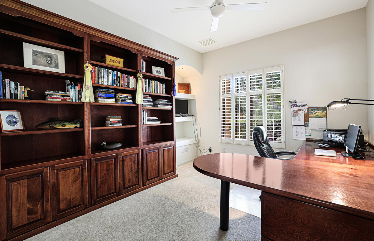 Inside the home you will find a single level, no steps floor plan with 3,174 square feet of split living space. On one wing of the home is the large master bedroom with exterior access and a master bath with dual vanities, separate shower and tub, and a walk-in closet. Down a separate hall on the same wing is a guest bedroom (currently used as an office with built-in desk and bookshelves) with access to the adjacent hall bathroom. Two additional guest rooms and another hall bath are on the opposite wing.