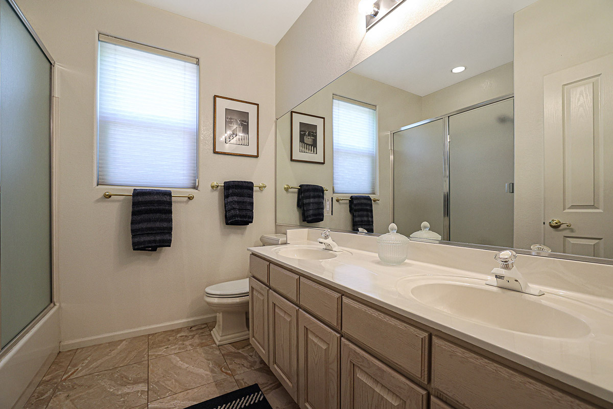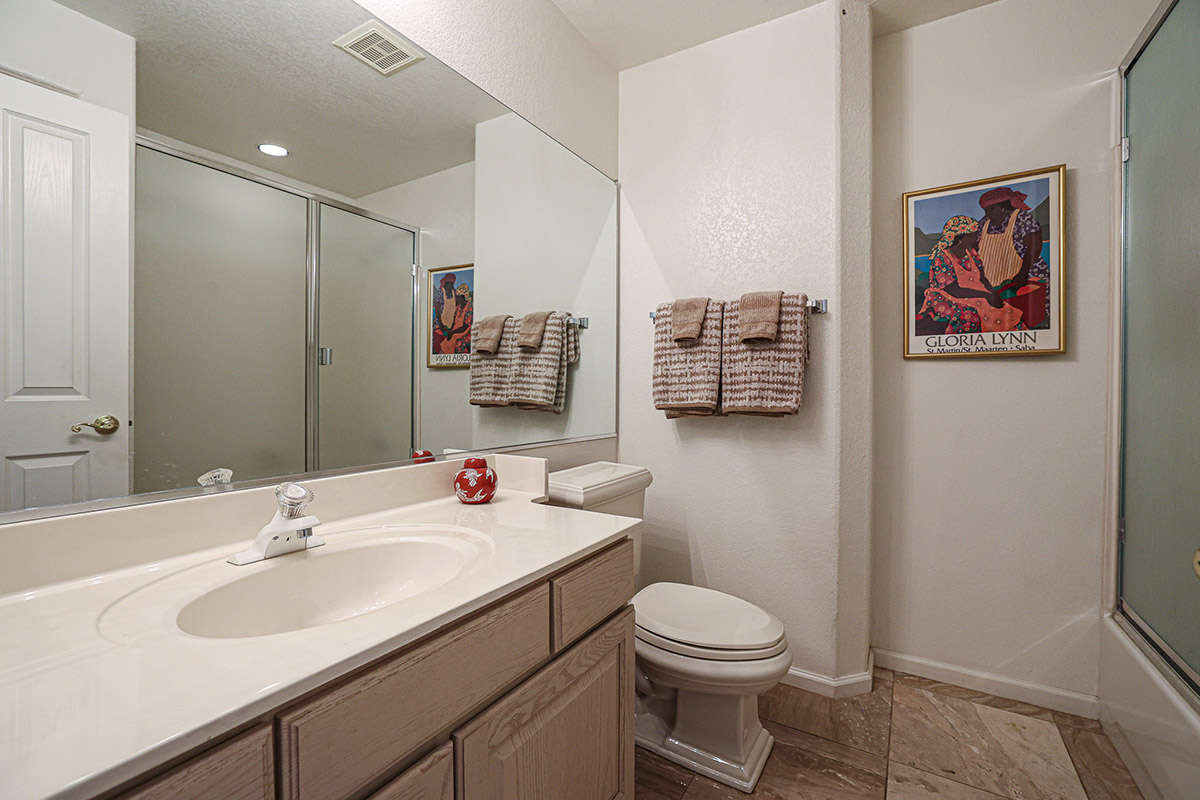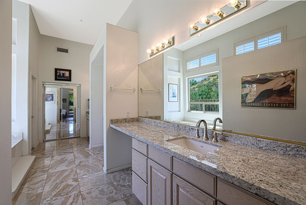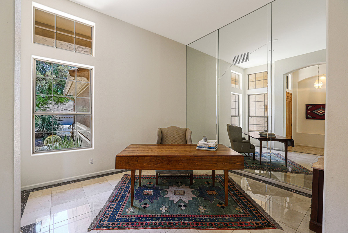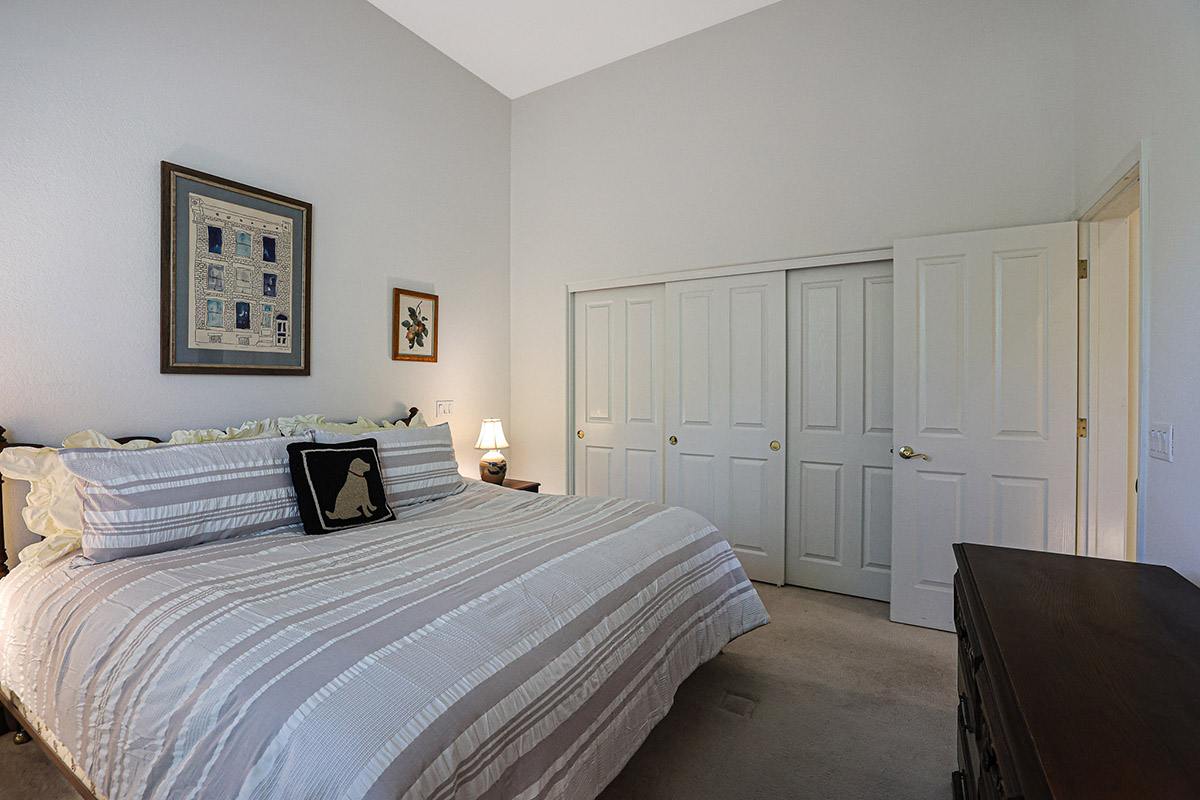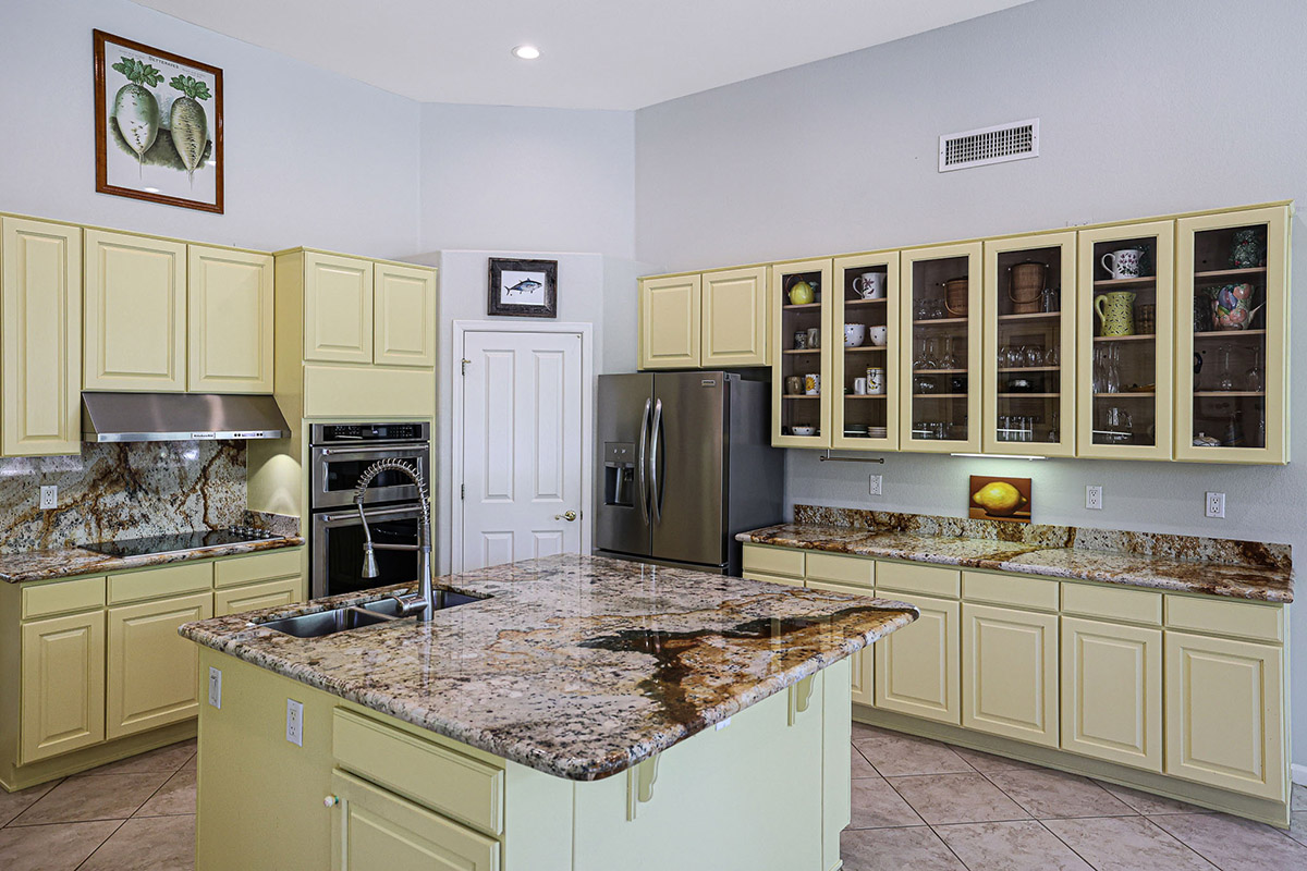 Inside the home you will find a single level, no steps floor plan with 3,174 square feet of split living space. On one wing of the home is the large master bedroom with exterior access and a master bath with dual vanities, separate shower and tub, and a walk-in closet. Down a separate hall on the same wing is a guest bedroom (currently used as an office with built-in desk and bookshelves) with access to the adjacent hall bathroom. Two additional guest rooms and another hall bath are on the opposite wing.