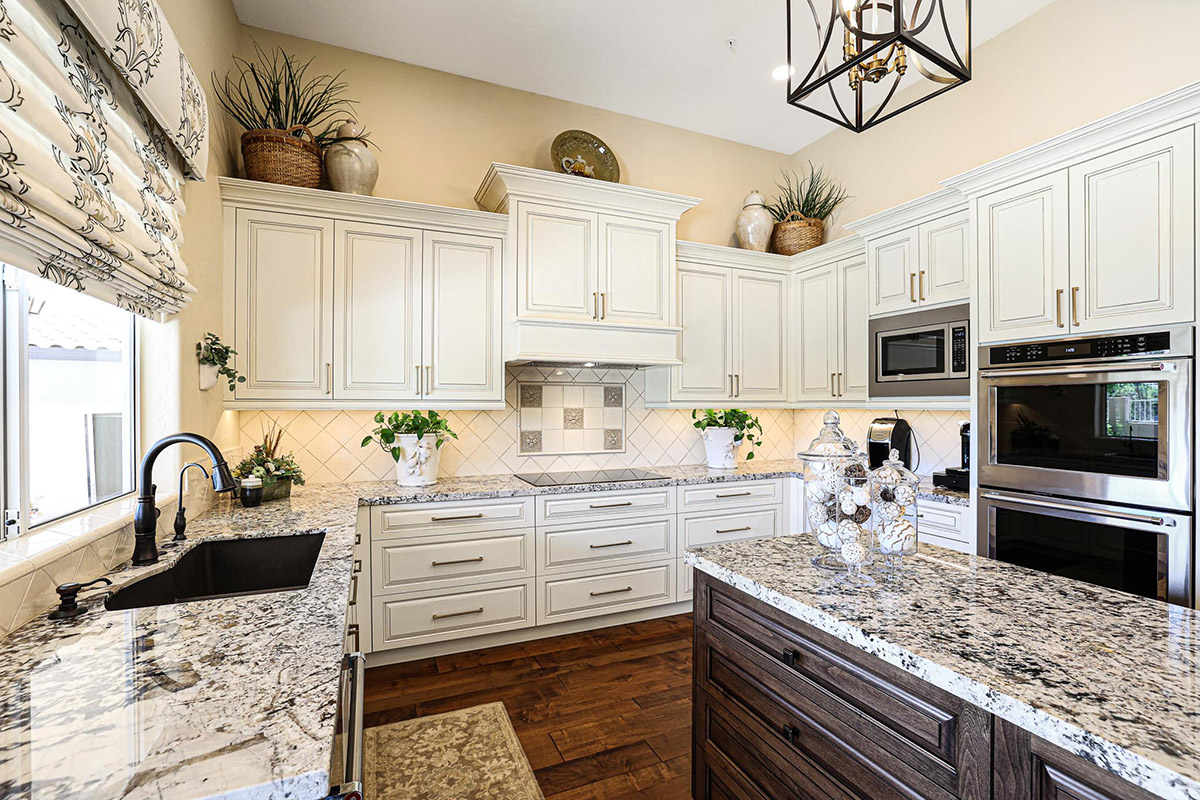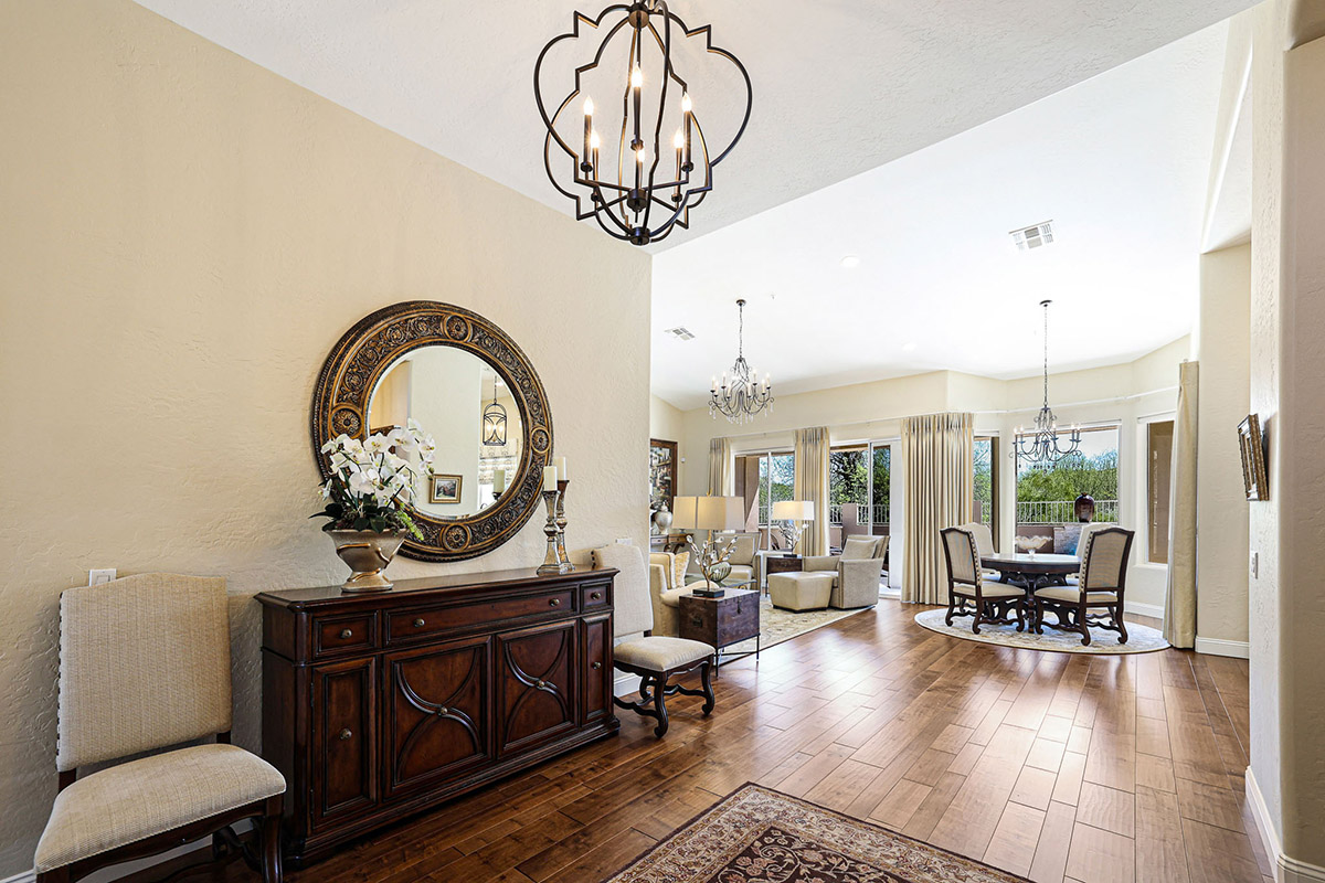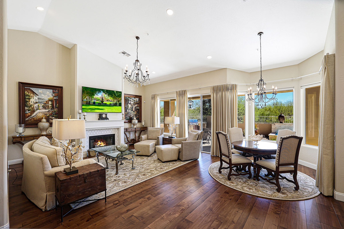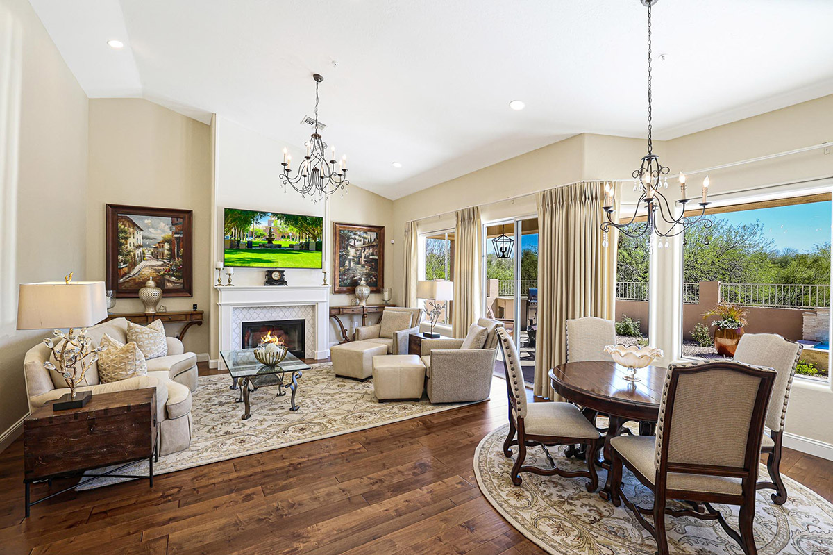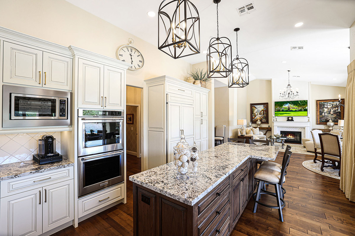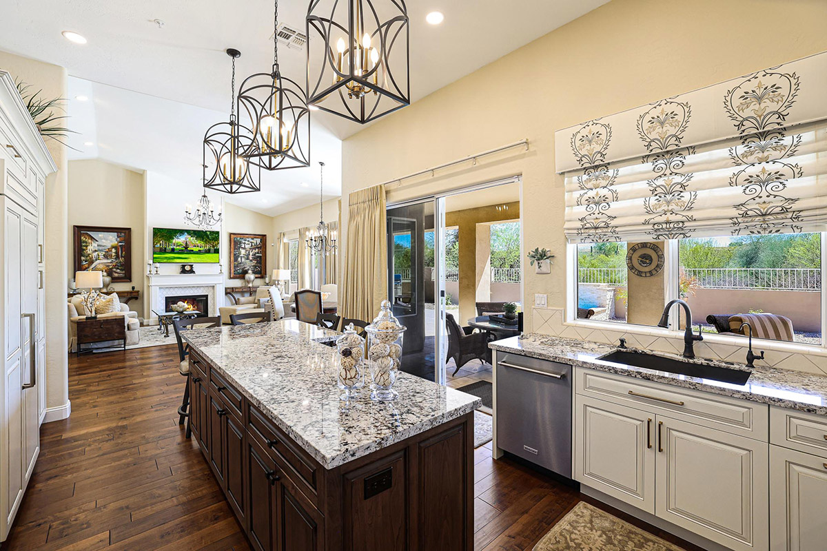 The kitchen is well thought out highlighted by custom cabinetry with crown molding and pull out drawers, center island with seating, reverse osmosis, KitchenAid appliance package including an induction cooktop and two full size wall ovens, and access to the exterior and the rotunda style dining space. The family room has vaulted ceilings and a centerpiece gas fireplace with mosaic tile surround.