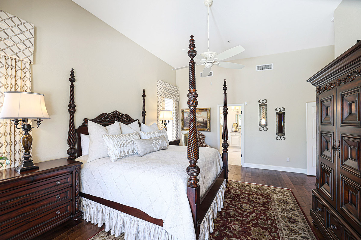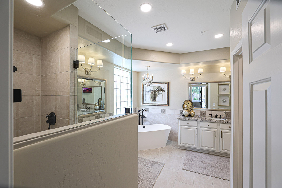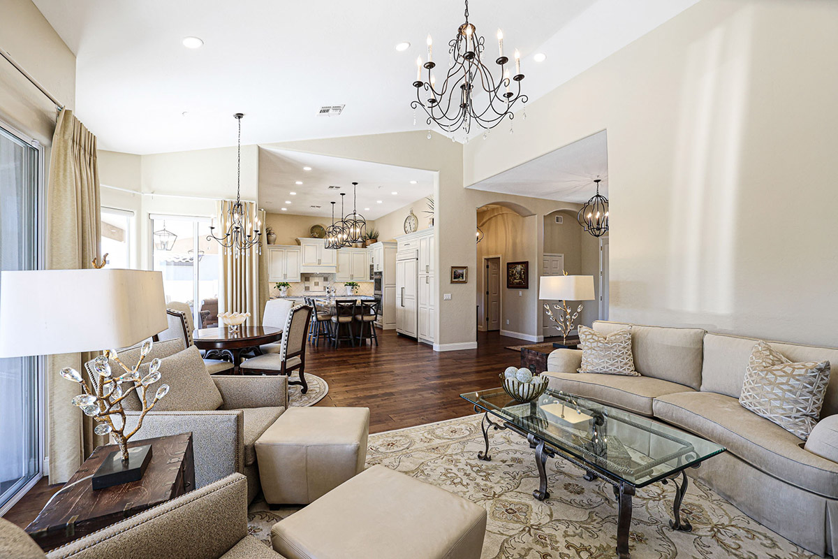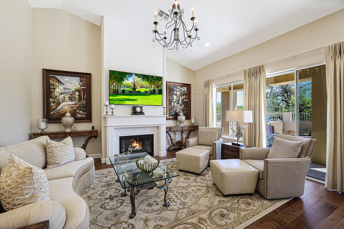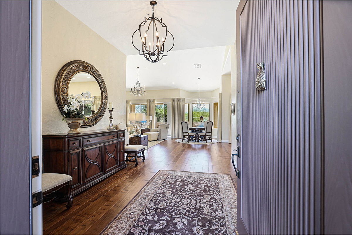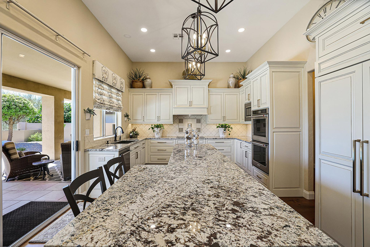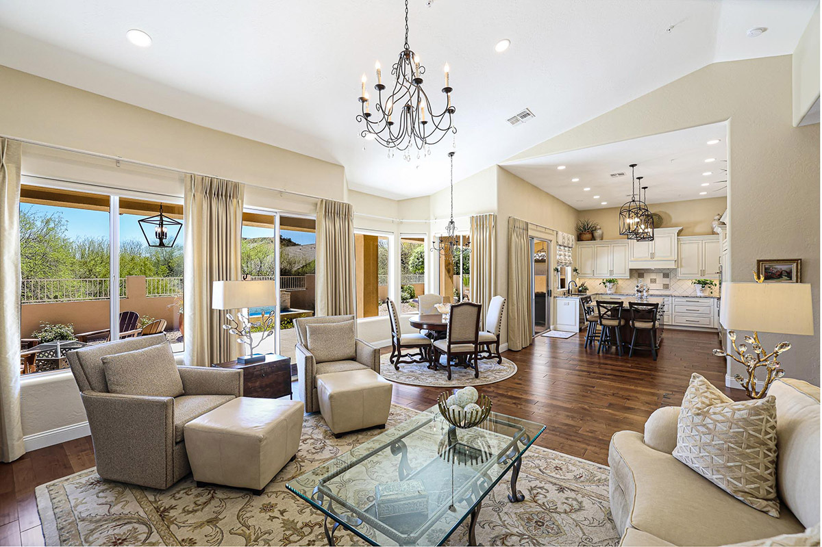 The kitchen is well thought out highlighted by custom cabinetry with crown molding and pull out drawers, center island with seating, reverse osmosis, KitchenAid appliance package including an induction cooktop and two full size wall ovens, and access to the exterior and the rotunda style dining space. The family room has vaulted ceilings and a centerpiece gas fireplace with mosaic tile surround.