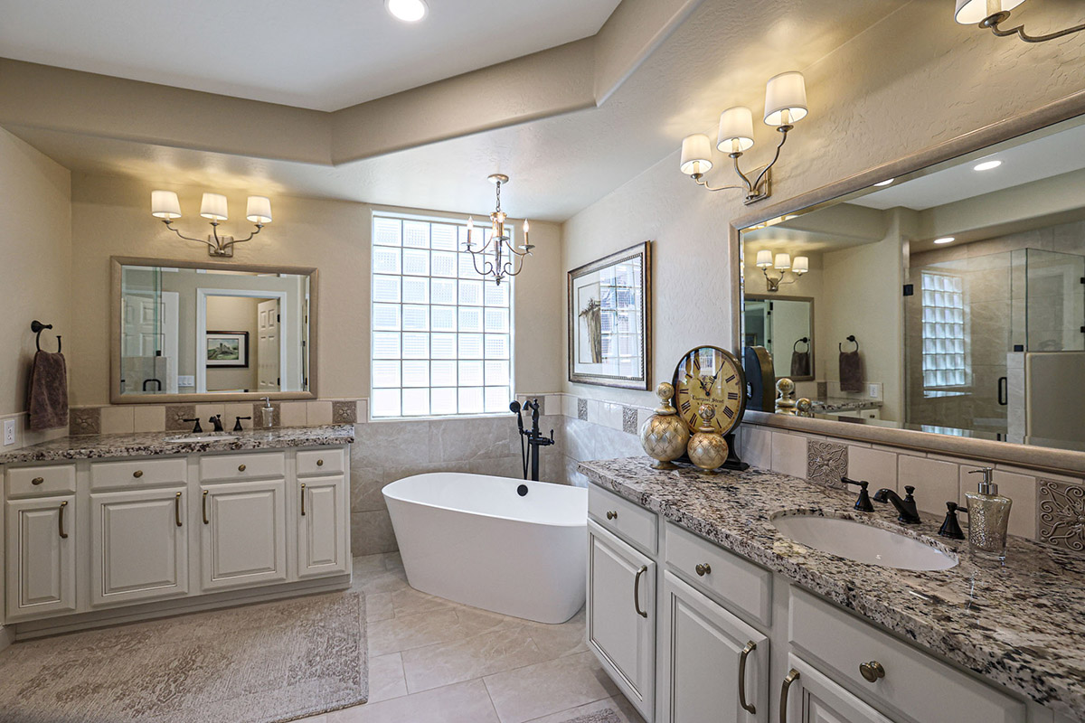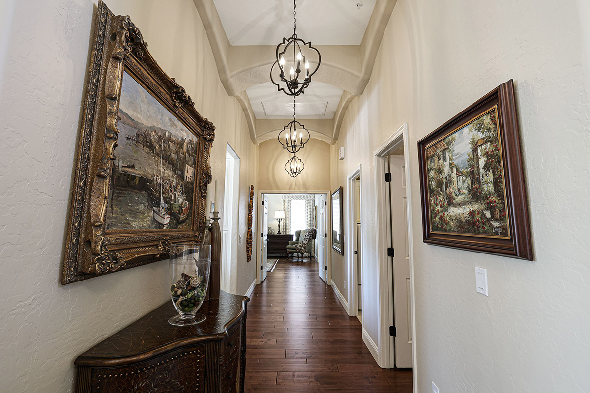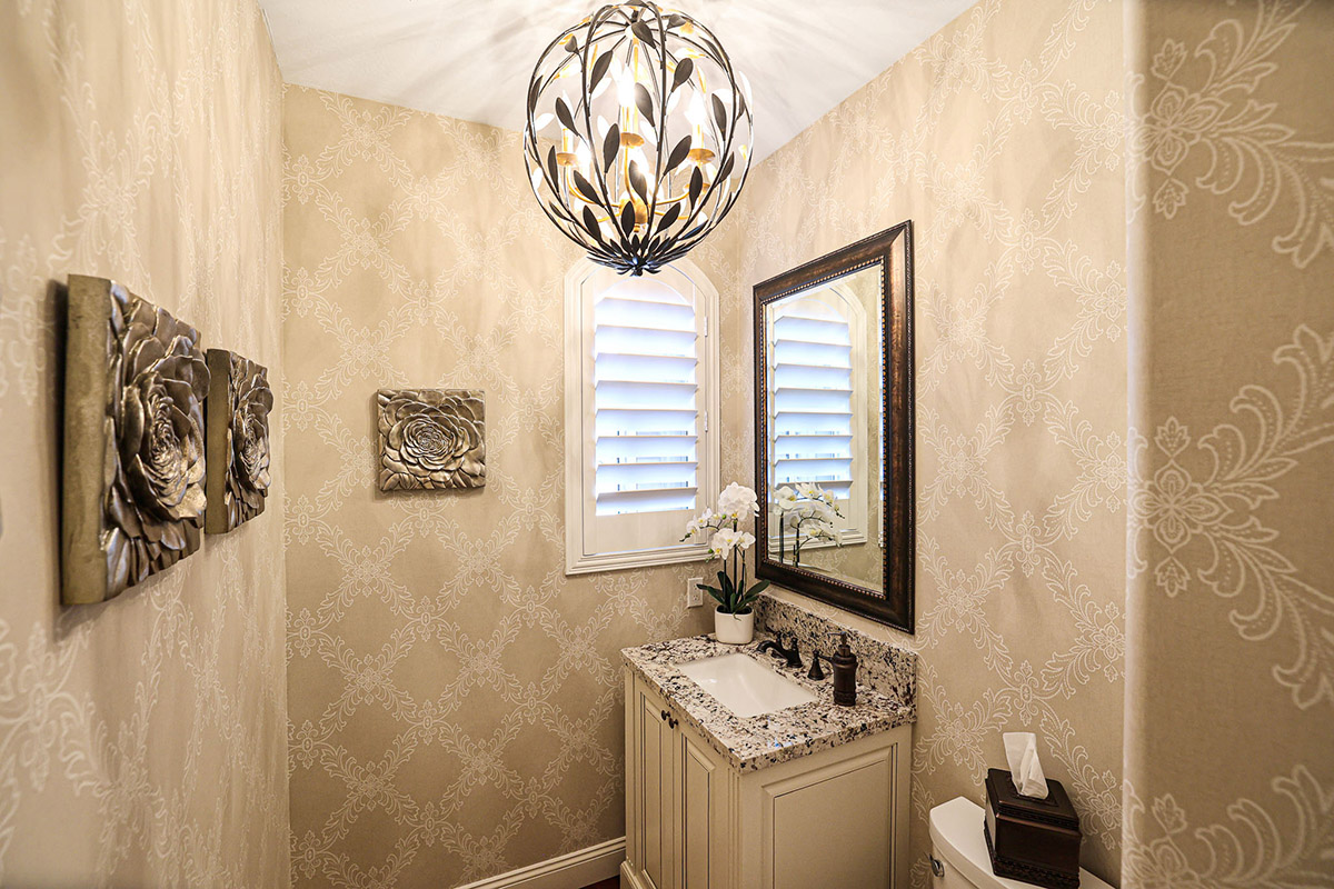 The hall leading to the master bedroom features decorative hanging lights and custom ceiling details. The master bedroom also has access to the exterior and a completely renovated bathroom including dual vanities, walk-in closet, freestanding soaking tub, private water closet and separate shower. Two additional guest suites share the hall bathroom also renovated with on trend features. The powder bath is perfect for visiting guests highlighted by the beautiful wall treatment.