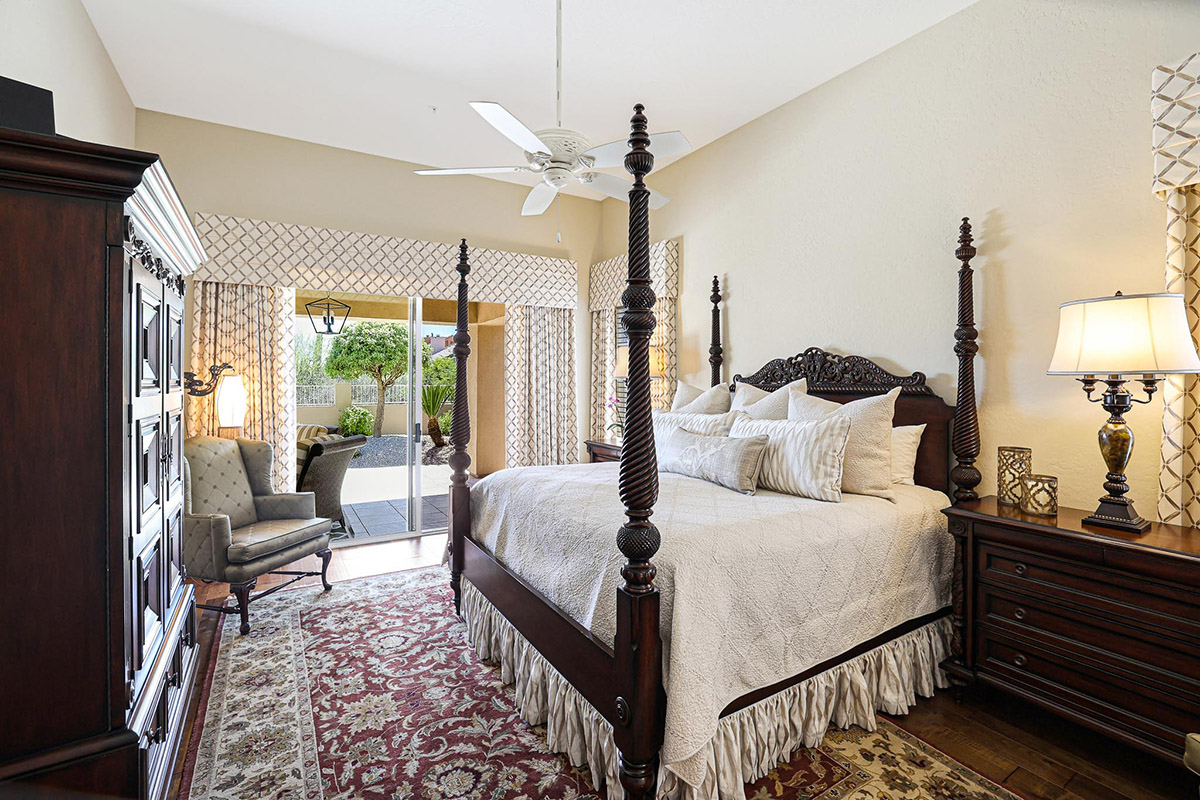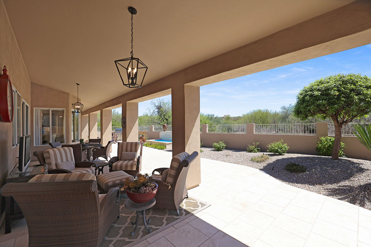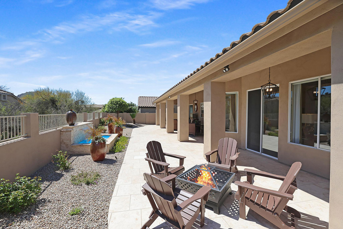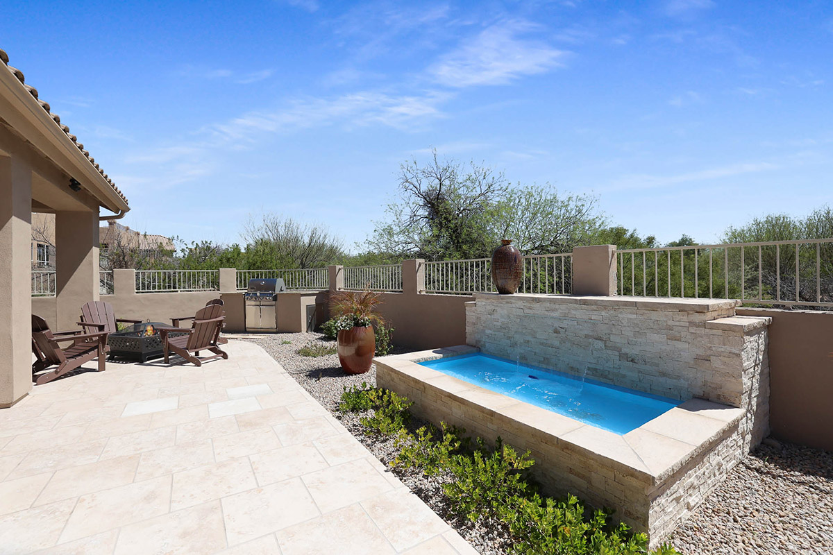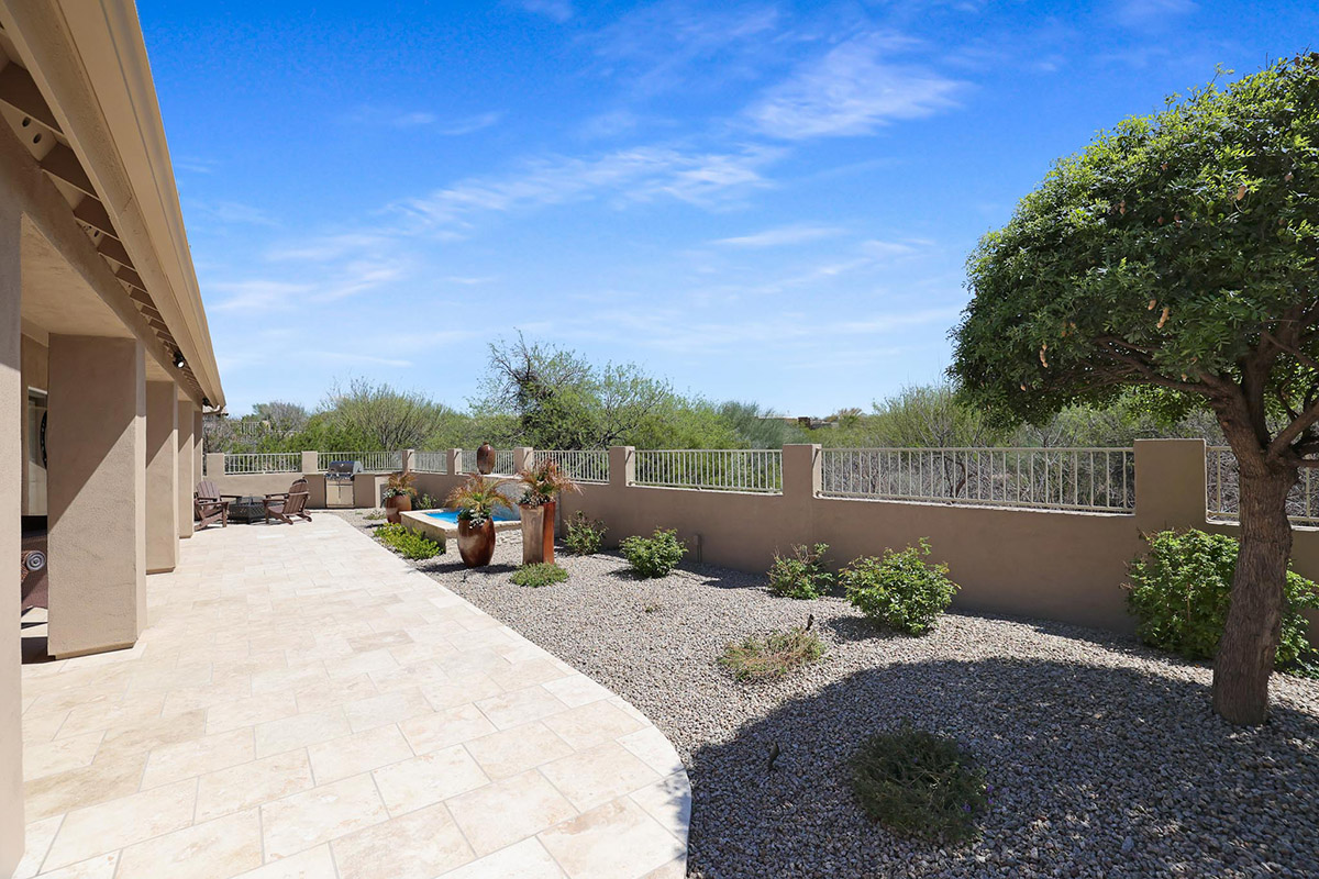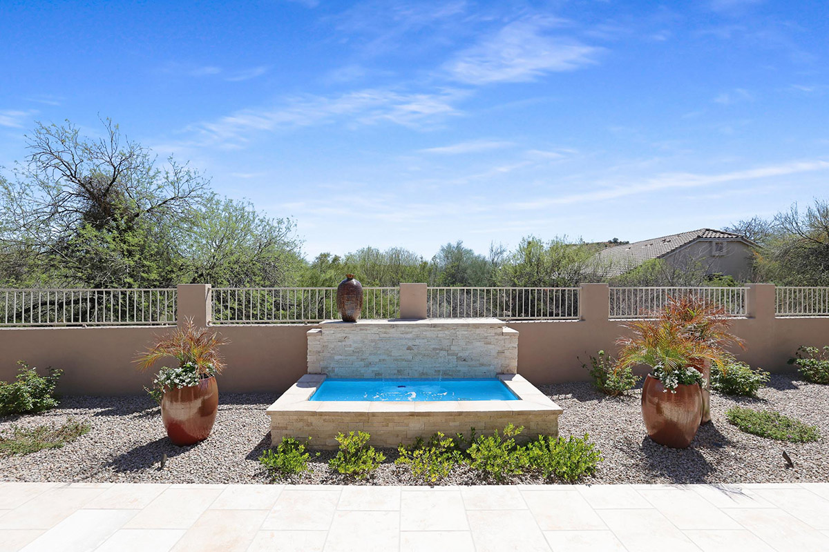 Outside you will find custom travertine pathways and patios, a soothing water feature, built-in barbecue, covered areas for dining, and easy maintenance landscaping. Other features include: automatic interior shades and plantation shutters, nice sized laundry with sink and two storage closets; three car garage; stone counters; 2020 HVAC unit; and so much more!