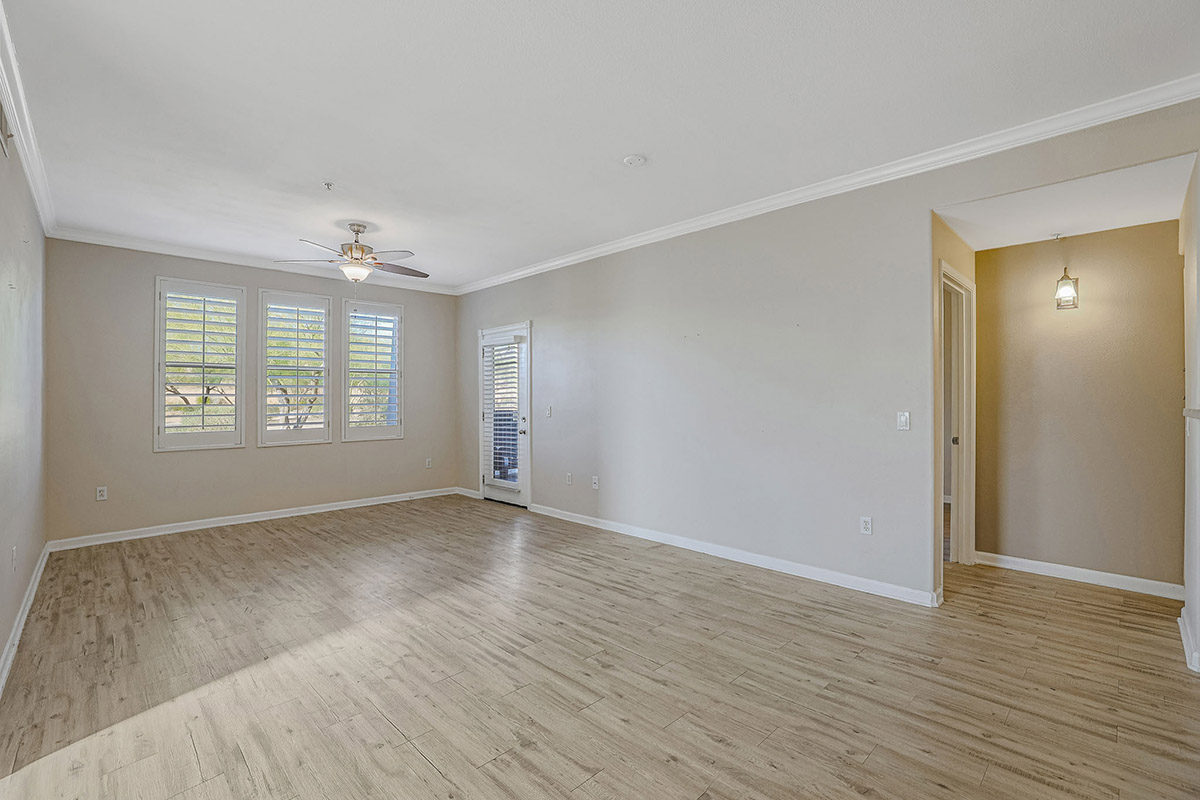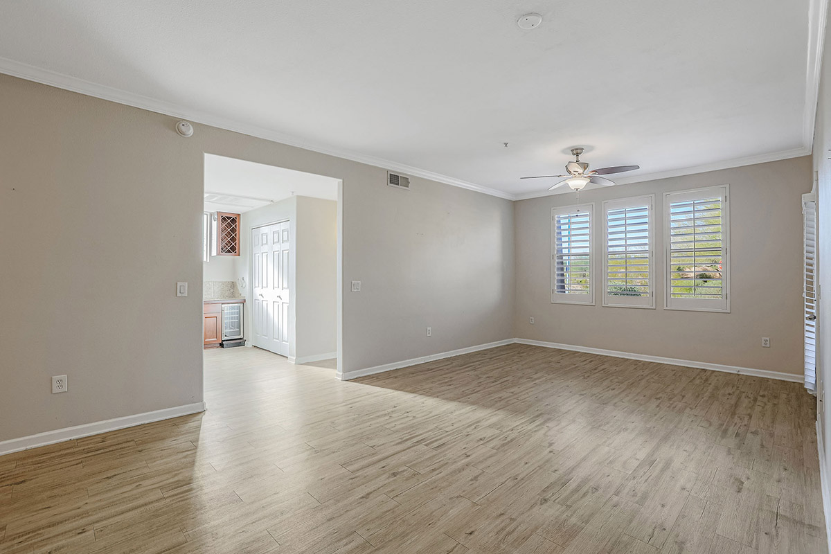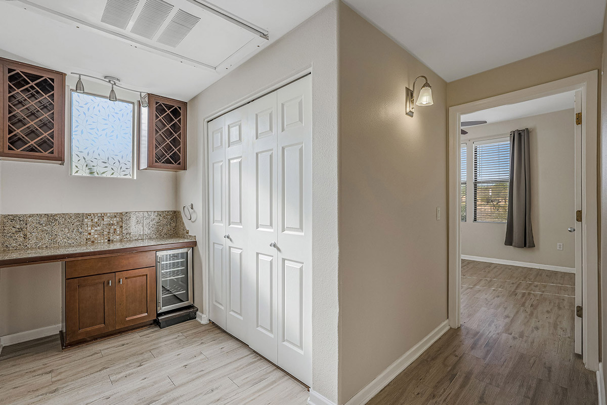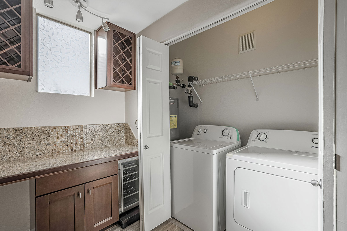 Lots of natural light can be found in the living and bedroom spaces. The master bedroom has access to the covered patio and the bathroom has two closets and a large tiled walk-in shower. The guest bedroom is adjacent to the guest bathroom split from the master. The laundry space has additional cabinetry and counter space for storage with a wine/beverage fridge. Plantation shutters in the great room, ceiling fans, and wood look laminate flooring complete this charming condo. Two designated parking spaces are included (one covered and one partially covered).