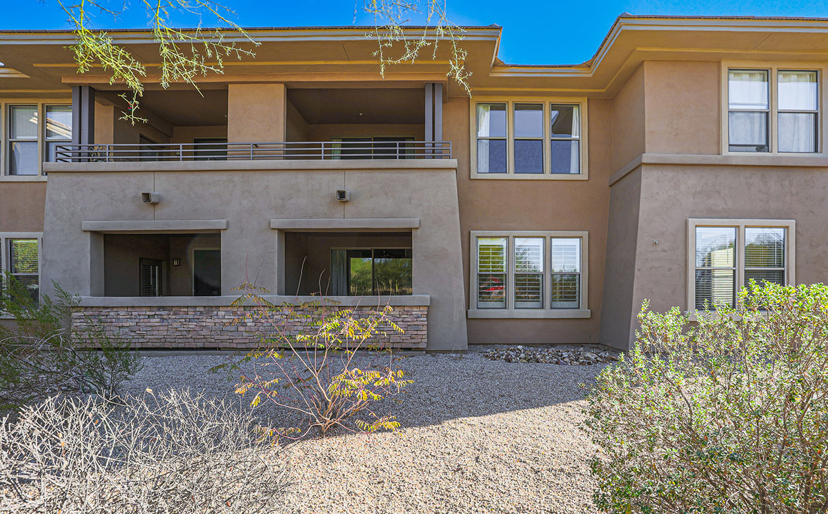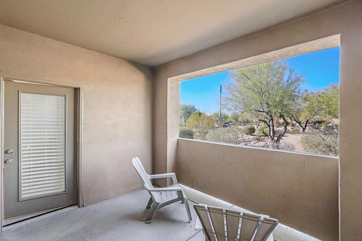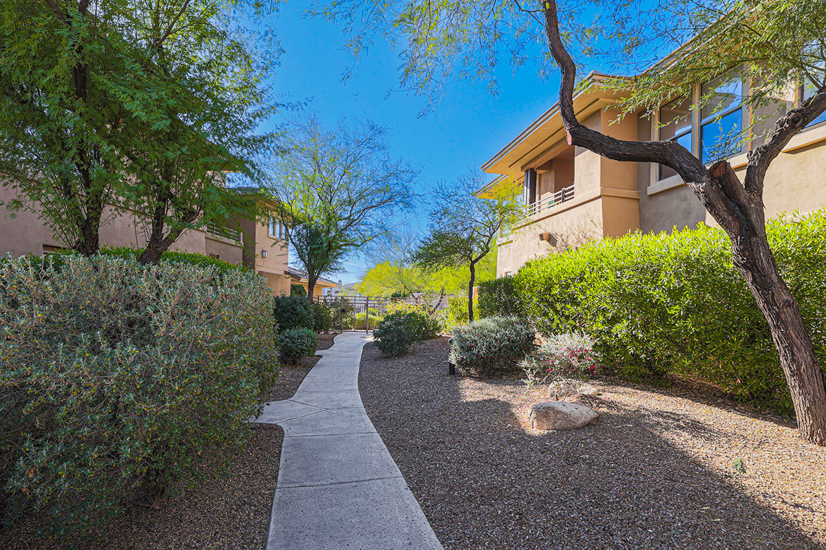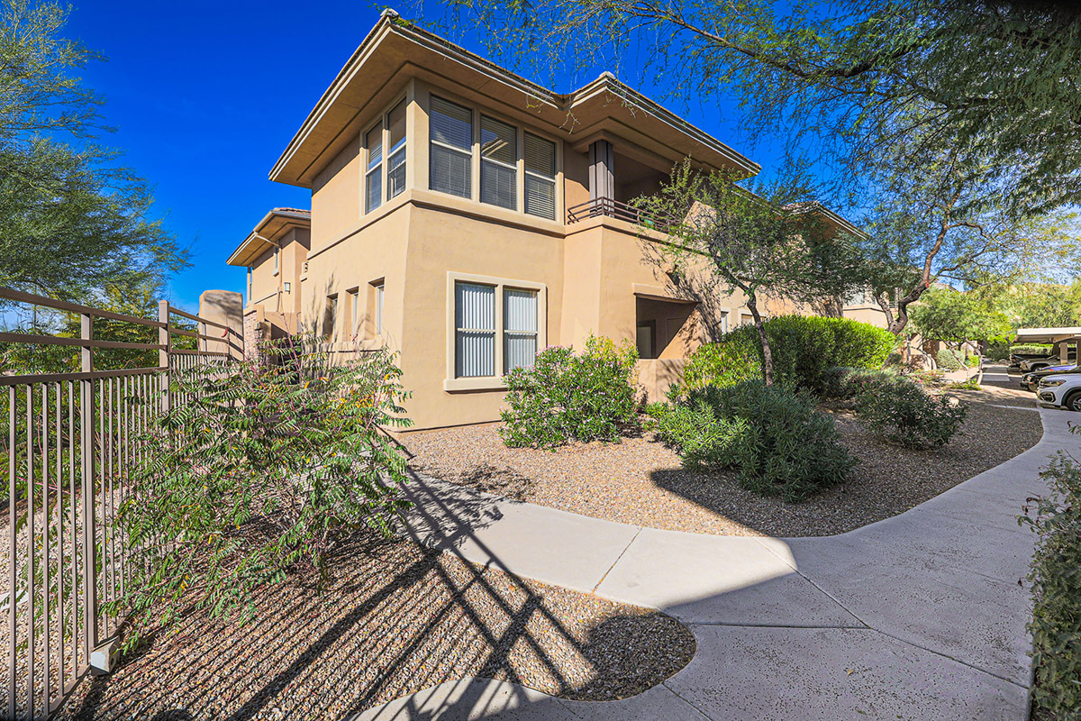 Perfect lock-n-leave or easy maintenance living in gated Grayhawk that’s move-in ready! Remodeled to a modern design in 2016, this two bedroom, two bath condo is a ground floor, end-unit with no stairs. The kitchen features on-trend finishes with beautiful quartz counters, stainless steel appliances, subway tile backsplash, soft close cabinet doors and drawers, pantry, and a bar top seating area.