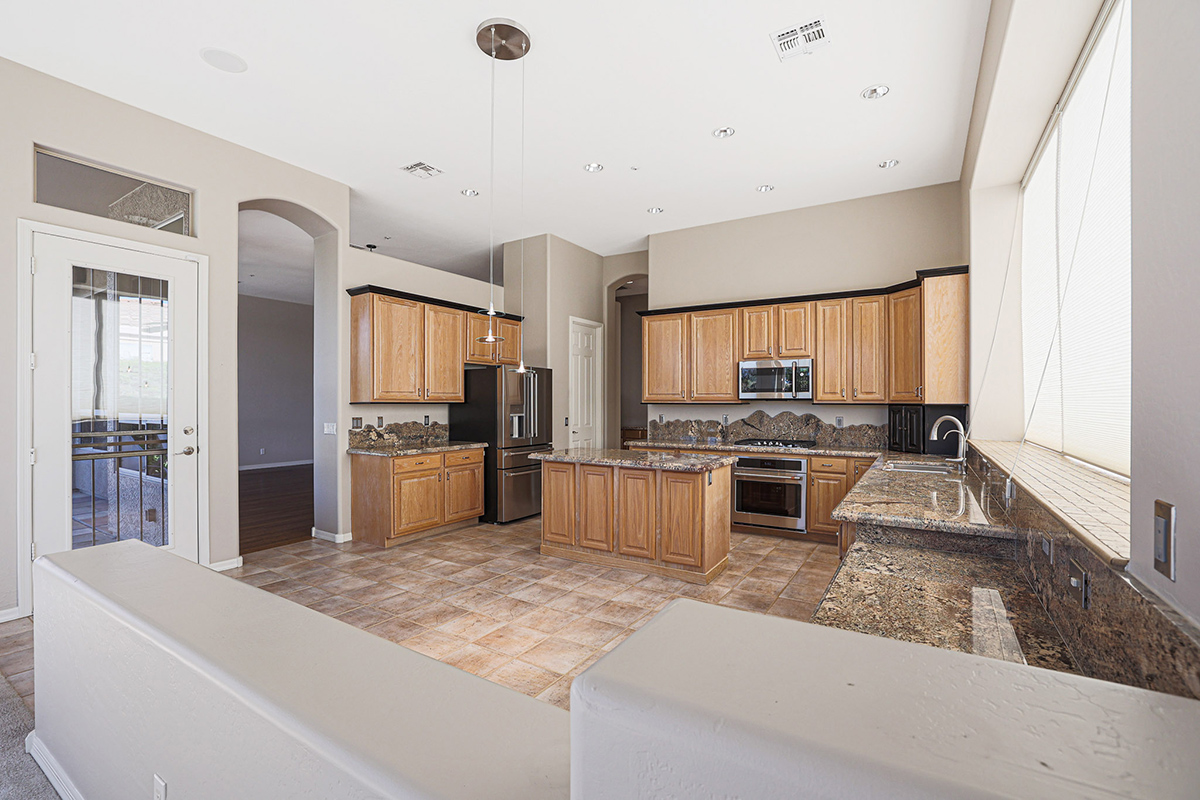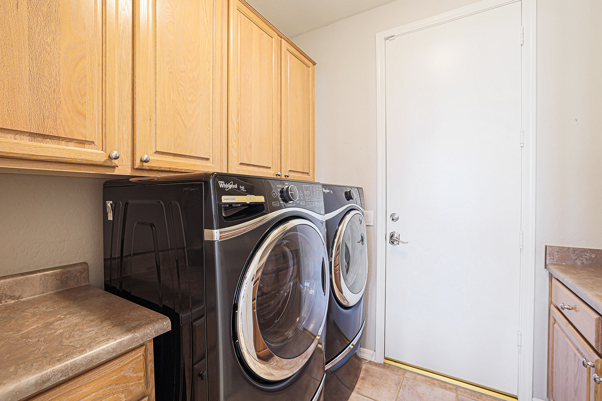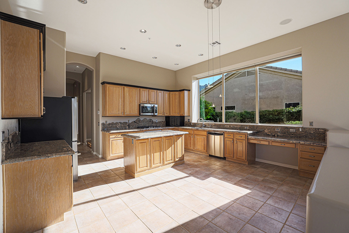 The kitchen has ample counter and cabinet space, granite counters, island, walk-in pantry, stainless steel appliances and is open to the family room with exterior access and gas fireplace. Two guest rooms are adjacent to the hall bath along with a private office/den space. A three car garage with built-in cabinets and modular garage flooring and direct entry into the laundry room round out this wonderful home.