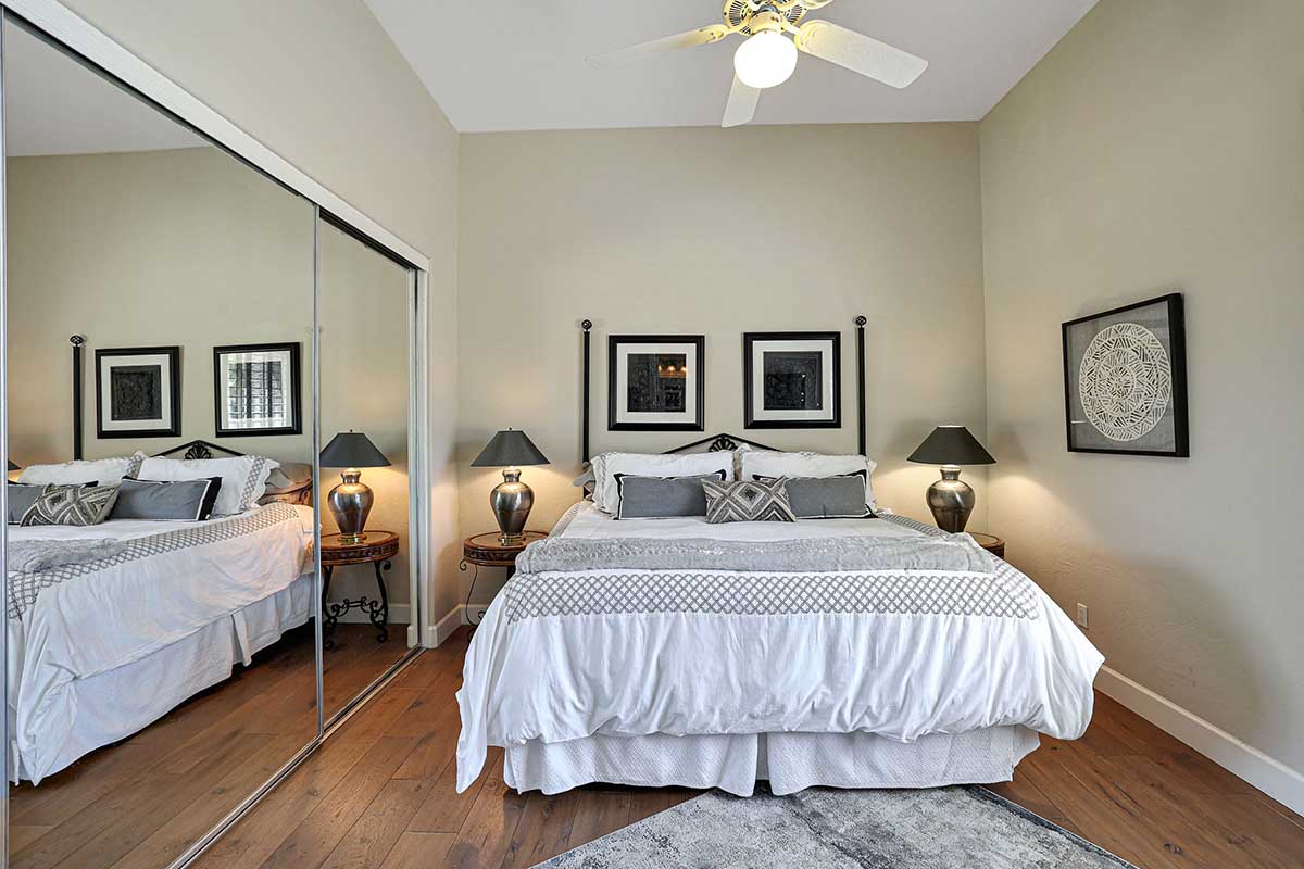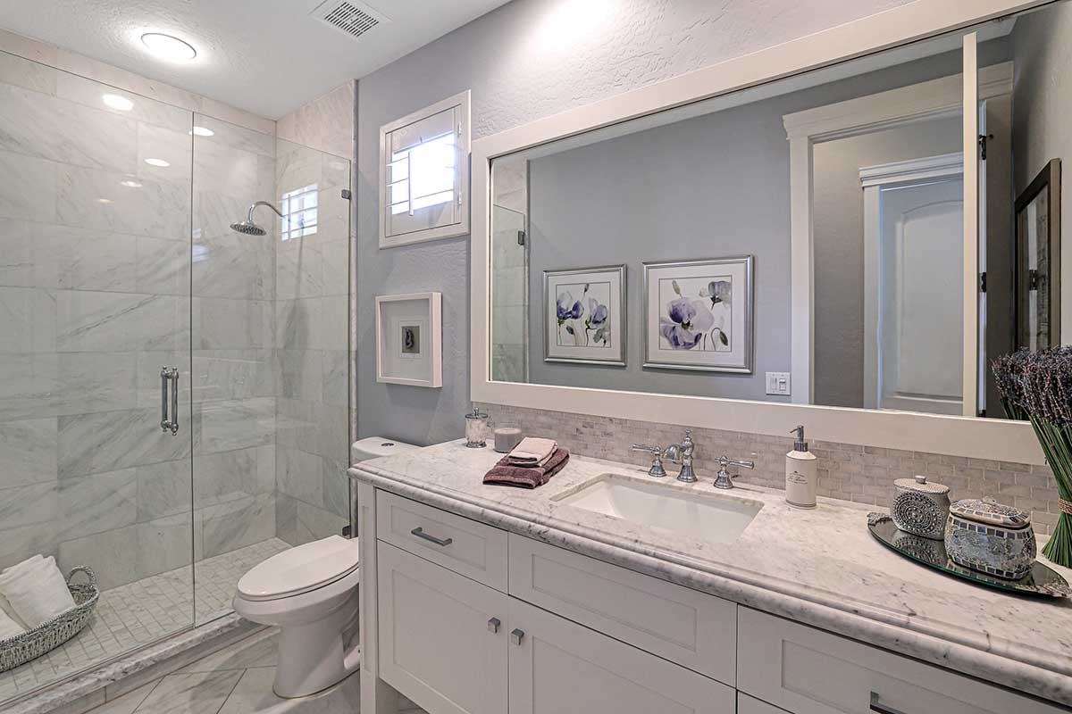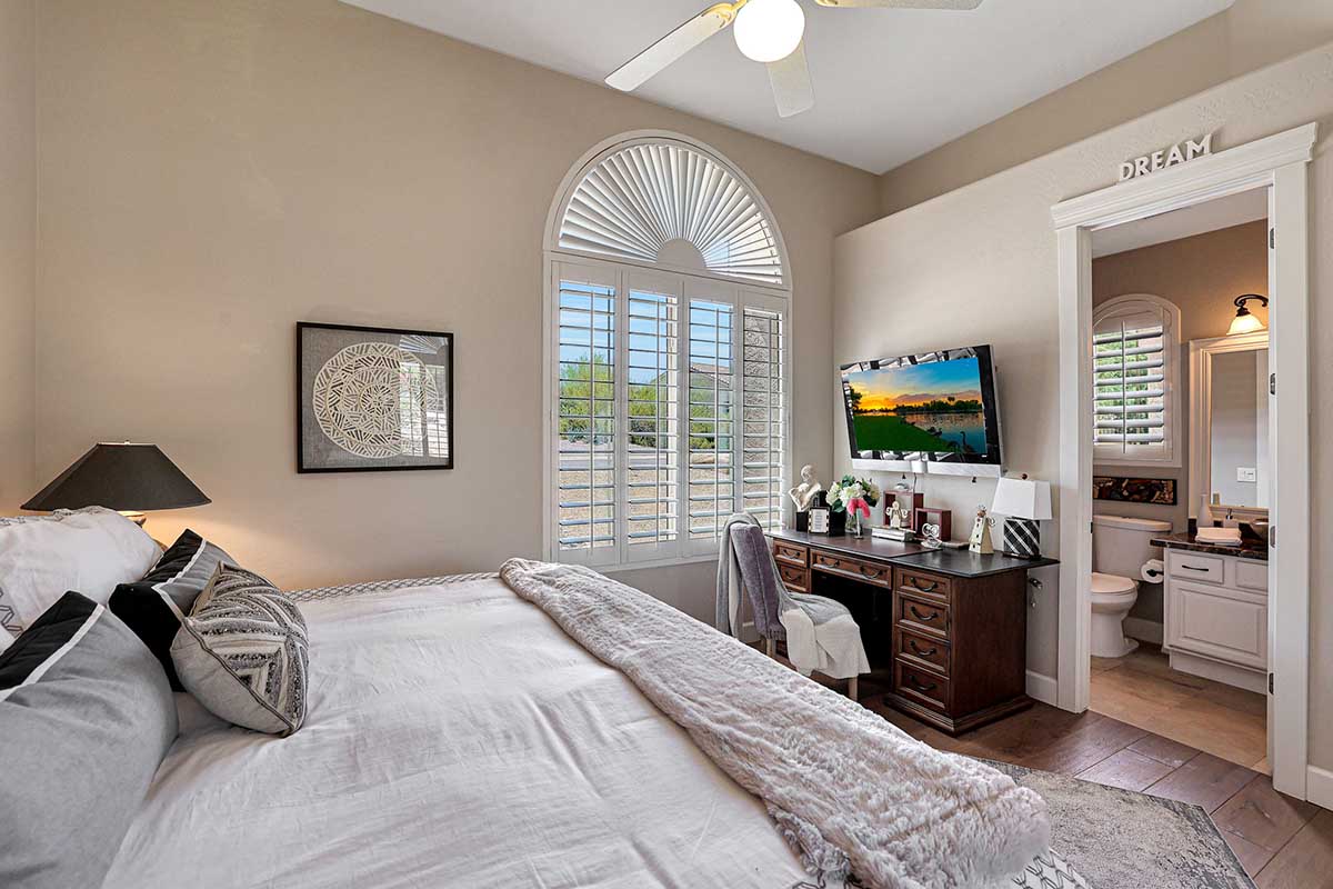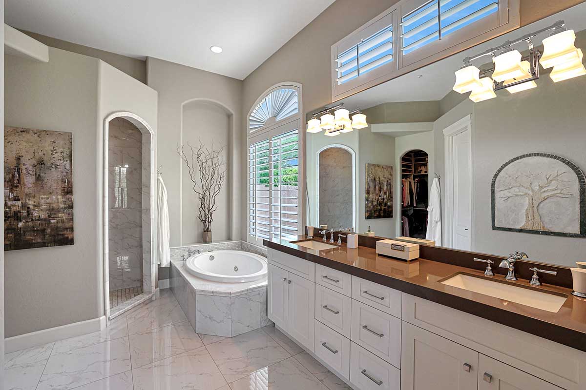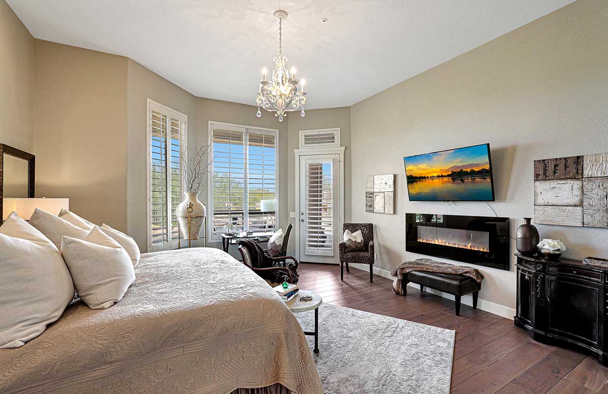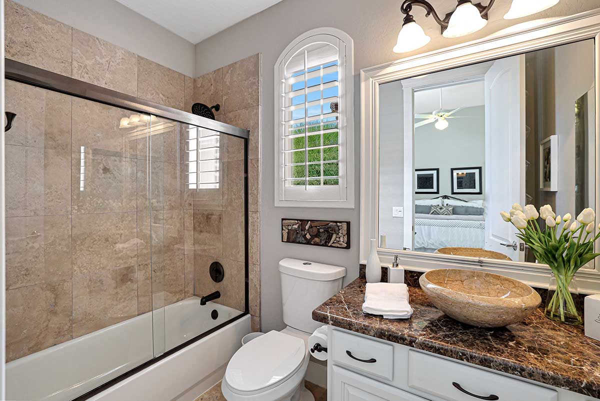 The master is split from the two guest bedrooms and has an electric fireplace, exterior access and a spa-like bath complete with marble accents, arched entry walk-in shower, soaking tub, and large closet with built-ins. One guest bedroom is ensuite and the other guest bedroom is adjacent to the hall bath with a furniture quality vanity and marble stone details.