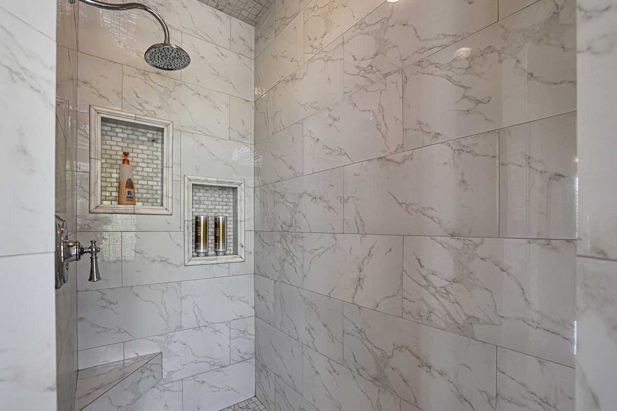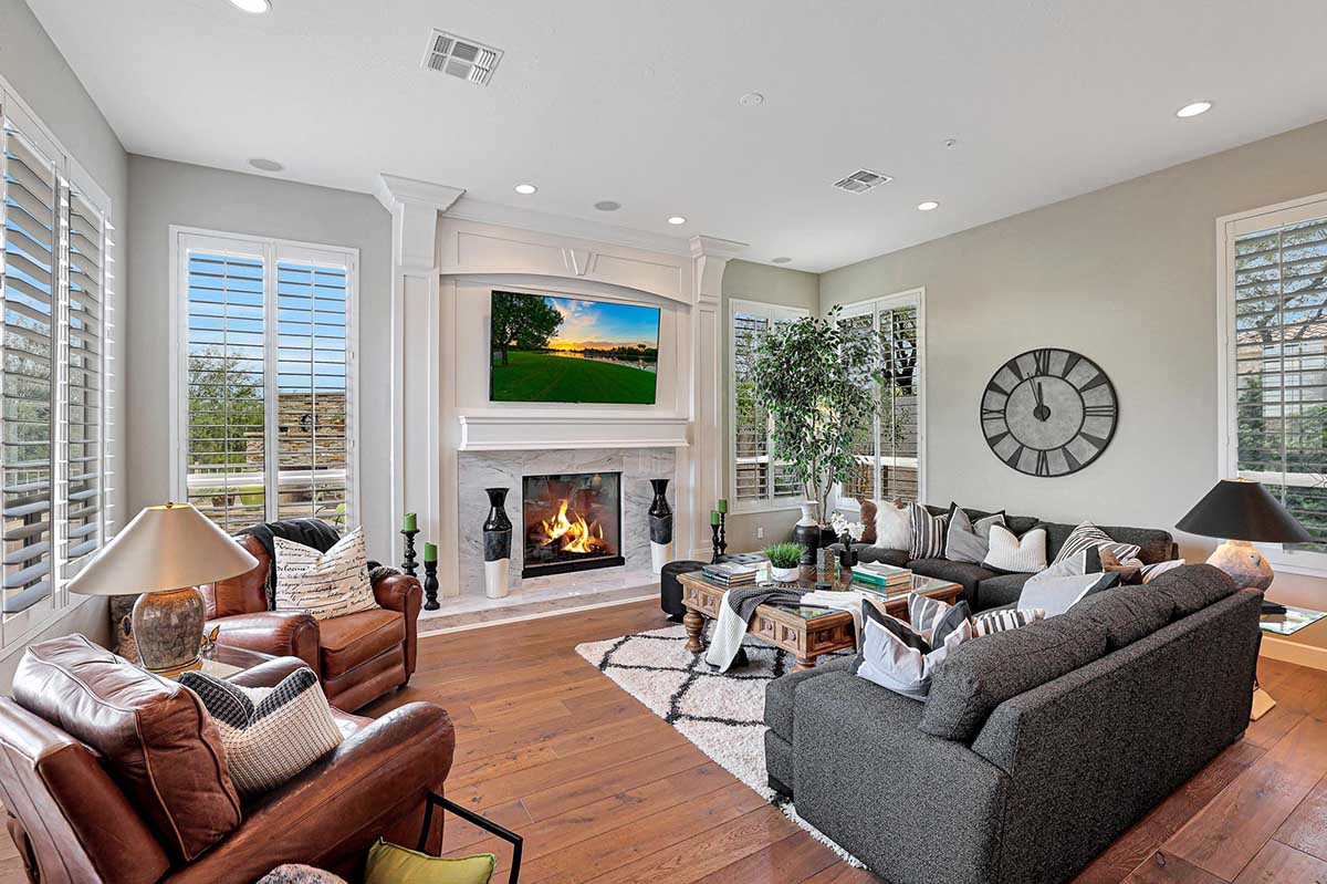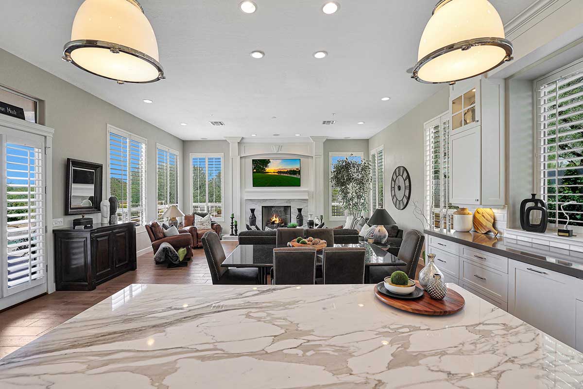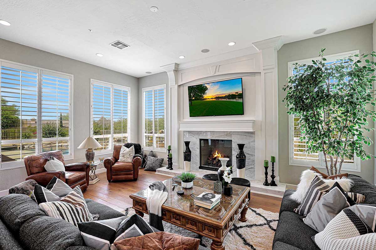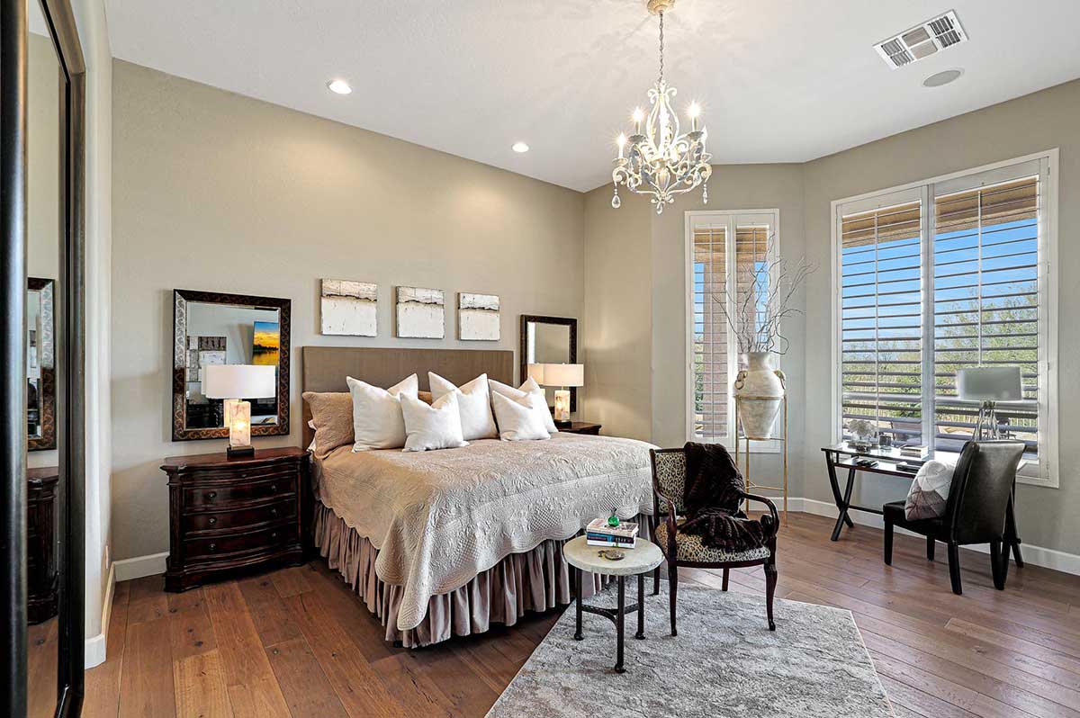 The master is split from the two guest bedrooms and has an electric fireplace, exterior access and a spa-like bath complete with marble accents, arched entry walk-in shower, soaking tub, and large closet with built-ins. One guest bedroom is ensuite and the other guest bedroom is adjacent to the hall bath with a furniture quality vanity and marble stone details.