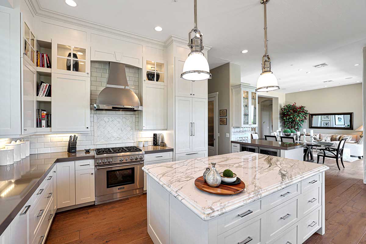 The family room is adjacent to the kitchen and has a centerpiece gas fireplace with marble surround and wood casing. The kitchen is a chef’s dream including a marble clad center island, perimeter quartz counters, stainless steel Thermador gas stove and custom vent hood, matching paneled fridge and dishwasher, microwave drawer, custom cabinetry stretching to the ceiling with glass displays and open shelving, expanded pantry with seeded glass door, and a peninsula bar with display cabinetry and built in beverage and wine fridges.