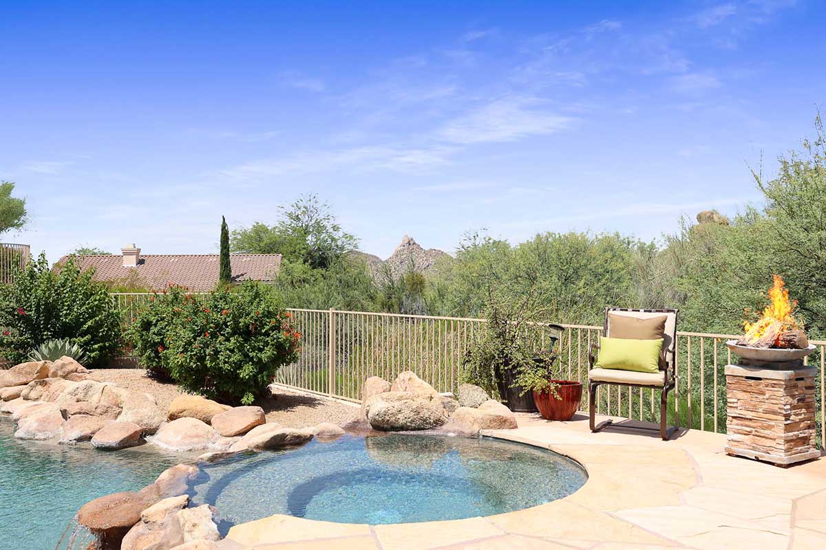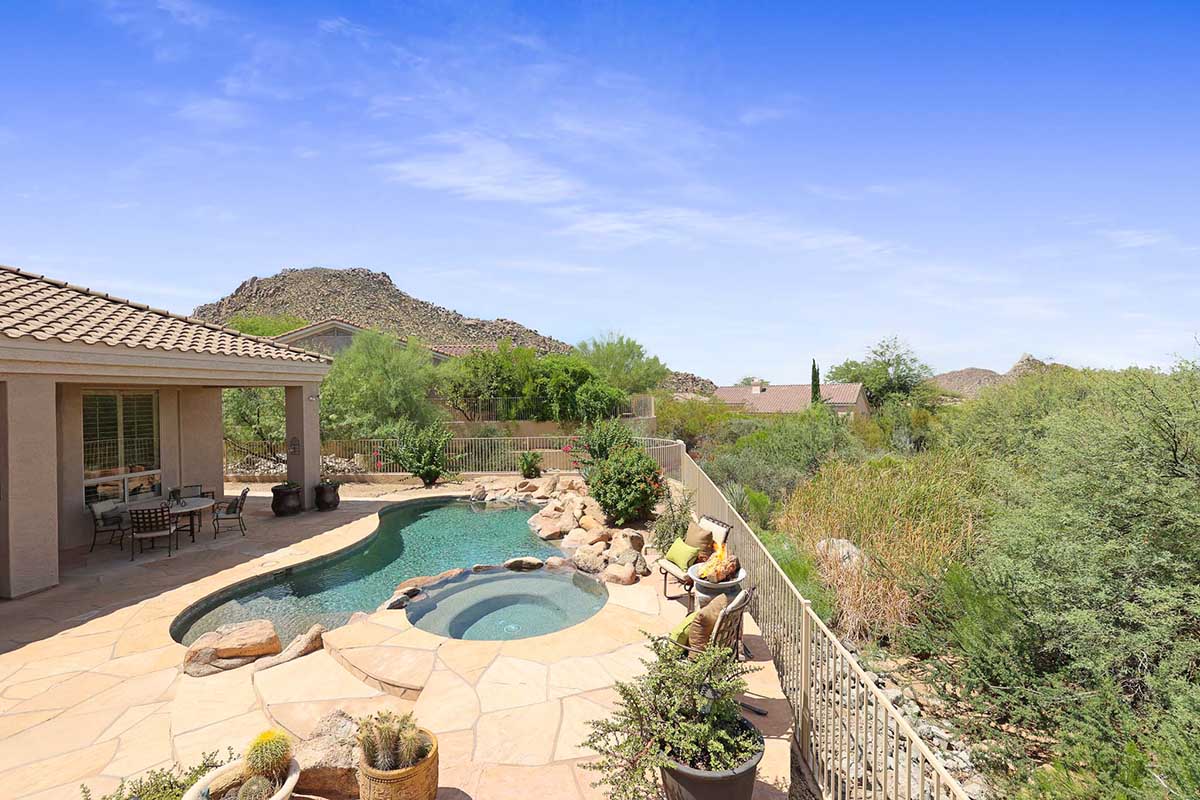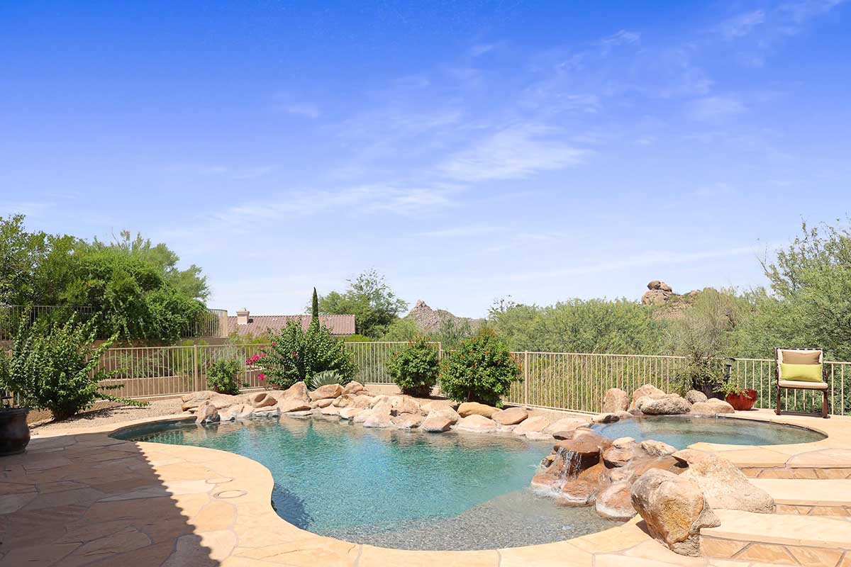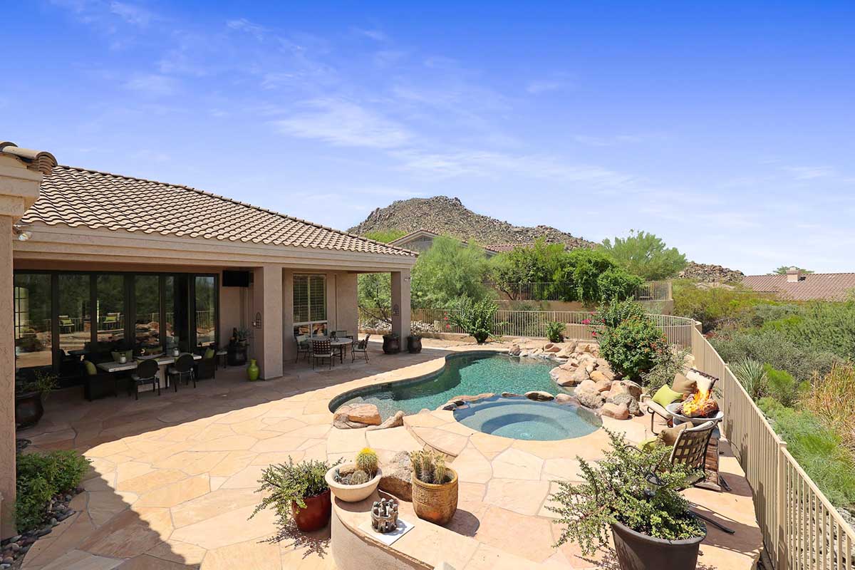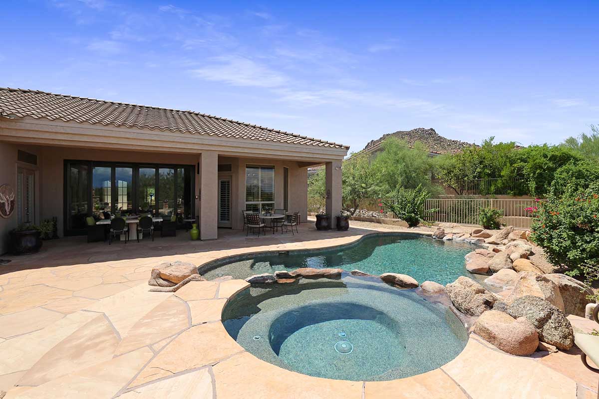The numerous windows and doors in the great room allow for natural light and overlook the resort style backyard with beautiful views of Pinnacle Peak, boulder outcroppings and famous Arizona sunsets. The backyard includes a heated pebbletec pool and spa, boulder and rock waterfall accents, easy care landscaping, flagstone hardscape, large covered patio, stacked stone gas fireplace, and built-in barbecue. The lot backs and sides to the natural area open space for additional privacy with desirable North/South exposure.