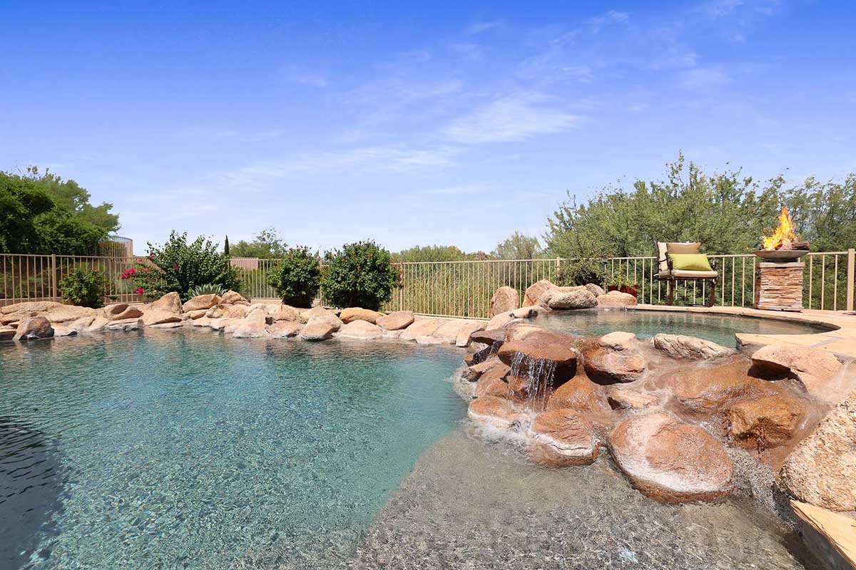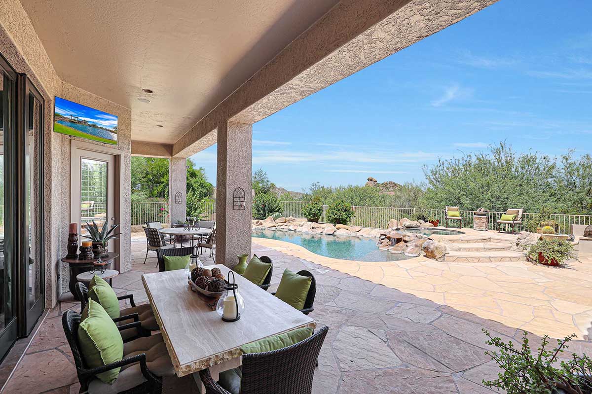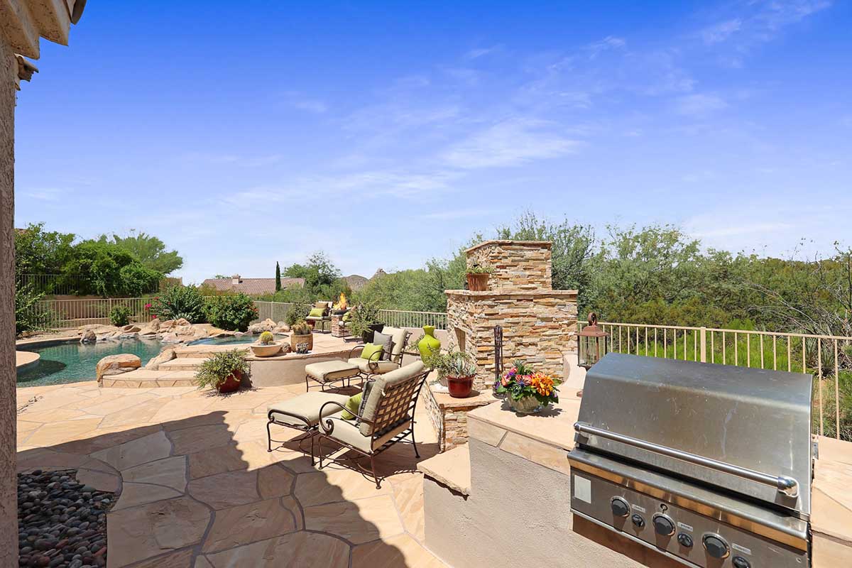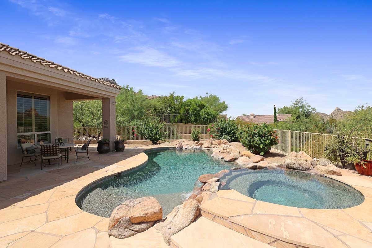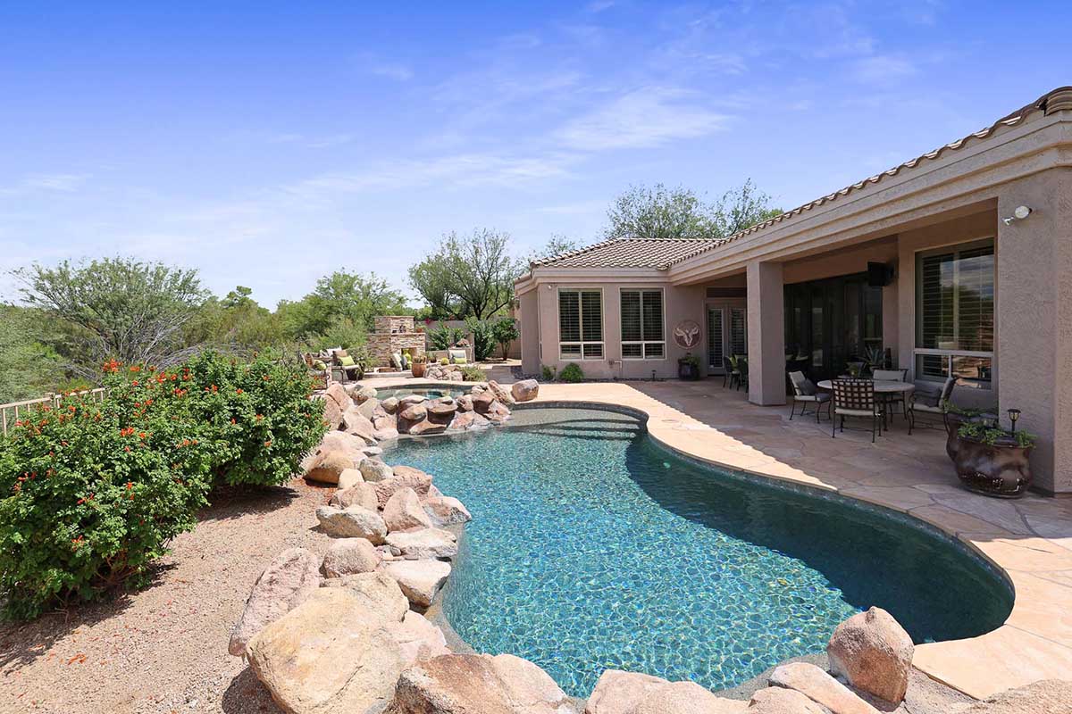 The numerous windows and doors in the great room allow for natural light and overlook the resort style backyard with beautiful views of Pinnacle Peak, boulder outcroppings and famous Arizona sunsets. The backyard includes a heated pebbletec pool and spa, boulder and rock waterfall accents, easy care landscaping, flagstone hardscape, large covered patio, stacked stone gas fireplace, and built-in barbecue. The lot backs and sides to the natural area open space for additional privacy with desirable North/South exposure.