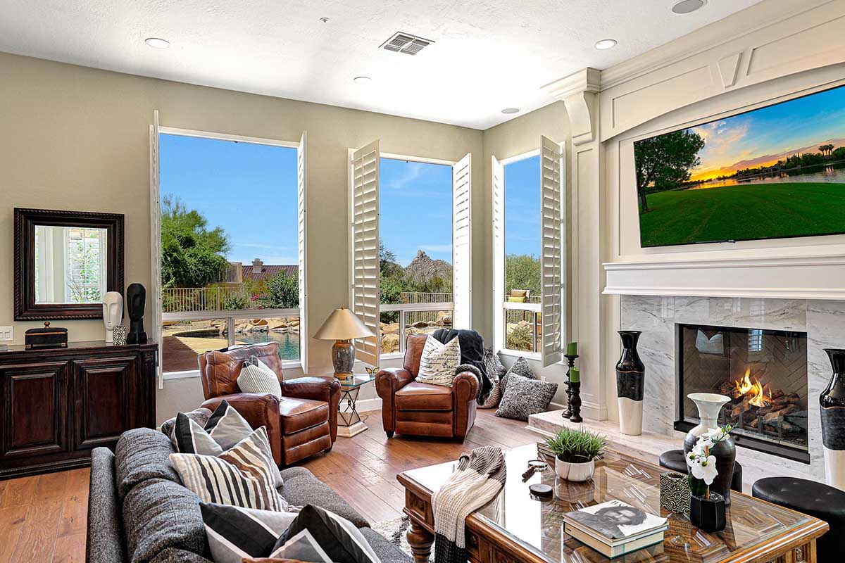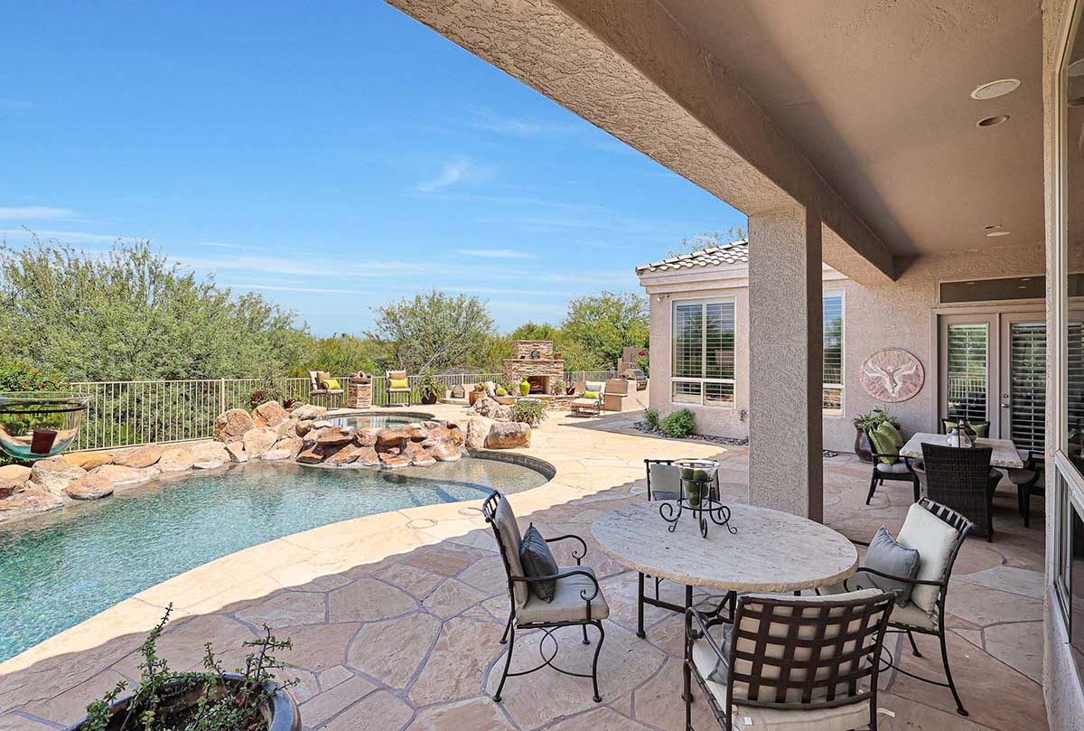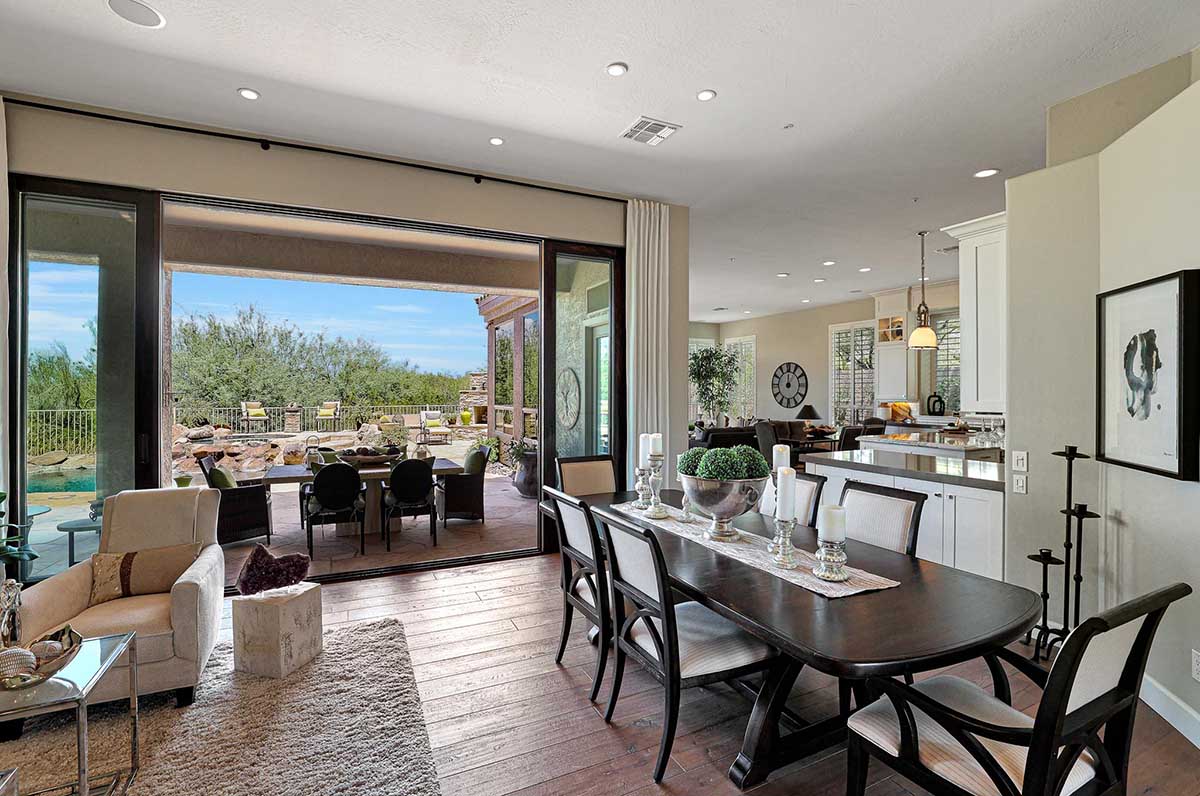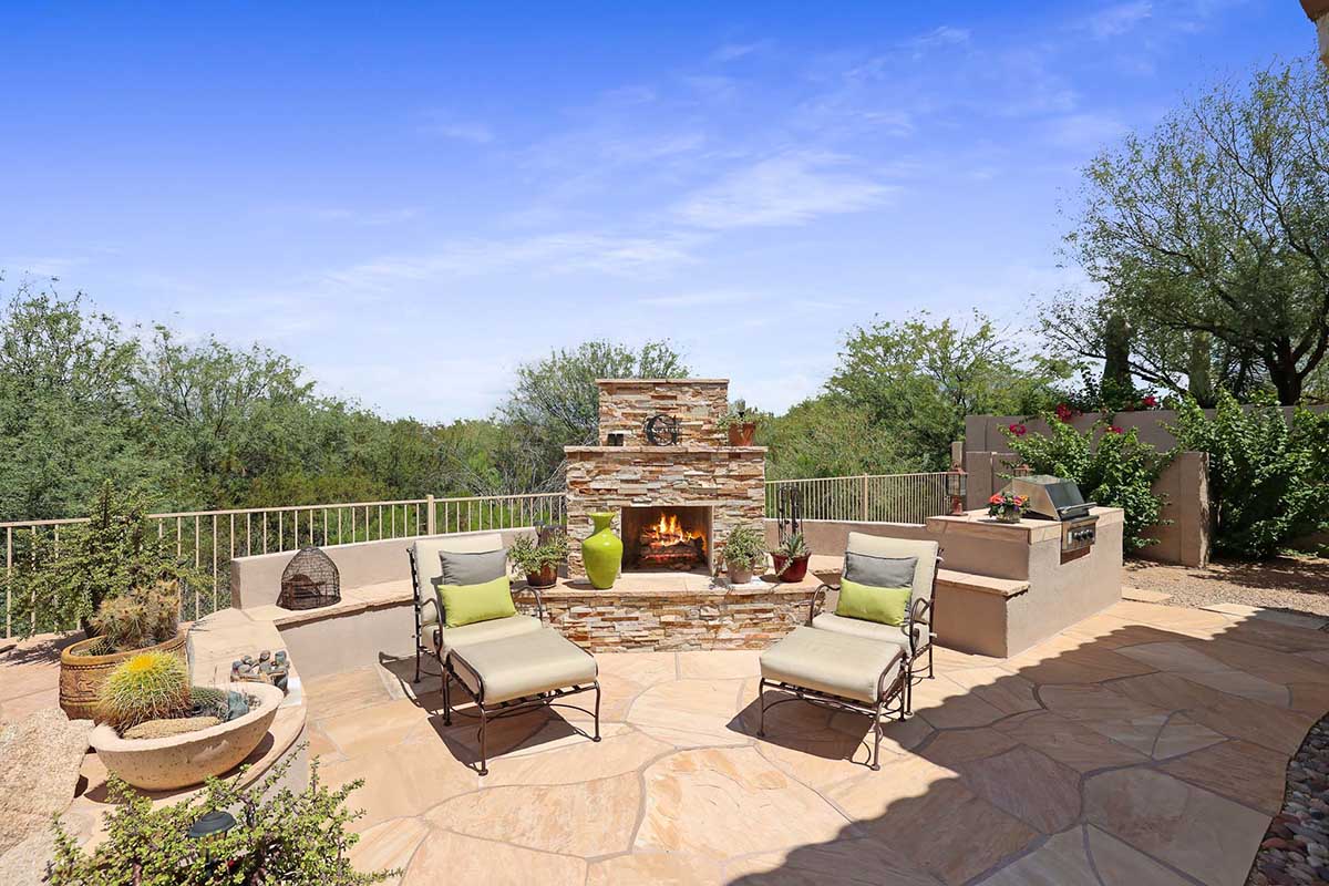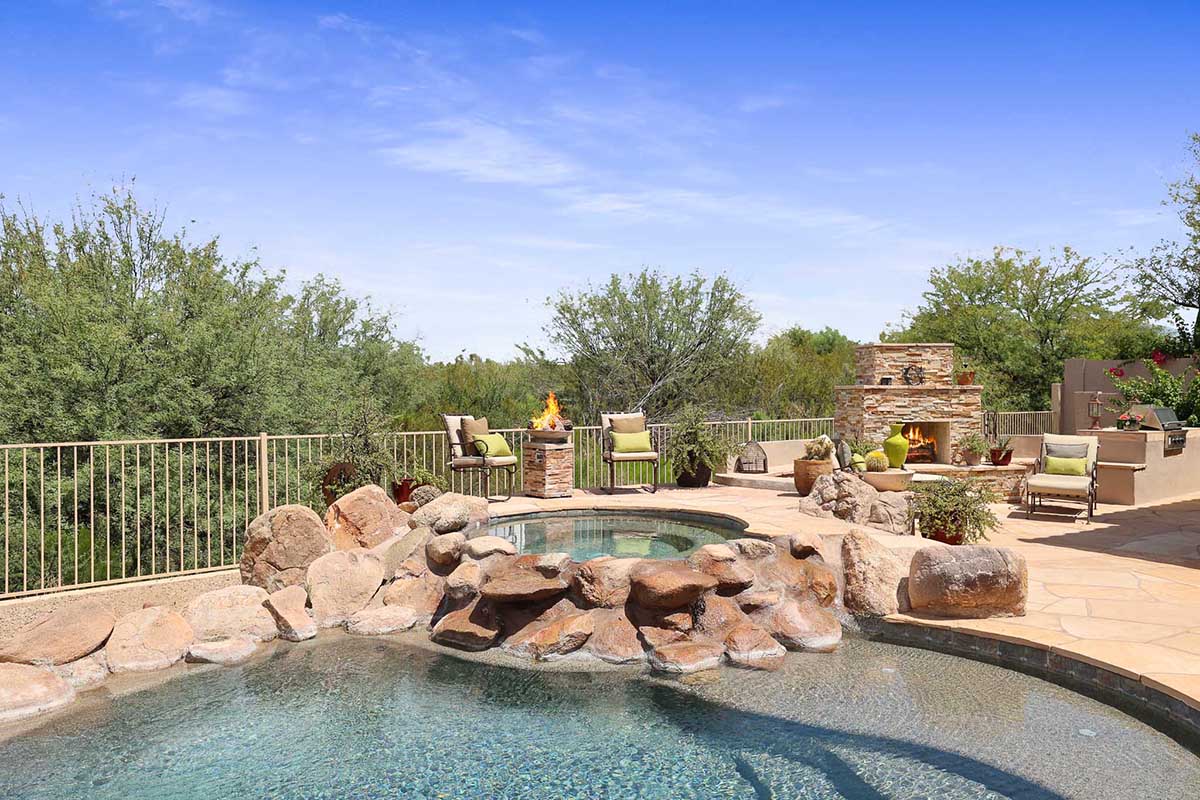The numerous windows and doors in the great room allow for natural light and overlook the resort style backyard with beautiful views of Pinnacle Peak, boulder outcroppings and famous Arizona sunsets. The backyard includes a heated pebbletec pool and spa, boulder and rock waterfall accents, easy care landscaping, flagstone hardscape, large covered patio, stacked stone gas fireplace, and built-in barbecue. The lot backs and sides to the natural area open space for additional privacy with desirable North/South exposure.