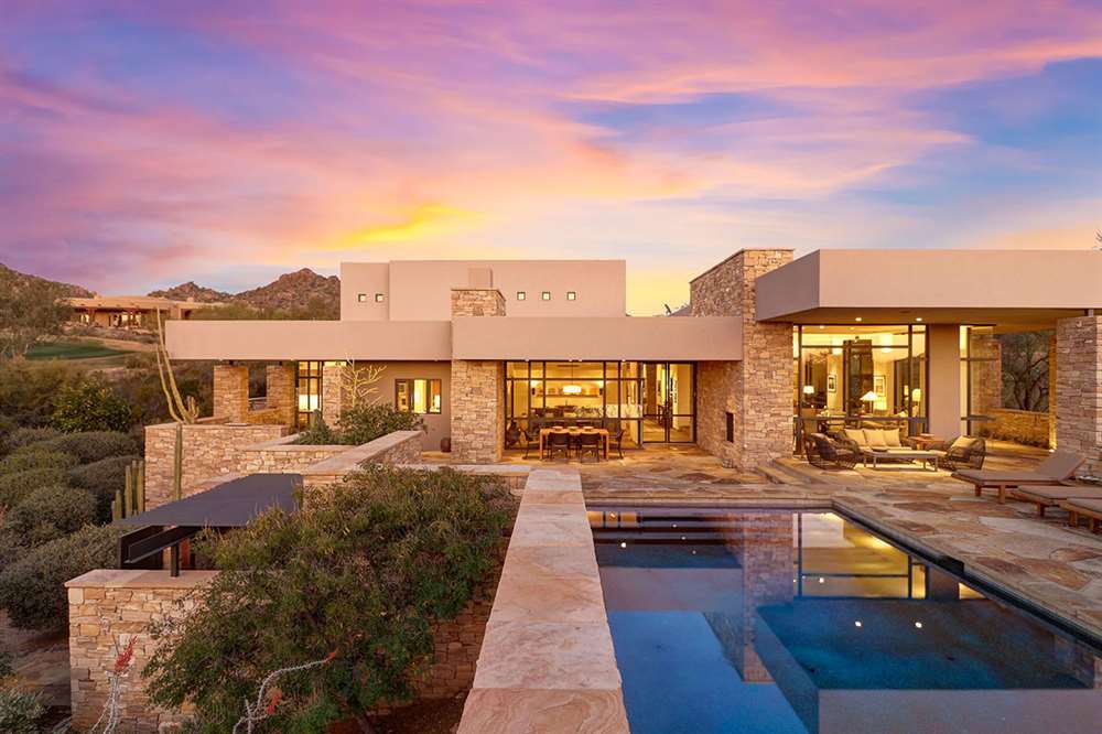 Timeless architecture and design grace this desert contemporary styled home with beautiful organic elements throughout. This masterpiece is located in the prestigious guard-gated community of Glenn Moor at Troon Village, home to the back nine of Troon Country Club’s private course. Featured in Phoenix Home and Garden Masters of the Southwest issue, the home was designed by renowned architect Hugh Knoell (Knoell Quidort Architects) and offers design elements that embrace the desert setting allowing for seamless living inside and out including steel and glass doors, flagstone flooring throughout, high ceilings, locally sourced stacked stone walls and clean lines.