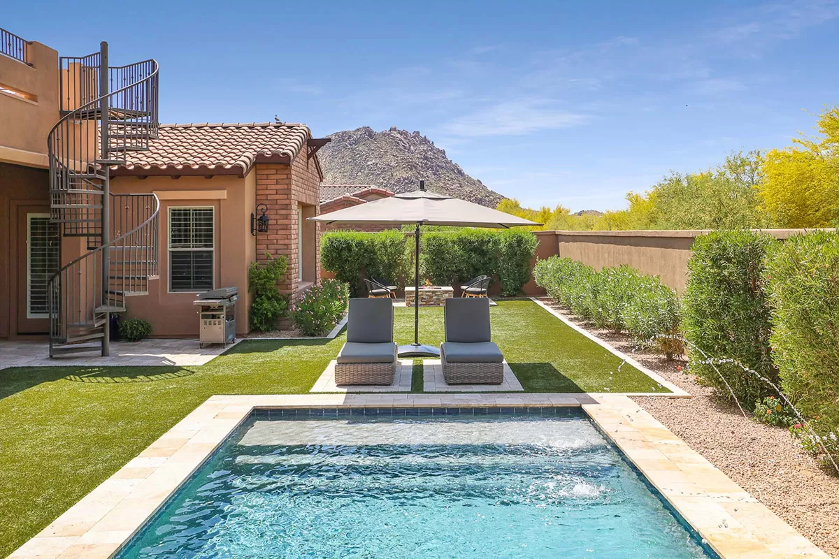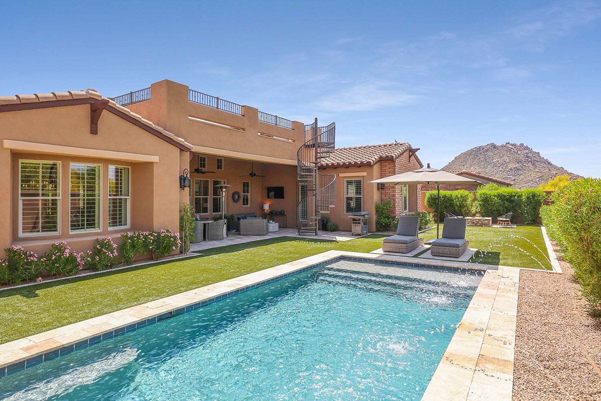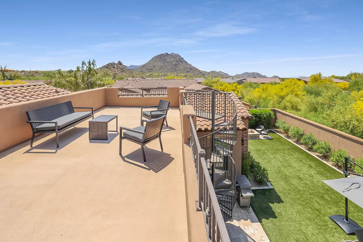 The backyard showcases a refreshing salt water pool with water fountain feature, mature, flowering landscape, artificial turf for easy care, large covered patio, fire pit with seating, and a view deck accessed by the spiral staircase to enjoy 360 degree views including Troon Mountain, Pinnacle Peak and Arizona sunsets. The kitchen has a stainless steel appliances package including a 5-burner gas cooktop, wall oven, dishwasher, built-in microwave, and side by side fridge/freezer, large pantry, richly stained cabinetry, center island with seating, and granite counters, all adjacent to the dining room with exterior access for seamless entertaining.