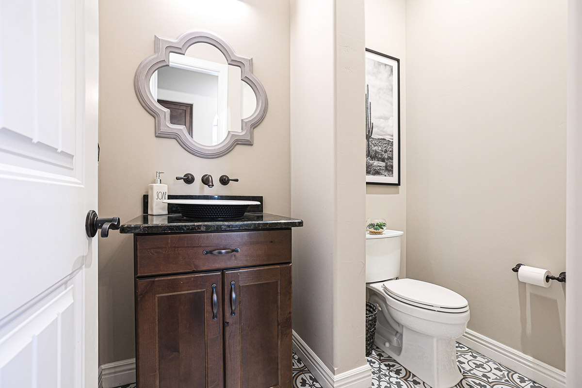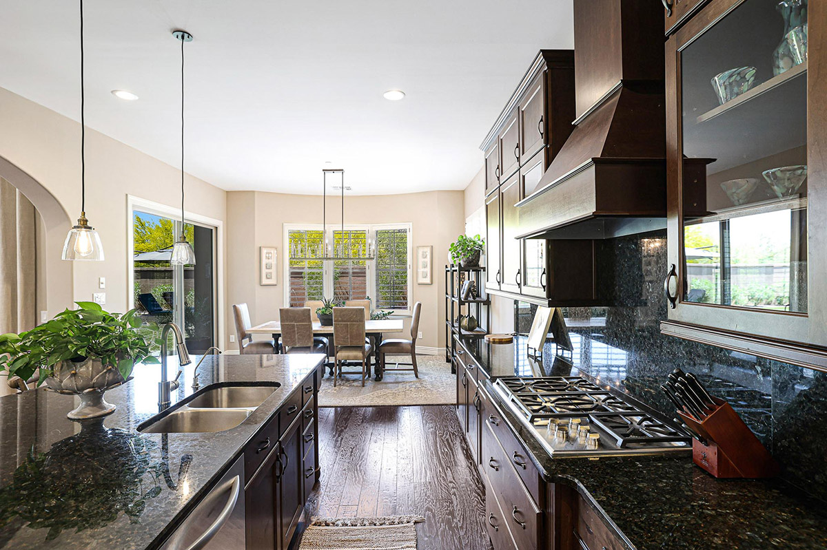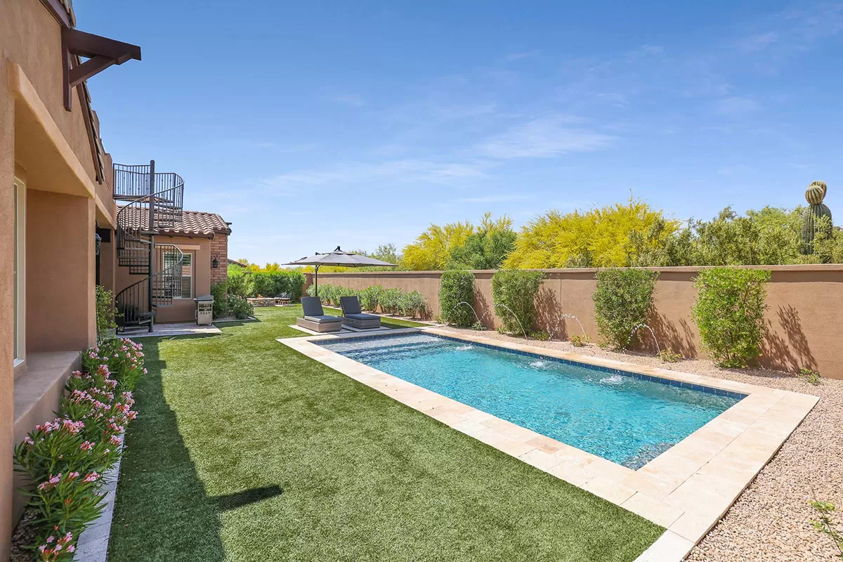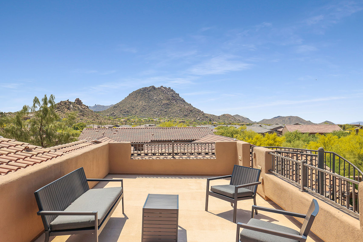 The backyard showcases a refreshing salt water pool with water fountain feature, mature, flowering landscape, artificial turf for easy care, large covered patio, fire pit with seating, and a view deck accessed by the spiral staircase to enjoy 360 degree views including Troon Mountain, Pinnacle Peak and Arizona sunsets. The kitchen has a stainless steel appliances package including a 5-burner gas cooktop, wall oven, dishwasher, built-in microwave, and side by side fridge/freezer, large pantry, richly stained cabinetry, center island with seating, and granite counters, all adjacent to the dining room with exterior access for seamless entertaining.