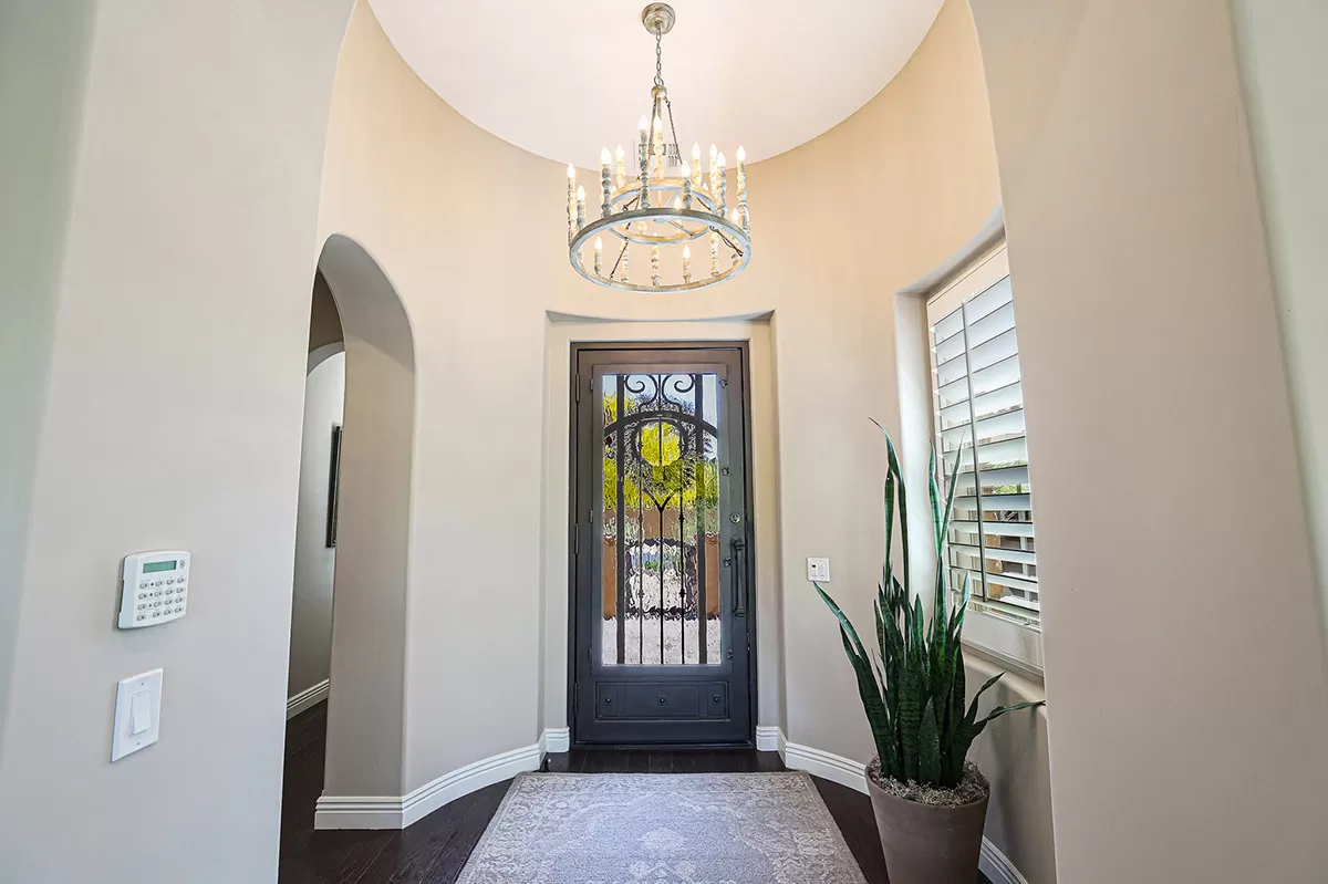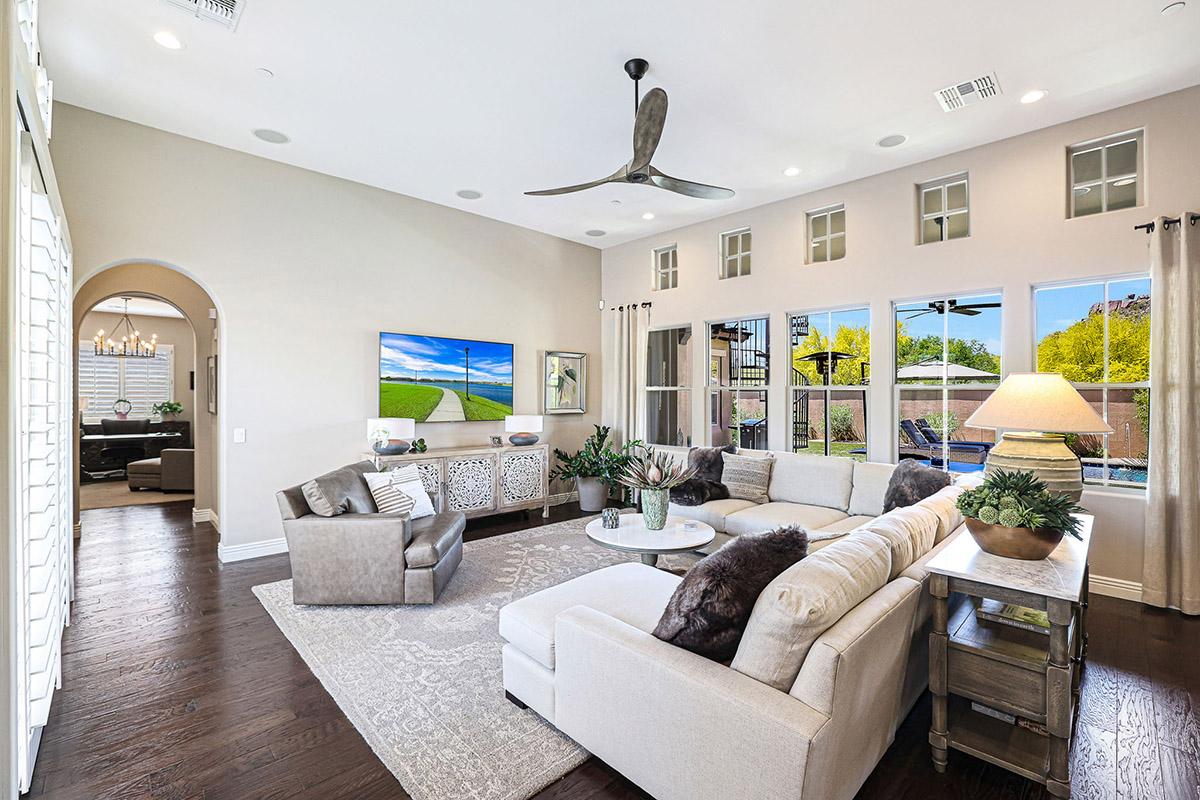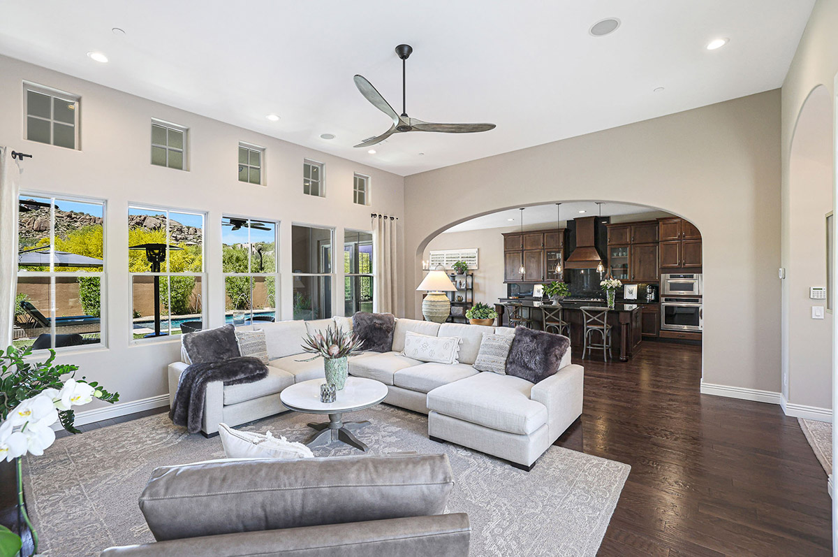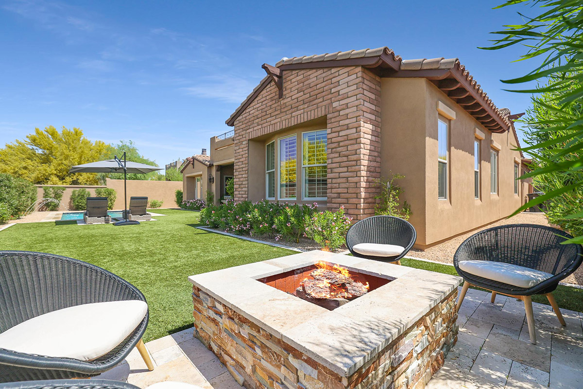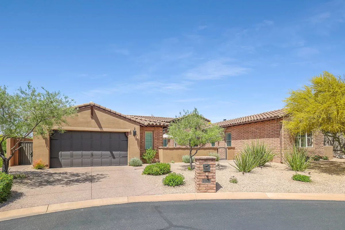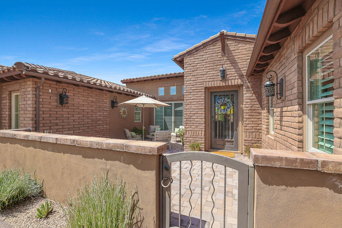 Located in the private gated community of Quisana in North Scottsdale, this completely turn-key home is move-in ready (all furnishings and accessories included, both interior and exterior)! Meticulously maintained and stunningly decorated this 2014 Standard Pacific built home features just over 2,800 square feet of open floor plan living with beautiful natural light throughout! The gated entry courtyard sets the tone with brick pavers and an intimate seating area for additional outdoor living. Upon entry, take note of the clerestory windows and views of the resort like backyard and local boulder outcroppings.