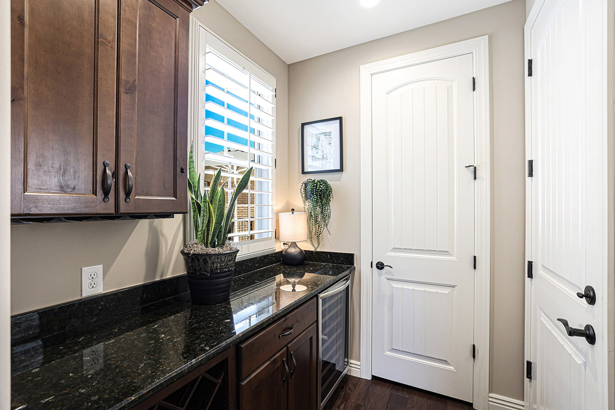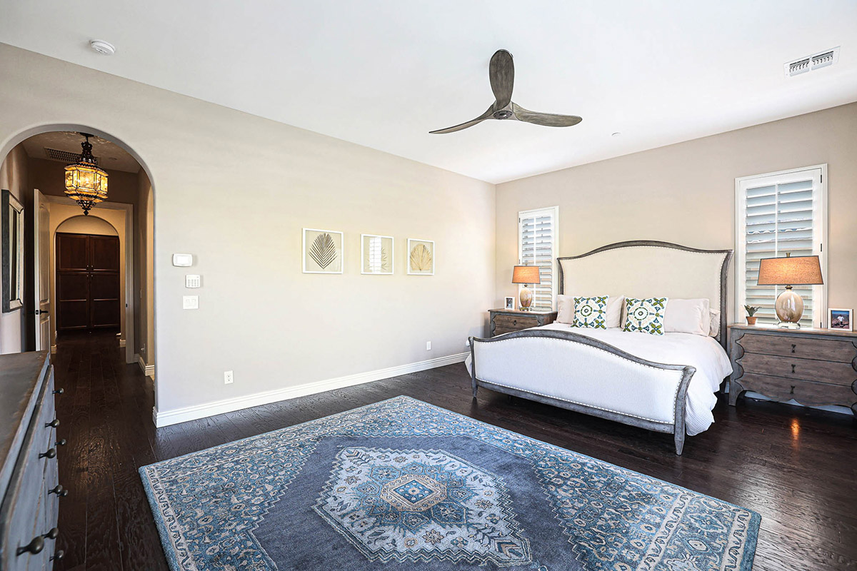 With three bedrooms, a private den/office, and two and half baths enjoy the split floor plan living. The master bedroom has exterior access and an ensuite bath with separate shower and soaking tub, large closet with built-in cabinet storage, private water closet, and dual vanities. Other features include: HOA maintained front yard; real wood flooring; two car garage with storage; plantation shutters; upgraded fans and light fixtures; surround sound system; garage entry room with wine fridge and touch down area; and so much more!