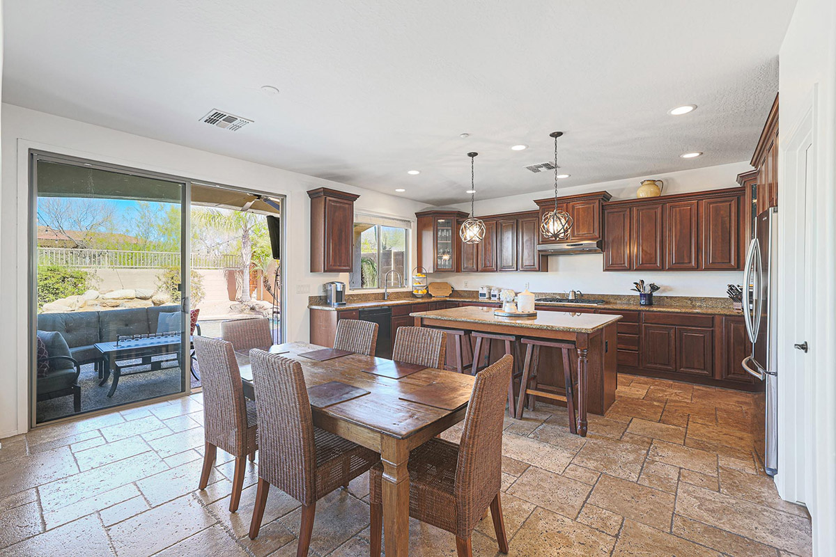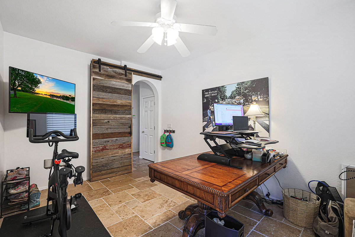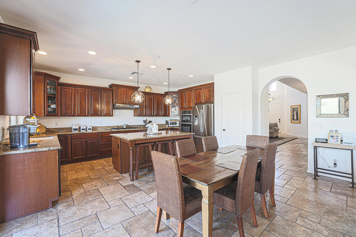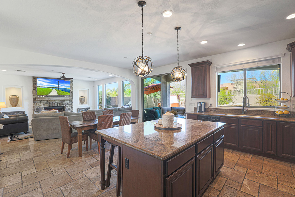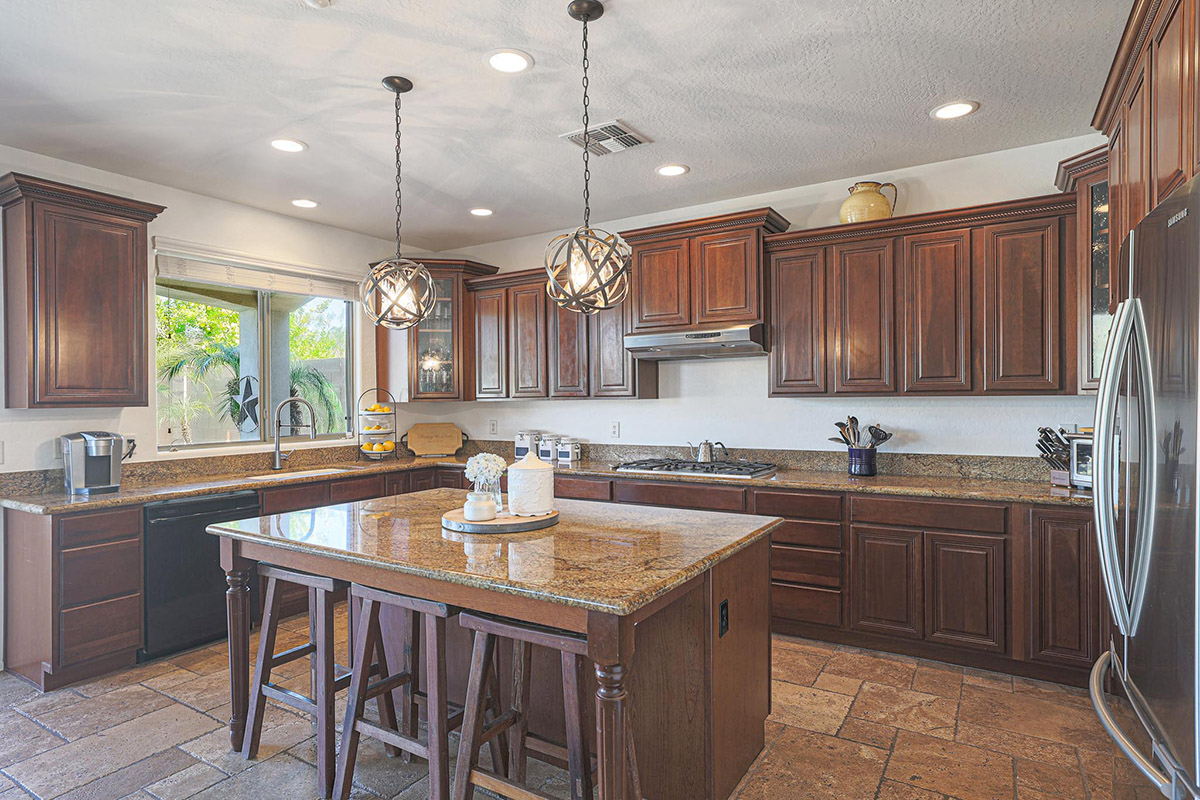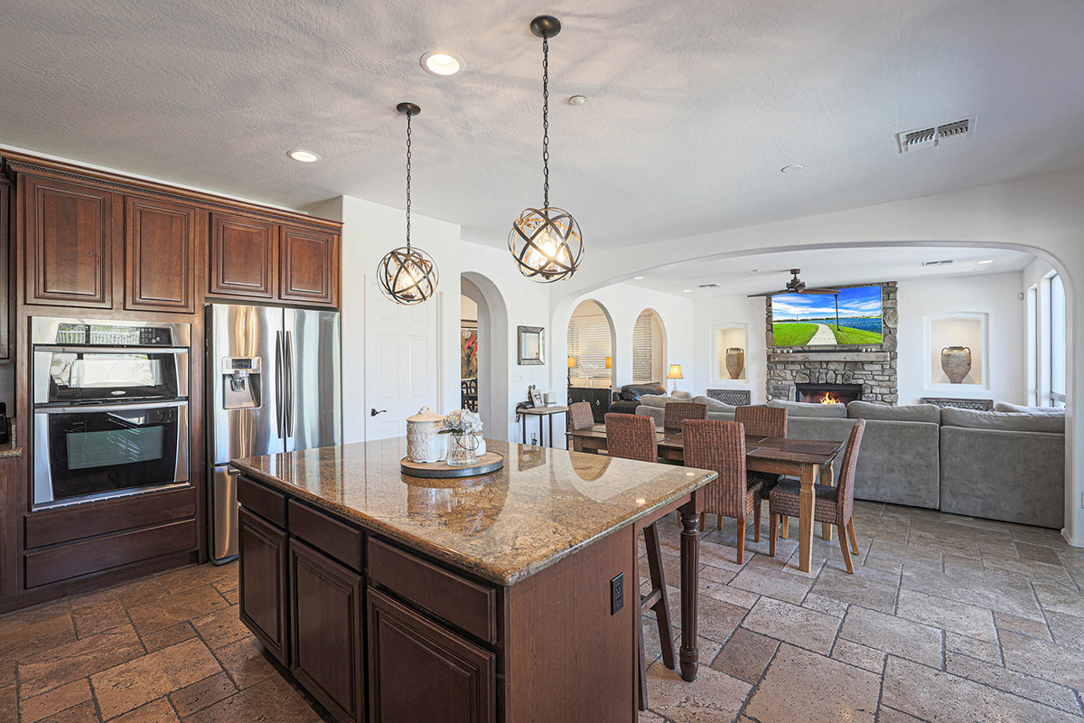 The chef inspired kitchen has a gas cooktop, beautifully stained cabinetry, center island with seating, granite counters, pendant lighting, seeded glass front corner display cabinets, a window overlooking the rear yard, breakfast area large enough for a full-sized table and a arched entry opening the family room to the kitchen. The family room is also open to the formal dining with large picture windows to the backyard and a stacked stone fireplace with mantle and side art niches. Other rooms downstairs include a full sized office with exterior access and a custom barn door, large living room and a powder bath.