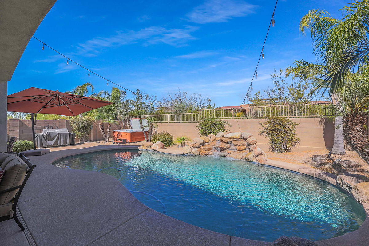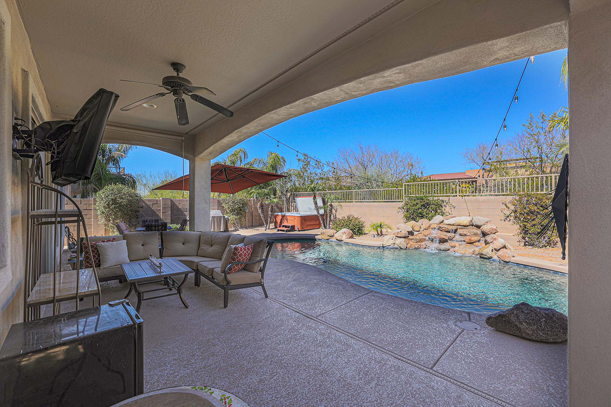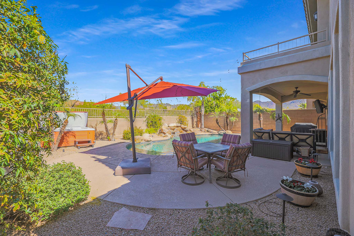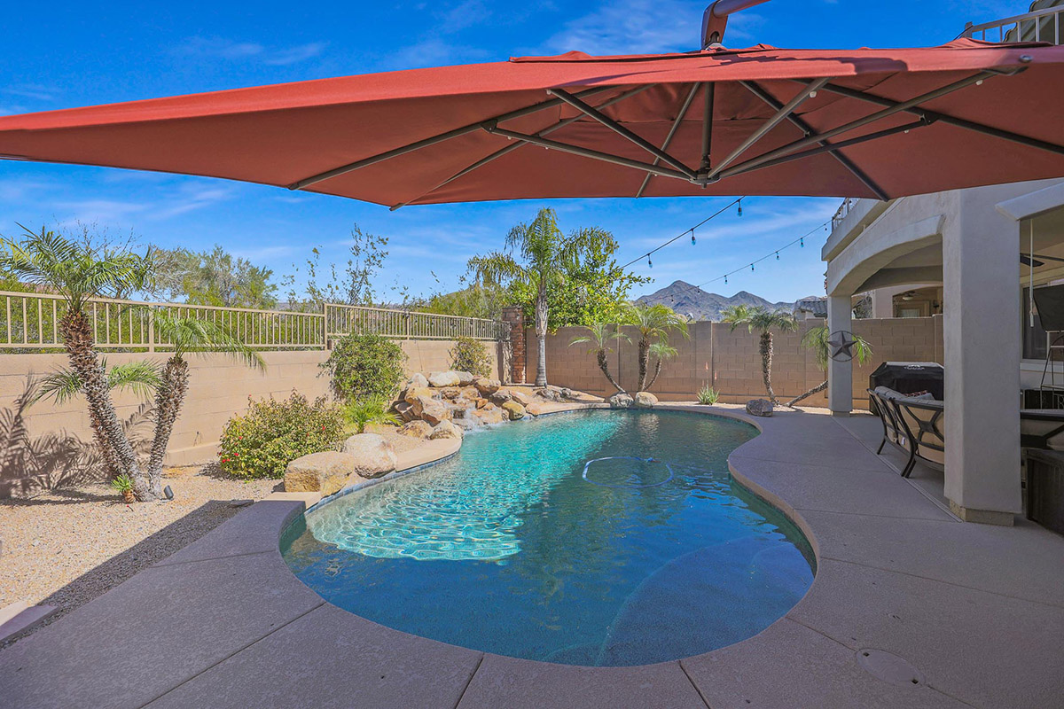 Wonderfully elegant home located in a prime Scottsdale neighborhood of gated Trails North at Horseman’s Park. Enjoy McDowell Mountain views from the resort style backyard featuring a sparkling pool with rock waterfall, hot tub, mature landscaping including palm trees, covered patio for dining and deck area for lounging all backing to a desert wash for a private feel.